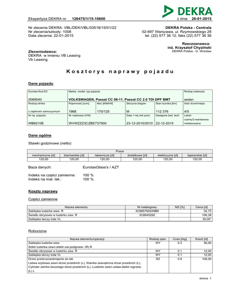 Ekspertyza DEKRA nr 126475/1/15-10600 z dnia Nr zlecenia DEKRA: VBL/DEK/VBL/03518/15/01/22 Nr zlecenia/szkody: 1008 Data zlecenia: 22-01-2015 26-01-2015 DEKRA Polska - Centrala 02-697 Warszawa, ul. Rzymowskiego 28 tel. (22) 577 36 12, faks (22) 577 36 36 Rzeczoznawca: inż. Krzysztof Chyziński DEKRA Polska - O. Wrocław Zleceniodawca: DEKRA w imieniu VB Leasing Vb Leasing Kosztorys naprawy pojazdu Dane pojazdu Eurotax-Kod EC Marka, model, typ pojazdu Rodzaj nadwozia 0089040 VOLKSWAGEN, Passat CC 08-11, Passat CC 2.0 TDI DPF BMT sedan Rodzaj silnika Pojemność [ccm] Moc [KM/kW] Skrzynia biegów Stan licznika [km] Ilość drzwi/miejsc z zapłonem samoczynnym 1968 170/125 M 112 376 4/5 Nr rej. pojazdu Nr nadwozia (VIN) Data 1-rej./rok prod. Następne bad. tech. Lakier WB8210E WVWZZZ3CZBE737500 23-12-2010/2010 22-12-2015 czarny/2-warstwowa metalizowana Dane ogólne Stawki godzinowe (netto) Prace mechaniczne [zł] 120,00 blacharskie [zł] 120,00 lakiernicze [zł] 120,00 Baza danych: EurotaxGlass's / AZT Indeks na części zamienne: Indeks na mat. lak.: 100 % 100 % dodatkowe [zł] 120,00 elektryczne [zł] 120,00 tapicerskie [zł] 120,00 Koszty naprawy Części zamienne Nazwa elementu Zaślepka lusterka wew. R Światło obrysowe w lusterku zew. R Zaślepka tarczy koła VL Nr katalogowy 3C8857602A9B9 3C8945292 NS [%] Cena [zł] 34,72 106,38 30,00* Rodzaj oper. WY Czas [rbg] 0.3 Koszt [zł] 36,00 WY WY RZ 0.1 0.1 0.9 Robocizna Nazwa elementu/operacji Zaślepka lusterka wew. Szkło lusterka zewn.elektr.ust.podgrzew. (R) R Światło obrysowe w lusterku zew. R Zaślepka tarczy koła VL Drzwi przód-przezbrojenie do lak. Listwa szybowa zewn.drzwi przednich (L), Klamka zewnętrzna drzwi przednich (L), Cylinder zamka bocznego drzwi przednich (L), Lusterko zewn.ustaw.elektr./ogrzew. (L) L 12,00 12,00 108,00 strona 1 Ekspertyza DEKRA nr 126475/1/15-10600 z dnia Drzwi tył-przezbrojenie do lak. Listwa szybowa zewn.drzwi tylnych (L), Klamka zewnętrzna drzwi tylnych (L) L Zderzak tył-przezbrojenie do lak. Okładzina zderzaka tylnego, Spojler zderzaka tylnego, Listwa ochronna, Listwa ochronna boczna (L), Listwa ochronna boczna (R), Oświetlenie tabl.rej. (L), Oświetlenie tabl.rej. (R), Światło odblaskowe (L), Światło odblaskowe (R) Drzwi przednie (nieuzbrojone) L Drzwi tylne (nieuzbrojone) L Okładzina zderzaka tylnego 26-01-2015 RZ 0.5 60,00 RZ 1.4 168,00 NA NA NA 0.1 0.1 0.3 12,00 12,00 36,00 Lakierowanie Nazwa elementu/operacji Drzwi przednie, kompletne F L Drzwi tylne kompletne F L Zderzak tylny, kompletny k/e Przygotowanie blacha (tylko zdemontowane elem.) Przygot.tworzyw(Praca dodatkowa) Stopień III III K3 Czas [rbg] 1.6 1.4 1.6 1.1 0.8 Materiał [zł] 214,90 180,00 360,50 93,00 47,70 Razem [zł] 406,90 348,00 552,50 225,00 143,70 Czas [rbg] Koszt [zł] 171,10 456,00 780,00 Normalia [zł] 3,42 Razem [zł] 174,52 456,00 1 676,10 2 306,62 530,52 2 837,14 Kalkulacja końcowa Rodzaj kosztów Części zamienne Robocizna Lakierowanie Koszt naprawy (netto) VAT (23%) Koszt naprawy (brutto) 3.8 6.5 896,10 Opis uszkodzeń Nazwa elementu Zaślepka lusterka wew. R Światło obrysowe w lusterku zew. R Zaślepka tarczy koła VL Drzwi przednie (nieuzbrojone) L Drzwi tylne (nieuzbrojone) L Okładzina zderzaka tylnego Nr katalogowy 3C8857602A9B9 3C8945292 Rodzaj oper. WY WY Opis uszkodzeń zarysowanie, głębokie ubytki materiału 3C8831055F WY NA brak odpryski lakieru, głębokie, na krawędzi, ślady korozji 3C8833055D 3C8807421EGRU NA NA odpryski lakieru, głębokie, na krawędzi, ślady korozji wgniecenie, łagodne, środek, zarysowanie, liczne Uwagi odnośnie przeprowadzonych napraw blacharsko-lakierniczych Nazwa elementu Błotnik przedni L Błotnik przedni R Nr katalogowy 3C8821021 3C8821022 gr. pow. lak. [um] 160 1080 Opis uszkodzeń pomiar grubości lakieru pomiar grubości lakieru WY - wymiana, NA - naprawa, TS - naprawa (uszk. średnie), TM - naprawa (uszk.mocne), SP - sprawdzenie, R - regulacja, P - pomiar, KD - dodatkowe koszty, W - wyważenie, RZ - wy-/zamontowanie, NS - amortyzacja %, L - lakierowanie >> I - część nowa, II - wierzchnie, III - po naprawie do 50%, IV - po naprawie pow 50%, K1R - tworzywa szt części nowe, K1N - tworzywa szt części nowe, K1G - tworzywa szt części nowe, K2 - tworzywa szt wierzchnie, K3 - tworzywa szt po naprawie Uwaga: EurotaxGlass's nie gwarantuje prawidłowego zamówienia części zamiennych na podstawie zamieszczonych w programie numerów producenta. strona 2