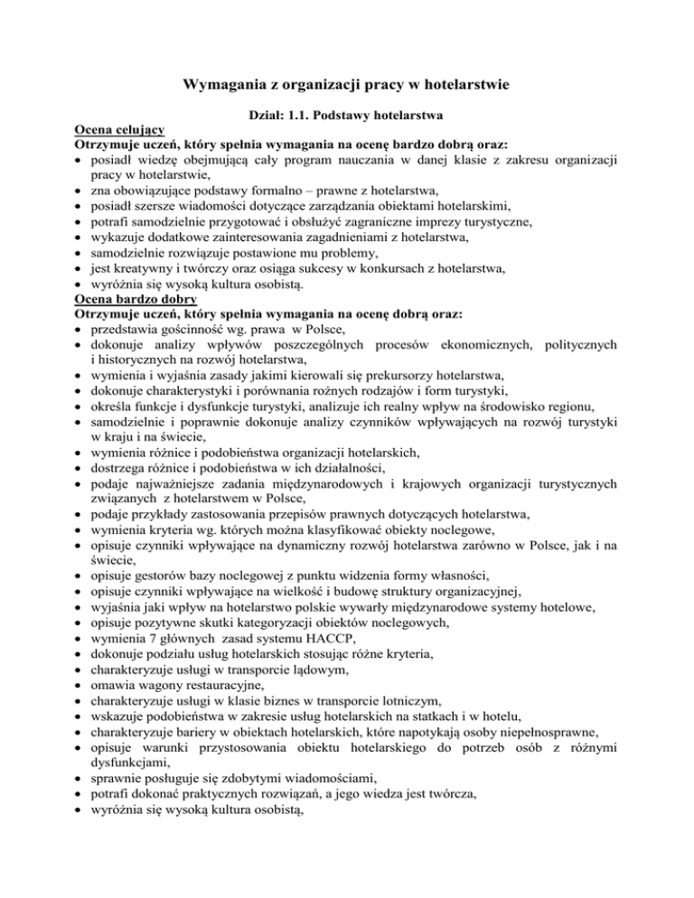 Wymagania z organizacji pracy w hotelarstwie Dział: 1.1. Podstawy hotelarstwa Ocena celujący Otrzymuje uczeń, który spełnia wymagania na ocenę bardzo dobrą oraz: posiadł wiedzę obejmującą cały program nauczania w danej klasie z zakresu organizacji pracy w hotelarstwie, zna obowiązujące podstawy formalno – prawne z hotelarstwa, posiadł szersze wiadomości dotyczące zarządzania obiektami hotelarskimi, potrafi samodzielnie przygotować i obsłużyć zagraniczne imprezy turystyczne, wykazuje dodatkowe zainteresowania zagadnieniami z hotelarstwa, samodzielnie rozwiązuje postawione mu problemy, jest kreatywny i twórczy oraz osiąga sukcesy w konkursach z hotelarstwa, wyróżnia się wysoką kultura osobistą. Ocena bardzo dobry Otrzymuje uczeń, który spełnia wymagania na ocenę dobrą oraz: przedstawia gościnność wg. prawa w Polsce, dokonuje analizy wpływów poszczególnych procesów ekonomicznych, politycznych i historycznych na rozwój hotelarstwa, wymienia i wyjaśnia zasady jakimi kierowali się prekursorzy hotelarstwa, dokonuje charakterystyki i porównania rożnych rodzajów i form turystyki, określa funkcje i dysfunkcje turystyki, analizuje ich realny wpływ na środowisko regionu, samodzielnie i poprawnie dokonuje analizy czynników wpływających na rozwój turystyki w kraju i na świecie, wymienia różnice i podobieństwa organizacji hotelarskich, dostrzega różnice i podobieństwa w ich działalności, podaje najważniejsze zadania międzynarodowych i krajowych organizacji turystycznych związanych z hotelarstwem w Polsce, podaje przykłady zastosowania przepisów prawnych dotyczących hotelarstwa, wymienia kryteria wg. których można klasyfikować obiekty noclegowe, opisuje czynniki wpływające na dynamiczny rozwój hotelarstwa zarówno w Polsce, jak i na świecie, opisuje gestorów bazy noclegowej z punktu widzenia formy własności, opisuje czynniki wpływające na wielkość i budowę struktury organizacyjnej, wyjaśnia jaki wpływ na hotelarstwo polskie wywarły międzynarodowe systemy hotelowe, opisuje pozytywne skutki kategoryzacji obiektów noclegowych, wymienia 7 głównych zasad systemu HACCP, dokonuje podziału usług hotelarskich stosując różne kryteria, charakteryzuje usługi w transporcie lądowym, omawia wagony restauracyjne, charakteryzuje usługi w klasie biznes w transporcie lotniczym, wskazuje podobieństwa w zakresie usług hotelarskich na statkach i w hotelu, charakteryzuje bariery w obiektach hotelarskich, które napotykają osoby niepełnosprawne, opisuje warunki przystosowania obiektu hotelarskiego do potrzeb osób z różnymi dysfunkcjami, sprawnie posługuje się zdobytymi wiadomościami, potrafi dokonać praktycznych rozwiązań, a jego wiedza jest twórcza, wyróżnia się wysoką kultura osobistą, sprawnie posługuje się zdobytymi wiadomościami i potrafi dokonać praktycznych rozwiązań, a jego wiedza jest twórcza, wyróżnia się wysoką kultura osobistą, Ocena dobry Otrzymuje uczeń, który spełnia wymagania na ocenę dostateczną oraz: wyjaśnia, co odróżnia obiekty hotelarskie od innych obiektów świadczących usługę noclegową rozróżnia obiekty noclegowe i dopasowuje je do poszczególnych okresów historycznych charakteryzuje prekursorów hotelarstwa analizuje różnice w pojęciach: turysta - odwiedzający jednodniowy, odwiedzający – podróżny; umie zobrazować zależności pomiędzy formami i kategoriami turystyki z pomocą nauczyciela lub w grupie określa podstawowe funkcje i dysfunkcje turystyki potrafi scharakteryzować wybrane rodzaje turystyki potrafi zdefiniować słabe i mocne strony turystyki wyjaśnia, jakie są cele działania organizacji wymienia główne zadania światowych organizacji hotelarskich podaje definicje organizacji międzynarodowych wymienia i opisuje najważniejsze akty prawne dotyczące działalności hotelarskiej w Polsce wymienia czynniki warunkujące rozwój hotelarstwa w Polsce wymienia czynniki wpływające na dynamiczny rozwój hotelarstwa zarówno w Polsce, jak i na świecie omawia rys historyczny gestorów bazy noclegowej w Polsce opisują komórki występujące w strukturze organizacyjnej hotelu charakteryzuje wiodące systemy i łańcuchy hotelowe wyjaśnia w jakim celu nadaje się obiektom hotelarskim kategorię zna minimalne wymagania kategoryzacyjne określane dla zakładów hotelarskich charakteryzuje kryteria i wskaźniki jakości omawia skrót HACCP wymienia cechy usług hotelarskich opisuje usługi hotelarskie opisuje wagony sypialne charakteryzuje usługi w klasie ekonomicznej w transporcie lotniczym wymienia główne zakresy działalności hotelarskiej na statkach zna kryteria dostępności obiektu hotelarskiego dla osób niepełnosprawnych potrafi poprawnie wykorzystywać zdobyte wiadomości i rozwiązywać typowe problemy teoretyczne i praktyczne z zakresu organizacji pracy w hotelarstwie, wyróżnia się wysoką kultura osobistą, Ocena dostateczny Otrzymuje uczeń, który spełnia wymagania na ocenę dopuszczającą oraz: wymienia elementy, które mają istotny wpływ na model gościnności wymienia cechy hotelarstwa w poszczególnych okresach w Polsce i na świecie wymienia prekursorów hotelarstwa definiuje formy i kategorie turystyki potrafi wymienić wszystkie rodzaje turystyki potrafi wymienić słabe i mocne strony turystyki przedstawia historię organizacji hotelarskich wyjaśnia dlaczego powstały organizacje zajmujące się hotelarstwem podaje pełne nazwy międzynarodowych i krajowych organizacji turystycznych związanych z hotelarstwem w Polsce wymienia, jakie podstawowe sprawy dotyczące działalności hotelarskiej reguluje ustawa definiuje poszczególne obiekty noclegowe wymienia inne obiekty nie objęte klasyfikacją i kategoryzacją wyjaśnia jak hotelarstwo wpływa na rozwój gospodarczy państwa określa możliwości rozwoju hotelarstwa w Polsce i na świecie wymienia istniejących w Polsce gestorów bazy noclegowej wymienia jak