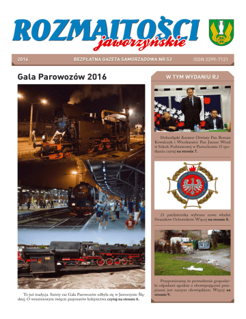 2016 BEZPŁATNA GAZETA SAMORZĄDOWA NR 53 Gala Parowozów 2016 ISSN 2299-7121 W TYM WYDANIU RJ Dolnośląski Kurator Oświaty Pan Roman Kowalczyk i Wicekurator Pan Janusz Wrzal w Szkole Podstawowej w Pastuchowie. O spotkaniu czytaj na stronie 7. 21 października wybrano nowe władze Strażaków Ochotników. Więcej na stronie 8. To już tradycja. Szósty raz Gala Parowozów odbyła się w Jaworzynie Śląskiej. O wrześniowym święcie pasjonatów kolejnictwa czytaj na stronie 6. Przypominamy, że prowadzenie gospodarki odpadami zgodnie z obowiązującymi przepisami jest naszym obowiązkiem. Więcej na stronie 9. 2 Z życia gminy Biesiada z okazji Dnia Seniora 17 września 2016 r. z okazji Jaworzyńskich Dni Seniora, których pomysłodawcą jest Związek Emerytów, Rencistów i Inwalidów w Jaworzynie Śląskiej, odbyła się Biesiada Folklorystyczna. Sobotnie biesiadowanie rozpoczęli swoim występem gospodarze spotkania czyli „Jaworzynianie”, na których zaproszenie przybyło do Jaworzyny Śląskiej pięć zespołów ludo- wych z naszego regionu. W sali konferencyjnej na Stadionie Miejskim wystąpili również: „Goczałkowianie” z Goczałkowa, Zespół Ludowy „Cicha Woda” z Udanina, Zespół Śpiewaczy „Uciecho-Wianki” z Uciechowa, „Krukowianie” z Krukowa, a także Zespół wo k a l n o - mu z yc z ny „Retro” ze Strzegomia. Zarówno artystom, jak i przybyłym widzom, czas upłynął w przyja- znej i bardzo serdecznej atmosferze, której towarzyszyło wspólne śpiewanie dobrze znanych, ludowych piosenek. Zespoły z rąk Burmistrza Jaworzyny Śląskiej Grzegorza Grzegorzewicza oraz Prz ewodniczącego Rady Powiatu Krzysztofa Sołtysa, odebrały podziękowania i upominki przygotowane przez Samorządowy Ośrodek Kultury i Bibliotekę Publiczną oraz > Kultura ludowa łączy pokolenia Urząd Miejski w Jaworzynie Śląskiej. Po części artystycznej odbyła się także zabawa taneczna dla seniorów, która potrwała do późnych godzin wieczornych. Jaworznianie na fali Zespół „Jaworzynianie” na falach radiowych, bowiem dołączył do „Listy Ludowych Przebojów” Radia Wrocław i bierze udział w plebiscycie organizowanym przez Radio Wrocław. To m.in. efekt udanego występu zespołu podczas Międzynarodowego Festiwalu Folkloru, który latem odbył się w Strzegomiu. W konkursie radiowym „Jaworzynianie” walczą o nagrodę, jaką jest bezpłatna sesja nagraniowa w Studiu Radia Wrocław oraz wydanie płyty CD. Wszystko jednak zależy od ilości nadesłanych przez słuchaczy głosów. Aby zagłosować na „Jaworzynian” wystarczy wysłać sms pod numer 72280 w jego treści wpisując RW KAPELA JAWORZYNIANIE (koszt wiadomości wynosi 2,49 zł). Zachęcamy wszystkich mieszkańców gminy Jaworzyna Śląska do głosowania na „Jaworzynian”, a także do słuchania audycji w Radiu Wrocław emitowanej w każdą niedzielę w godzinach 7.00-10.00. Mogiłę pradziada ocal od zapomnienia – podsumowanie akcji 10 października w Urzędzie Wojewódzkim we Wrocławiu odbyła się uroczystość podsumowująca tegoroczną edycję akcji „Mogiłę pradziada ocal od zapomnienia”. Za- proszeni na nią zostali ci, którzy w szczególny sposób przyczyniają się do ratowania polskich cmentarzy na Ukrainie oraz niosą pomoc Polakom żyjącym na Kresach. > Przedstawiciele gminy odebrali podziękowania Wśród zaproszonych osób znaleźli się przedstawiciele z Jaworzyny Śląskiej: Burmistrz Pan Grzegorz Grzegorzewicz, Dyrektor Gimnazjum Pan Krzysztof Sołtys, Wiceprzewodniczący Rady Miejskiej Pan Ireneusz Besser oraz koordynatorzy akcji- Anna Ryś i Wiesław Dybeł. Osobom zaangażowanym w tę szczytną inicjatywę podziękowania złożyli: Wojewoda Dolnośląski Pan Paweł Hreniak, Marszałek Województwa Dolnośląskiego Pan Cezary Przybylski, Członek Zarządu Województwa Pan Tadeusz Samborski, Dolnośląski Kurator Oświaty Pan Roman Kowalczyk oraz przedstawiciel Ministerstwa Spraw Zagranicznych. Jaworzyńscy wolontariusze już 5 razy wyjeżdżali na Ukrainę. Ocalili od zapomnienia blisko 300 mogił rodaków znajdujących się na 6 zdewastowanych i zapomnianych polskich cmentarzach. W najbliższych dniach rozpoczną się przygotowania do kolejnego wyjazdu. Warto pod- Rozmaitości Jaworzyńskie - BEZPŁATNA GAZETA SAMORZĄDOWA NR 53 (2016 r.) kreślić, że w realizację tego przedsięwzięcia włączeni są nie tylko uczniowie wyjeżdzający w trakcie wakacji do pracy na Kresach, ale również wielu mieszkańców naszej gminy wspierających inicjatywę datkami na ten cel. To również do nich adresowane były słowa wdzięczności, jakie wybrzmiały na spotkaniu. Akcja „Mogiłę pradziada ocal od zapomnienia” z roku na rok staje się coraz bardziej rozpoznawalnym znakiem firmowym naszego województwa. Jesteśmy dumni, że bierzemy udział w tym pięknym przedsięwzięciu. 3 Z życia gminy Odwiedziny przyjaciół z Pfeffenhausen Gimnazjum nr 1 w Jaworzynie Śl. gościło grupę dwudziestu uczniów wraz z opiekunami ze szkoły partnerskiej w Pfeffenhausen, w Niemczech. Dyrekcja i nauczyciele przygotowali na tę okazję interesujący program wymiany, w którą aktywnie włączyli się uczniowie jaworzyńskiego gimnazjum. Dwunastu uczniów z Bawarii przyjęły polskie rodziny, a pozostali nocowali wraz ze swoimi opiekunami w Schronisku Młodzieżowym w Świdnicy. Podczas wymiany partnerskiej mieli oni okazję poznać kulturę naszego kraju, zwyczaje panujące w polskich domach, a także zwiedzić najpiękniejsze i najciekawsze miejsca naszego regionu. W drugim dniu pobytu uczestnicy wymiany poznali proces produkcyjny w Fabry- ce Porcelany Stołowej „Karolina”, jak również odwiedzili Muzeum Kolejnictwa i Techniki w Jaworzynie Śl. Odbyli również spotkanie z przedstawicielami władz miasta i poznali bliżej naszą gminę. Kolejnym punktem również bardzo ciekawa wycieczka do Wrocławia – Europejskiej Stolicy Kultury 2016. Uczestników zachwyciły nowoczesn