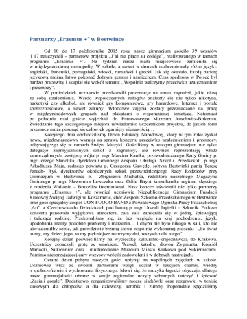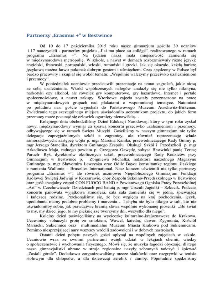 Partnerzy „Erasmus +” w Bestwince Od 10 do 17 października 2015 roku nasze gimnazjum gościło 39 uczniów i 17 nauczycieli - partnerów projektu „J’ai ma place au collège”, realizowanego w ramach programu „Erasmus +”. Na tydzień nasza mała miejscowość zamieniła się w międzynarodową metropolię. W szkole, a nawet w domach rozbrzmiewały różne języki: angielski, francuski, portugalski, włoski, rumuński i grecki. Jak się okazało, każdą barierę językową można łatwo pokonać dobrym gestem i uśmiechem. Czas spędzony w Polsce był bardzo pracowity i skupiał się wokół tematu: „Wspólnie walczymy przeciwko uzależnieniom i przemocy”. W poniedziałek uczniowie przedstawili prezentacje na temat zagrożeń, jakie niosą ze sobą uzależnienia. Wśród współczesnych nałogów znalazły się nie tylko nikotyna, narkotyki czy alkohol, ale również gry komputerowe, gry hazardowe, Internet i portale społecznościowe, a nawet zakupy. Wtorkowe zajęcia zostały przeznaczone na pracę w międzynarodowych grupach nad plakatami o wspomnianej tematyce. Natomiast po południu nasi goście wyjechali do Państwowego Muzeum Auschwitz-Birkenau. Zwiedzanie tego szczególnego miejsca uświadomiło uczestnikom projektu, do jakich form przemocy może posunąć się człowiek ogarnięty nienawiścią… Kolejnego dnia obchodziliśmy Dzień Edukacji Narodowej, który w tym roku zyskał nowy, międzynarodowy wymiar za sprawą koncertu przeciwko uzależnieniom i przemocy, odbywającego się w ramach Święta Muzyki. Gościliśmy w naszym gimnazjum nie tylko delegacje zaprzyjaźnionych szkół z zagranicy, ale również reprezentację władz samorządowych: zastępcę wójta p. mgr Marcina Kanika, przewodniczącego Rady Gminy p. mgr Jerzego Stanclika, dyrektora Gminnego Zespołu Obsługi Szkół i Przedszkoli p. mgr Arkadiusza Maja, radnego powiatu p. Grzegorza Gawędę, sołtysa Bestwinki panią Teresę Paruch- Ryś, dyrektorów okolicznych szkół, przewodniczącego Rady Rodziców przy Gimnazjum w Bestwince p. Zbigniewa Michałka, redaktora naczelnego Magazynu Gminnego p. mgr Sławomira Lewczaka oraz Odile Bayot konsultantkę regionu śląskiego z ramienia Wallonie – Bruxelles International. Nasz koncert uświetnili nie tylko partnerzy programu „Erasmus +”, ale również uczniowie Niepublicznego Gimnazjum Fundacji Królowej Świętej Jadwigi w Koszarawie, chór Zespołu Szkolno-Przedszkolnego w Bestwince oraz gość specjalny zespół CON FUOCO BAND z Powiatowego Ogniska Pracy Pozaszkolnej „Art” w Czechowicach- Dziedzicach pod batutą p. mgr Urszuli Jagiełki – Szkucik. Podczas koncertu panowała wyjątkowa atmosfera, cała sala zamieniła się w jedną, śpiewającą i tańczącą rodzinę. Przekonaliśmy się, że bez względu na kraj pochodzenia, język, upodobania mamy podobne problemy i marzenia… I chyba nie było nikogo w sali, kto nie uświadomiłby sobie, jak prawdziwie brzmią słowa wspólnie wykonanej piosenki „Bo świat to my, my dzieci jego, to my piękniejsze tworzymy dni, wszystko dla niego”. Kolejny dzień poświęciliśmy na wycieczkę kulturalno-krajoznawczą do Krakowa. Uczestnicy zobaczyli grotę ze smokiem, Wawel, katedrę, dzwon Zygmunta, Kościół Mariacki, Sukiennice oraz multimedialne Muzeum Miasta Krakowa pod Sukiennicami. Pomimo niesprzyjającej aury wszyscy wrócili zadowoleni i w dobrych nastrojach. Ostatni dzień pobytu naszych gości upłynął na wspólnych zajęciach w szkole. Uczniowie wraz ze swoimi partnerami wzięli udział w lekcjach chemii, wiedzy o społeczeństwie i wychowania fizycznego. Mówi się, że muzyka łagodzi obyczaje, dlatego nasze gimnazjalistki ubrane w stroje regionalne uczyły zebranych tańczyć i śpiewać „Zasiali górale”. Dodatkowo zorganizowaliśmy mecze siatkówki oraz rozgrywki w tenisie stołowym dla chłopców, a dla dziewcząt aerobik i zumbę. Popołudnie spędziliśmy w Bielsku-Białej, przybliżając gościom najważniejsze obiekty miasta: Zamek Sułkowskich, plac Chrobrego, kamienice, katedrę Świętego Mikołaja oraz współczesne zabudowania. Nic dziwnego, że rozstanie nie było łatwe i mamy nadzieję, że ten tydzień pozostanie na długo w naszej pamięci. Przedsięwzięcie wymagało ogromnego zaangażowania zarówno ze strony nauczycieli, organizatorów, jak i ze strony rodziców, którzy gościli uczniów. Pragniemy gorąco podziękować wszystkim rodzicom za wspaniałe przyjęcie naszych przyjaciół, za trud, wysiłek i wszelką pomoc. Niewątpliwie bez nich nie udałoby się tak wiele osiągnąć. Nasza szkoła po raz pierwszy była organizatorem takiej wymiany i z pewnością cała społeczność szkolna wzbogaciła się o nowe, cenne doświadczenia i przeżycia.