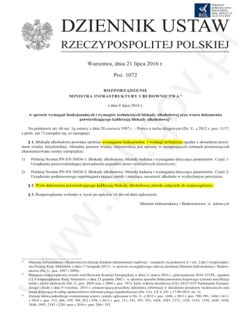 Dokument podpisany przez Marek Głuch Data: 2016.07.21 16:22:33 CEST DZIENNIK USTAW v.p l RZECZYPOSPOLITEJ POLSKIEJ Warszawa, dnia 21 lipca 2016 r. Poz. 1072 ROZPORZĄDZENIE MINISTRA INFRASTRUKTURY I BUDOWNICTWA 1) .go z dnia 8 lipca 2016 r. w sprawie wymagań funkcjonalnych i wymogów technicznych blokady alkoholowej oraz wzoru dokumentu potwierdzającego kalibrację blokady alkoholowej2) Na podstawie art. 66 ust. 1g ustawy z dnia 20 czerwca 1997 r. – Prawo o ruchu drogowym (Dz. U. z 2012 r. poz. 1137, z późn. zm.3)) zarządza się, co następuje: § 1. Blokada alkoholowa powinna spełniać wymagania funkcjonalne i wymogi techniczne zgodne z aktualnym poziomem wiedzy inżynierskiej. Aktualny poziom wiedzy inżynierskiej jest opisany w następujących normach przenoszących zharmonizowane normy europejskie: 2) Polskiej Normie PN-EN 50436-1: Blokady alkoholowe. Metody badania i wymagania dotyczące parametrów. Część 1: Urządzenia przeciwdziałające prowadzeniu pojazdów przez nietrzeźwych kierowców; w. rcl 1) Polskiej Normie PN-EN 50436-2: Blokady alkoholowe. Metody badania i wymagania dotyczące parametrów. Część 2: Urządzenia podstawowego zapobiegania mające ustnik i mierzące zawartość alkoholu w wydychanym powietrzu. § 2. Wzór dokumentu potwierdzającego kalibrację blokady alkoholowej określa załącznik do rozporządzenia. § 3. Rozporządzenie wchodzi w życie po upływie 14 dni od dnia ogłoszenia. ww Minister Infrastruktury i Budownictwa: A. Adamczyk Minister Infrastruktury i Budownictwa kieruje działem administracji rządowej – transport, na podstawie § 1 ust. 2 pkt 3 rozporządzenia Prezesa Rady Ministrów z dnia 17 listopada 2015 r. w sprawie szczegółowego zakresu działania Ministra Infrastruktury i Budownictwa (Dz. U. poz. 1907 i 2094). 2) Niniejsze rozporządzenie zostało notyfikowane Komisji Europejskiej w dniu 11 marca 2016 r., pod numerem 2016/123/PL, zgodnie z § 4 rozporządzenia Rady Ministrów z dnia 23 grudnia 2002 r. w sprawie sposobu funkcjonowania krajowego systemu notyfikacji norm i aktów prawnych (Dz. U. poz. 2039 oraz z 2004 r. poz. 597), które wdraża dyrektywę (UE) 2015/1535 Parlamentu Europejskiego i Rady z dnia 9 września 2015 r. ustanawiającą procedurę udzielania informacji w dziedzinie przepisów technicznych oraz zasad dotyczących usług społeczeństwa informacyjnego (ujednolicenie) (Dz. Urz. UE L 241 z 17.09.2015, str. 1). 3) Zmiany tekstu jednolitego wymienionej ustawy zostały ogłoszone w Dz. U. z 2012 r. poz. 1448, z 2013 r. poz. 700, 991, 1446 i 1611, z 2014 r. poz. 312, 486, 529, 768, 822 i 970, z 2015 r. poz. 211, 541, 591, 933, 1038, 1045, 1273, 1326, 1335, 1359, 1649, 1830, 1844, 1893, 2183 i 2281 oraz z 2016 r. poz. 266 i 352. 1) Załącznik do rozporządzenia Ministra Infrastruktury i Budownictwa –2– Poz. 1072 Dziennik Ustaw zZałącznik dnia 8 lipca 2016 r. (poz. ……) do rozporządzenia Ministra Infrastruktury WZÓR WZÓR v.p l i Budownictwa z dnia 8 lipca 2016 r. (poz. 1072) Dokument potwierdzający kalibrację blokady alkoholowej1) (nazwa producenta lub jego upoważnionego przedstawiciela wykonującego kalibrację) Właściciel pojazdu (imię i nazwisko lub nazwa właściciela pojazdu) ………………………........ Data kalibracji Producent urządzenia Typ urządzenia .go …………………………… Numer dokumentu …………………………… (adres właściciela pojazdu) …………………………… …………………………… Data ważności kalibracji od dnia wystawienia Numer VIN albo numer nadwozia, podwozia lub ramy pojazdu w. rcl …………………………… Numer seryjny urządzenia Przyrząd spełnia wymagania/nie spełnia wymagań2) § 1 rozporządzenia Ministra Infrastruktury i Budownictwa z dnia 8 lipca 2016 r. w sprawie wymagań funkcjonalnych i wymogów technicznych blokady alkoholowej oraz wzoru dokumentu potwierdzającego kalibrację blokady alkoholowej (Dz. U. poz. 1072) ww …………………… ………………………………….. ……………………………………. (miejscowość, data) (imię i nazwisko, stanowisko osoby (podpis) wykonującej kalibrację) 1) 2) Dokument powinien być sporządzony na papierze z zabezpieczeniem w postaci kolorowej grafiki lub znaku wodnego, odpowiadającym znakowi producenta urządzenia lub jego upoważnionego przedstawiciela. Niepotrzebne skreślić.