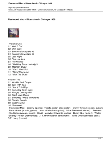 Fleetwood Mac – Blues Jam in Chicago 1969 Wpisany przez bluesever Środa, 28 Październik 2009 11:05 - Zmieniony Wtorek, 19 Marzec 2013 18:25 Fleetwood Mac – Blues Jam in Chicago 1969 Volume One 01. Watch Out 02. Ooh Baby 03. South Indiana (take 1) 04. South Indiana (take 2) 05. Last Night 06. Red Hot Jam 07. I'm Worried 08. I Held My Baby Last Night 09. Madison Blues 10. I Can't Hold Out 11. I Need Your Love 12. I Got The Blues Volume Two 01. World's In A Tangle 02. Talk With You 03. Like It This Way 04. Someday Soon Baby 05. Hungry Country Girl 06. Black Jack Blues 07. Everyday I Have The Blues 08. Rockin' Boogie 09. Sugar Mama 10. Homework Fleetwood Mac: Jeremy Spencer (vocals, guitar, slide guitar); Danny Kirwan (vocals, guitar); Peter Green (vocals, guitar); John McVie (bass guitar); Mick Fleetwood (drums). Mentors: Otis Spann (vocals, piano); David Honeyboy Edwards (guitar); Buddy Guy (guitar); Walter "Shakey" Horton (harmonica); J. T. Brown (tenor saxophone); Willie Dixon (acoustic bass); S.P. Leary (drums). 1/3 Fleetwood Mac – Blues Jam in Chicago 1969 Wpisany przez bluesever Środa, 28 Październik 2009 11:05 - Zmieniony Wtorek, 19 Marzec 2013 18:25 This set, recorded at Chess Record's Ter-Mar complex in Chicago, pairs Peter Green's Fleetwood Mac with some of the Windy City's blues legends including Willie Dixon, Otis Spann, Buddy Guy, and David "Honeyboy" Edwards. Put together on short notice, and recorded in one day, the sessions have something of a ramshackle feel, but the energy of the performances transcends any shortcomings on this date. Dixon oversaw the proceedings, and can be heard during the between-song banter giving directions and chastising Walter "Shakey" Horton for missing his cues. Since the Peter Green-led Fleetwood Mac was so directly influenced by Chicago blues, the session acts as a kind of stylistic homecoming for the band. Bassist John McVie and drummer Mick Fleetwood contribute driving rhythms while guitarists Danny Kirwan and Jeremy Spencer lend both rhythms and the occasional lead. Green's stunningly fluid guitar work is at the fore, as usual. But the real treat is picking out the Chess players--Otis Spann's piano on "I Got the Blues," J.T. Brown's tenor sax on Elmore James's "I Can't Hold Out," or Guy and Edwards, who go toe-to-toe with Green on "Red Hot Jam," one of the session's indisputable highlights. ---Rovi download: uploaded: CD1 4shared: CD1 ziddu: CD1 CD2 CD2 mediafire: CD1 divshare: CD1 hostuje: CD1 CD2 CD2 CD2 CD2 2/3 Fleetwood Mac – Blues Jam in Chicago 1969 Wpisany przez bluesever Środa, 28 Październik 2009 11:05 - Zmieniony Wtorek, 19 Marzec 2013 18:25 back 3/3