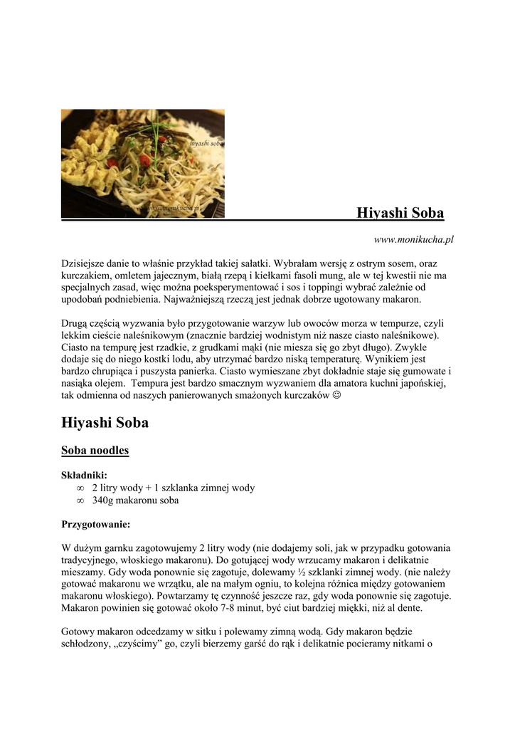 Hiyashi Soba www.monikucha.pl Dzisiejsze danie to właśnie przykład takiej sałatki. Wybrałam wersję z ostrym sosem, oraz kurczakiem, omletem jajecznym, białą rzepą i kiełkami fasoli mung, ale w tej kwestii nie ma specjalnych zasad, więc można poeksperymentować i sos i toppingi wybrać zależnie od upodobań podniebienia. Najważniejszą rzeczą jest jednak dobrze ugotowany makaron. Drugą częścią wyzwania było przygotowanie warzyw lub owoców morza w tempurze, czyli lekkim cieście naleśnikowym (znacznie bardziej wodnistym niż nasze ciasto naleśnikowe). Ciasto na tempurę jest rzadkie, z grudkami mąki (nie miesza się go zbyt długo). Zwykle dodaje się do niego kostki lodu, aby utrzymać bardzo niską temperaturę. Wynikiem jest bardzo chrupiąca i puszysta panierka. Ciasto wymieszane zbyt dokładnie staje się gumowate i nasiąka olejem. Tempura jest bardzo smacznym wyzwaniem dla amatora kuchni japońskiej, tak odmienna od naszych panierowanych smażonych kurczaków ☺ Hiyashi Soba Soba noodles Składniki: • 2 litry wody + 1 szklanka zimnej wody • 340g makaronu soba Przygotowanie: W dużym garnku zagotowujemy 2 litry wody (nie dodajemy soli, jak w przypadku gotowania tradycyjnego, włoskiego makaronu). Do gotującej wody wrzucamy makaron i delikatnie mieszamy. Gdy woda ponownie się zagotuje, dolewamy ½ szklanki zimnej wody. (nie należy gotować makaronu we wrzątku, ale na małym ogniu, to kolejna różnica między gotowaniem makaronu włoskiego). Powtarzamy tę czynność jeszcze raz, gdy woda ponownie się zagotuje. Makaron powinien się gotować około 7-8 minut, być ciut bardziej miękki, niż al dente. Gotowy makaron odcedzamy w sitku i polewamy zimną wodą. Gdy makaron będzie schłodzony, „czyścimy” go, czyli bierzemy garść do rąk i delikatnie pocieramy nitkami o siebie pod bieżącą wodą, aż woda będzie czysta. Ma to na celu pozbycie się resztek skrobi i ma istotne znaczenie przy przygotowaniu sałatki. Opłukany makaron przykrywamy wilgotnym ręcznikiem i odstawiamy. Tradycyjny ostry sos: Składniki : • ¾ szklanki drobno pokrojonego szczypioru z dymki • 3 łyżki sosu sojowego • 2 łyżki octu ryżowego • ½ łyżeczki cukru • ¼ łyżeczki sproszkowanej gorczycy • 1 łyżka oleju z winogron • 1 łyżka oleju sezamowego • 1/3 łyżeczki soli i pieprzu • ½ łyżeczki nasion sezamu • ¼ łyżeczki sproszkowanych nasion chili Przygotowanie: Wszystkie składniki dobrze ze sobą mieszamy, dodajemy 2 łyżki wody i mieszamy ponownie. Gotowe. Popularne składniki sałatki: • omlet jajeczny (przepis poniżej) • biała rzepa, drobno starta • ugotowane kiełki fasoli mung • nori, drobno pokrojone w paseczki • wasabi • szynka • ugotowana pierś kurczaka • ogórek • pomidor Tradycyjna zimna sałatka z makaronem soba jest podawana na bambusowych tackach, możemy je jednak zastąpić talerzem, lub półmiskiem. Porcje makaronu układamy na tacce i posypujemy nori. Wokół tacki, w małych miseczkach aranżujemy pozostałe składniki. Sos do maczania również rozlewamy do miseczek. Wasabi, białą rzepę i szczypior z dymki układamy w malej miseczce obok sosu. Wybrane przez nas dodatkowe składniki również układamy w miseczkach. Sałatkę jemy, maczając porcje makaronu i wybranego składniki w sosie. Innym sposobem podawania sałatki, jest nałożenie makaronu do miseczki, ułożenie dodatkowych składników na wierzchu i polanie wszystkiego sosem. Wtedy sałatka wygląda podobnie do zupy ☺ Omlet jajeczny Składniki : • 1 jajko • 1 łyżka wody • 1 łyżeczka cukru • 1 łyżeczka skrobi kukurydzianej wymieszanej z 1 łyżką wody • szczypta soli Przygotowanie:: Jajka lekko ubijamy z wodą, dodajemy cukier i sól i ubijamy, aż się rozpuszczą. Dodajemy skrobię kukurydzianą wymieszaną z wodą i znów dokładnie mieszamy. Przecedzamy przez sitko. Rozgrzewamy łyżkę oleju na patelni i smażymy bardzo cieniutkie omlety. Z jednego jajka, na patelni o średnicy 18 cm powinny wyjść 3 omlety. Ostudzone omlety zwijamy i kroimy w cienkie paseczki. Warzywa lub owoce morza w tempurze Tempura Składniki : • 1 duże żółtko • 1 szklanka bardzo zimnej wody (można użyć wody gazowanej) • ½ szklanka mąki • ½ szklanki skrobi kukurydzianej • ½ łyżeczki proszku do pieczenia • olej do smażenia • miska wody z lodem • warzywa i owoce morza, według własnego gustu (muszą być prosto z lodówki) - słodki ziemniak - marchewka - cebula - pieczarki - cukinia - krewetki - kalmary - szczypiorek - nori Sos do maczania: Składniki : • • • • • • • 2 łyżki octu ryżowego 2 łyżki sosu sojowego 1 łyżka oliwy z oliwek 1 łyżka cukru 1 ząbek czosnku, zmiażdżony 2 małe, drobno pokrojone papryczki chili, bez pestek sól, pieprz do smaku Przygotowanie: Wszystkie składniki sosu dokładnie mieszamy i całość wstawiamy do lodówki. Bardzo zimną wodę wlewamy do miseczki, dodajemy lekko ubite żółtko i delikatnie mieszamy, aż się połączą (tradycyjnie mikstura mieszana jest pałeczkami). Dodajemy mąkę, skrobię kukurydzianą i proszek do pieczenia i znowu mieszamy, aż składniki się połączą. Ciasto powinno być dość płynne, lejącę się (zdecydowanie rzadsze, niż na naleśniki) i może być lekko grudkowate. Tak przygotowane ciasto wkładamy na 20 minut do lodówki i w tym czasie przygotowujemy warzywa. Ziemniaki obieramy ze skórki i kroimy w krążki o grubości ½ cm. Cukinię i cebulę bez obierania również kroimy w ½ cm krążki. Skórkę z cebuli zdejmujemy dopiero z gotowych krążków, dzięki czemu nie rozpadną się one w trakcie krojenia. Pieczarki kroimy w ½ cm paseczki. Marchewkę obieramy ze skórki i kroimy w drobne paseczki o długości 10cm. Szczypiorek kroimy na kawałki o długości 10cm Nori kroimy nożyczkami w drobne paseczki o długości 10cm. Owoce morza dokładnie płuczemy i osuszamy ręcznikiem. Z krewetek zdejmujemy ogonk
