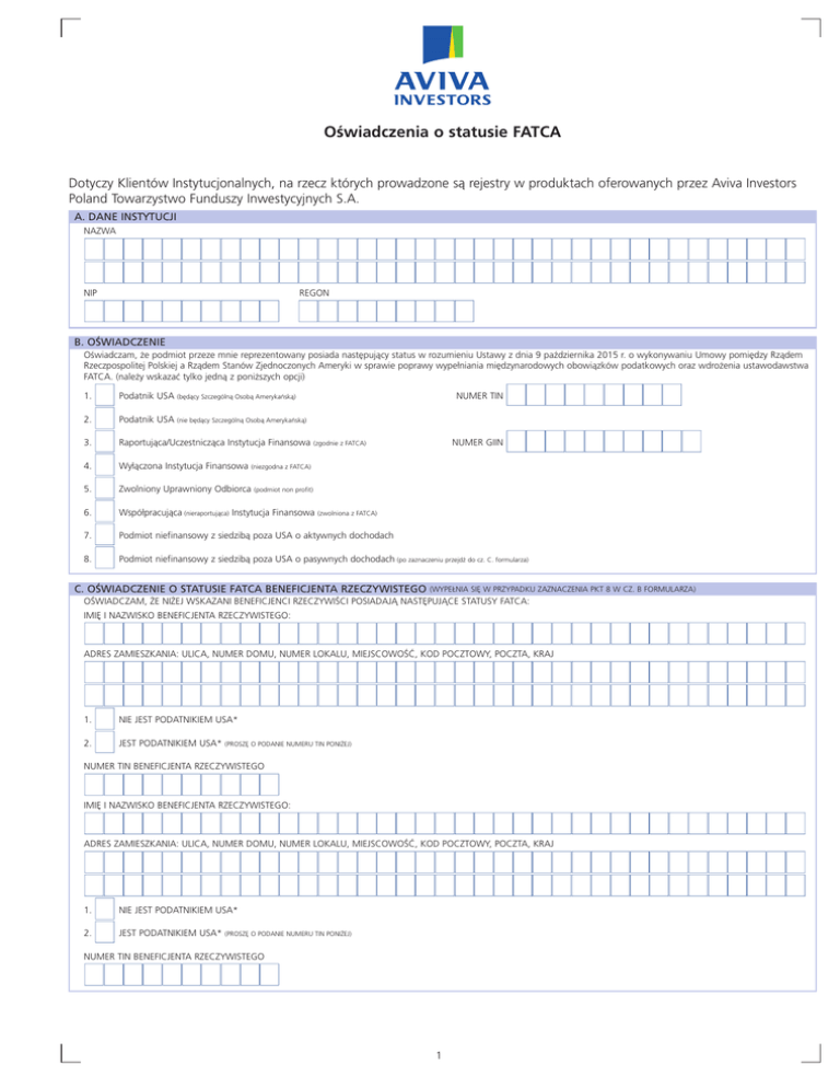 Oświadczenia o statusie FATCA Dotyczy Klientów Instytucjonalnych, na rzecz których prowadzone są rejestry w produktach oferowanych przez Aviva Investors Poland Towarzystwo Funduszy Inwestycyjnych S.A. A. DANE INSTYTUCJI NAZWA nnnnnnnnnnnnnnnnnnnnnnnnnnnnnnnnnnnnn nnnnnnnnnnnnnnnnnnnnnnnnnnnnnnnnnnnnn NIP REGON nnnnnnnnnnnnnnnnnnnn B. OŚWIADCZENIE Oświadczam, że podmiot przeze mnie reprezentowany posiada następujący status w rozumieniu Ustawy z dnia 9 października 2015 r. o wykonywaniu Umowy pomiędzy Rządem Rzeczpospolitej Polskiej a Rządem Stanów Zjednoczonych Ameryki w sprawie poprawy wypełniania międzynarodowych obowiązków podatkowych oraz wdrożenia ustawodawstwa FATCA. (należy wskazać tylko jedną z poniższych opcji) 1. 2. 3. 4. 5. 6. 7. 8. n n n n n n n n Podatnik USA (będący Szczególną Osobą Amerykańską) Podatnik USA (nie będący Szczególną Osobą Amerykańską) Raportująca/Uczestnicząca Instytucja Finansowa Wyłączona Instytucja Finansowa Zwolniony Uprawniony Odbiorca NUMER TIN NUMER GIIN (zgodnie z FATCA) nnnnnnnnn nnnnnnnnnn (niezgodna z FATCA) (podmiot non profit) Współpracująca (nieraportująca) Instytucja Finansowa (zwolniona z FATCA) Podmiot niefinansowy z siedzibą poza USA o aktywnych dochodach Podmiot niefinansowy z siedzibą poza USA o pasywnych dochodach (po zaznaczeniu przejdź do cz. C. formularza) C. OŚWIADCZENIE O STATUSIE FATCA BENEFICJENTA RZECZYWISTEGO (WYPEŁNIA SIĘ W PRZYPADKU ZAZNACZENIA PKT 8 W CZ. B FORMULARZA) OŚWIADCZAM, ŻE NIŻEJ WSKAZANI BENEFICJENCI RZECZYWIŚCI POSIADAJĄ NASTĘPUJĄCE STATUSY FATCA: IMIĘ I NAZWISKO BENEFICJENTA RZECZYWISTEGO: nnnnnnnnnnnnnnnnnnnnnnnnnnnnnnnnnnnnn ADRES ZAMIESZKANIA: ULICA, NUMER DOMU, NUMER LOKALU, MIEJSCOWOŚĆ, KOD POCZTOWY, POCZTA, KRAJ nnnnnnnnnnnnnnnnnnnnnnnnnnnnnnnnnnnnn nnnnnnnnnnnnnnnnnnnnnnnnnnnnnnnnnnnnn n n 1. NIE JEST PODATNIKIEM USA* 2. JEST PODATNIKIEM USA* (PROSZĘ O PODANIE NUMERU TIN PONIŻEJ) NUMER TIN BENEFICJENTA RZECZYWISTEGO nnnnnnnnnn IMIĘ I NAZWISKO BENEFICJENTA RZECZYWISTEGO: nnnnnnnnnnnnnnnnnnnnnnnnnnnnnnnnnnnnn ADRES ZAMIESZKANIA: ULICA, NUMER DOMU, NUMER LOKALU, MIEJSCOWOŚĆ, KOD POCZTOWY, POCZTA, KRAJ nnnnnnnnnnnnnnnnnnnnnnnnnnnnnnnnnnnnn nnnnnnnnnnnnnnnnnnnnnnnnnnnnnnnnnnnnn n n 1. NIE JEST PODATNIKIEM USA* 2. JEST PODATNIKIEM USA* (PROSZĘ O PODANIE NUMERU TIN PONIŻEJ) NUMER TIN BENEFICJENTA RZECZYWISTEGO nnnnnnnnnn 1 C. OŚWIADCZENIE O STATUSIE FATCA BENEFICJENTA RZECZYWISTEGO C.D. (WYPEŁNIA SIĘ W PRZYPADKU ZAZNACZENIA PKT 8 W CZ. B FORMULARZA) OŚWIADCZAM, ŻE NIŻEJ WSKAZANI BENEFICJENCI RZECZYWIŚCI POSIADAJĄ NASTĘPUJĄCE STATUSY FATCA: IMIĘ I NAZWISKO BENEFICJENTA RZECZYWISTEGO: nnnnnnnnnnnnnnnnnnnnnnnnnnnnnnnnnnnnn ADRES ZAMIESZKANIA: ULICA, NUMER DOMU, NUMER LOKALU, MIEJSCOWOŚĆ, KOD POCZTOWY, POCZTA, KRAJ nnnnnnnnnnnnnnnnnnnnnnnnnnnnnnnnnnnnn nnnnnnnnnnnnnnnnnnnnnnnnnnnnnnnnnnnnn n n 1. NIE JEST PODATNIKIEM USA* 2. JEST PODATNIKIEM USA* (PROSZĘ O PODANIE NUMERU TIN PONIŻEJ) NUMER TIN BENEFICJENTA RZECZYWISTEGO nnnnnnnnnn IMIĘ I NAZWISKO BENEFICJENTA RZECZYWISTEGO: nnnnnnnnnnnnnnnnnnnnnnnnnnnnnnnnnnnnn ADRES ZAMIESZKANIA: ULICA, NUMER DOMU, NUMER LOKALU, MIEJSCOWOŚĆ, KOD POCZTOWY, POCZTA, KRAJ nnnnnnnnnnnnnnnnnnnnnnnnnnnnnnnnnnnnn nnnnnnnnnnnnnnnnnnnnnnnnnnnnnnnnnnnnn n n 1. NIE JEST PODATNIKIEM USA* 2. JEST PODATNIKIEM USA* (PROSZĘ O PODANIE NUMERU TIN PONIŻEJ) NUMER TIN BENEFICJENTA RZECZYWISTEGO nnnnnnnnnn Zobowiązuję się do aktualizacji oświadczenia w zakresie statusu reprezentowanego przeze mnie podmiotu w rozumieniu Ustawy z dnia 9 października 2015 r. o wykonywaniu Umowy pomiędzy Rządem Rzeczpospolitej Polskiej a Rządem Stanów Zjednoczonych Ameryki w sprawie poprawy wypełniania międzynarodowych obowiązków podatkowych oraz wdrożenia ustawodawstwa FATCA, w przypadku zmiany okoliczności powodujących, iż poprzednie oświadczenie straciło aktualność oraz w razie konieczności do dostarczenia dodatkowych dokumentów w celu weryfikacji wiarygodności tego oświadczenia. Jestem świadomy odpowiedzialności karnej za złożenie fałszywego oświadczenia. PIECZĄTKI IMIENNE I CZYTELNE PODPISY OSÓB UPRAWNIONYCH DO REPREZENTOWANIA PODMIOTU DATA nnnnnnnnnn D. INFORMACJE DLA KLIENTA 1. Aviva Investors Poland TFI SA oraz reprezentowane przez Aviva Investors Poland TFI SA fundusze inwestycyjne są zobowiązane do przekazania do administracji podatkowej USA (za pośrednictwem polskich organów podatkowych) danych dotyczących: • podatników USA,* • osób, które odmówiły złożenia oświadczenia w zakresie statusu podatnika USA, • osób, w przypadku których stwierdzono przesłanki świadczące o rezydencji podatkowej USA i które, pomimo prośby nie dostarczyły dokumentów potwierdzających, że nie są podatnikami USA.* • podatników USA, będących szczególną osobą amerykańską oraz wyłączonych instytucji finansowych, w zakresie wskazanym w umowie FATCA i odrębnych przepisach. 2. Administratorem danych osobowych są fundusze inwestycyjne zarządzane przez Aviva Investors Poland TFI SA z siedzibą w Warszawie, ul. Inflancka 4B. Oświadczenie gromadzone jest na potrzeby realizacji obowiązków Aviva Investors Poland TFI SA oraz reprezentowanych przez Aviva Investors Poland TFI SA funduszy inwestycyjnych, dotyczących identyfikacji klientów będących podatnikami Stanów Zjednoczonych Ameryki wynikających z Ustawy z dnia 9 października 2015 r. o wykonywaniu Umowy pomiędzy Rządem Rzeczpospolitej Polskiej a Rządem Stanów Zjednoczonych Ameryki w sprawie poprawy wypełniania międzynarodowych obowiązków podatkowych oraz wdrożenia ustawodawstwa FATCA. Klient ma prawo dostępu do swoich danych, a także do ich poprawiania lub usunięcia * Definicja podatnika USA powinna być interpretowana zgodnie z przepisami Kodeksu Podatkowego USA (z ang. Internal Revenue Code) wedle którego podatnikiem USA jest osoba fizyczna spełniająca co najmniej jeden z wymienionych warunków: 1) posiada obywatels