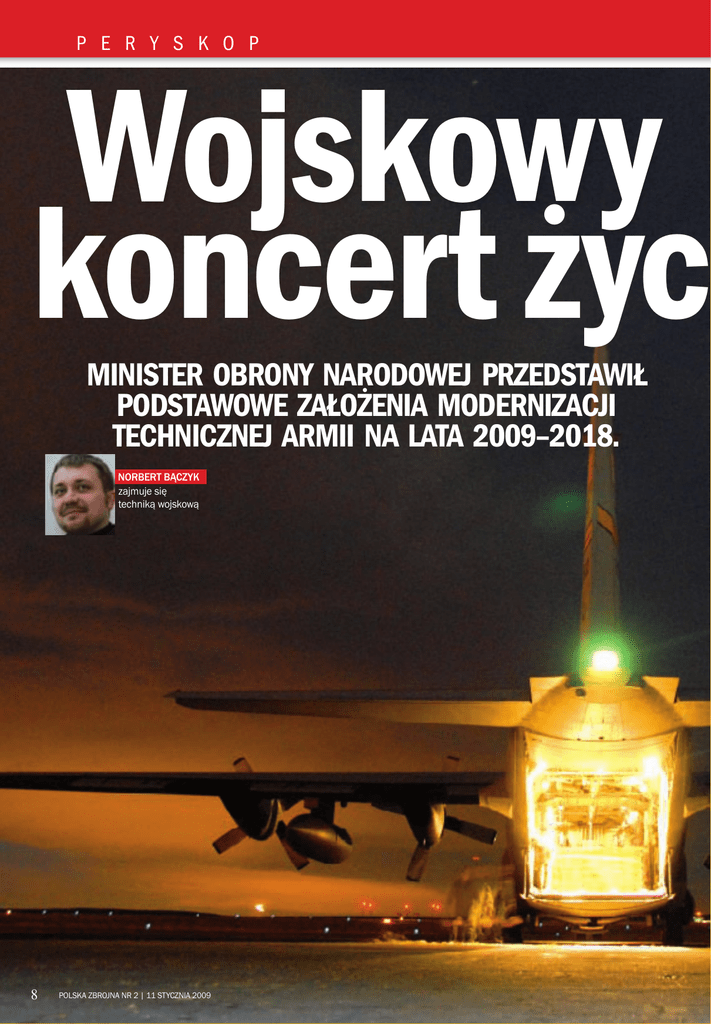 P E R Y S K O P Wojskowy koncert życz MINISTER OBRONY NARODOWEJ PRZEDSTAWIŁ PODSTAWOWE ZAŁOŻENIA MODERNIZACJI TECHNICZNEJ ARMII NA LATA 2009–2018. NORBERT BĄCZYK zajmuje się techniką wojskową 8 POLSKA ZBROJNA NR 2 | 11 STYCZNIA 2009 ARMIA ARMIA ARMIA R czeń esort obrony co pewien czas przygotowuje kilkuletnie plany rozwoju i modernizacji sił zbrojnych. Najnowszy, zgodnie z tendencjami obowiązującymi w NATO, obejmuje aż dziesięć lat – to projekt modernizacji technicznej armii na lata 2009–2018. Jego założenia są wyznacznikiem ogólnych kierunków rozwoju armii i stanowią rodzaj mapy drogowej dla decydentów oraz przedstawicieli przemysłu zbrojeniowego. Pokazuje także, jakie dziedziny będą w najbliższych latach priorytetowe dla wojska, a w jakich nie należy się spodziewać większych inwestycji. Dziesięć lat to sporo, zważywszy, że wcześniejsze programy dotyczyły okresów o połowę krótszych, a i tak życie weryfikowało potem wiele z zawartych w nich założeń. Spowolnienie gospodarki może także sporo namieszać w najnowszych planach. FOT. US DOD PROGRAMY WIODĄCE Intensywne prace nad kolejnym projektem modernizacji technicznej armii trwały przez ostatnie dwa lata, a wersja ostateczna stanie się faktem w momencie jej podpisania przez szefa MON. Bogdan Klich, zgodnie z wcześniejszymi zapowiedziami, zdecydował się na odtajnienie podstawowych założeń programu 2009–2018. W połowie grudnia na konferencji poświęconej zbliżającej się dziesiątej rocznicy członkostwa Polski w NATO przedstawił te założenia. Zaznaczył wówczas jednak, iż dokument nie został jeszcze podpisany. Według planu, projekty modernizacyjne można podzielić na trzy grupy. Pierwsza dotyczy kontynuacji czołowych programów wieloletnich, które uruchomiono głównie w latach 2001–2003. Chodzi o wozy Rosomak, pociski przeciwpancerne Spike, pociski przeciwlotnicze Grom oraz pociski przeciwokrętowe RBS 15 Mk 3. Kolejna grupa obejmuje programy rozpoczęte stosunkowo niedawno, głównie w 2008 roku, bądź te, które mają zostać uruchomione w najbliższym czasie. Należą do nich projekt indywidualnego wyposażenia i uzbrojenia żołnierza Tytan, zakupy nowych symulatorów i trenażerów, samolotu szkolno-bojowego, wdrażanie zmodernizowanych wyrzutni rakietowych WR-40 Langusta, dział samobieżnych Krab kalibru 155 milimetrów, modernizacja BWP-1 (program Puma), zakup samolotów M-28 Skytruck oraz pozyskanie ciężkich wyrzutni rakietowych MLRS Homar. Wreszcie POLSKA ZBROJNA NR 2 | 11 STYCZNIA 2009 9 FOT. MAX BRYANSKY P E R Y S K O P Obok systemów przeciwlotniczych największy kontrakt mają stanowić śmigłowce wielozadaniowe. najważniejsza grupa to pięć projektów określanych jako główne programy wieloletnie modernizacji technicznej armii na lata 2009–2018. Pierwszy z tych projektów ma dotyczyć systemu obrony powietrznej. Wojska przeciwlotnicze otrzymają zestawy artyleryjskie i artyleryjsko-rakietowe bliskiego zasięgu (odpowiednio do 4 i 10 kilometrów) oraz zestawy rakietowe krótkiego i średniego zasięgu (odpowiednio do 25 i 100 kilometrów). Drugi obejmie śmigłowce wsparcia bojowego i zabezpieczenia, w tym wielozadaniowe, poszukiwawczo-ratownicze – SAR, oraz przeznaczone do zwalczania okrętów podwodnych i zadań transportowych. Trzeci projekt będzie skupiony na modernizacji Marynarki Wojennej – zakupach wielozadaniowych korwet Gawron, niszczycieli min Kormoran, okrętów podwodnych oraz uzbrojenia dla nadbrzeżnego dywizjonu rakietowego. Z kolei czwarty będzie dotyczyć systemów wsparcia dowodzenia oraz zobrazowania pola walki – C4ISR, w tym systemów monitorowania położenia oraz identyfikacji bojowej, mobilnych systemów teleinformatycznych oraz zintegrowanych zautomatyzowanych systemów dowodzenia i kierowania środkami walki. Ostatni, piąty program, obejmie bezzałogowe samoloty rozpoznawcze i rozpoznawczo-uderzeniowe. Razem daje to 18 czołowych programów, jakie armia uznała za priorytetowe w nadchodzącej dekadzie. Należy do nich doliczyć kontrakt na F-16, którego finalizowanie potrwa mniej więcej do 2014 roku oraz pozyskanie samolotów C-130 od rządu USA w roku 2009 czy kilka mniej spektakularnych zamierzeń. Dlaczego właśnie te programy, a nie inne? Jak zauważył Bogdan Klich, szczególnie ważny dla naszej armii jest rozwój systemów rozpoznania, identyfikacji wojsk i wymiany informacji, ponieważ mają one decydujące znaczenie przy budowie no- 10 POLSKA ZBROJNA NR 2 | 11 STYCZNIA 2009 woczesnych i kompatybilnych z sojuszniczymi formacji bojowych. Z rozpoznaniem związane są także samoloty bezpilotowe. Nieco inny charakter mają natomiast trzy pozostałe czołowe programy. Wymiana systemów przeciwlotniczych oraz śmigłowców to konieczność, ponieważ za kilka lat trzeba będzie wycofać obecnie używane platformy, które często mają ponad 30 lat. Po- PROGRAM NA LATA 2009–2018 TO REZULTAT KOMPROMISU. NIE WZBUDZA ON NADMIERNEGO ZACHWYTU W RODZAJACH SIŁ ZBROJNYCH dobna sytuacja dotyczy Marynarki Wojennej – bez nowych okrętów w 2018 roku flota, jeśli nawet nie pozostanie po niej tylko wspomnienie, zamieni się w pływające muzeum. SZTUKA KOMPROMISU Projekt programu na lata 2009–2018 można streścić jednym słowem: kompromis. Jest on wypadkową oczekiwań poszczególnych rodzajów sił zbrojnych oraz planów Sztabu Generalnego WP i możliwości budżetowych MON. Nie należy zatem spodziewać się zachwytów pod jego adresem. Każdy rodzaj sił zbrojnych musiał bowiem poważnie ograniczyć oczekiwania, a dyskusje o ważności danego programu, podobnie jak targowanie się o dodatkowe środki, z pewnością będą trwały dalej. Marynarze zapewne mogli poczuć się nieco rozgoryczeni, gdyż zaproponowane plany nie wykraczają poza pozyskanie zaledwie kilku okrętów, w najgorszym razie po jednym w danej klasie, w wersji optymistycznej zaś najwyżej po dwa (korwety i okręty podwodne), maks