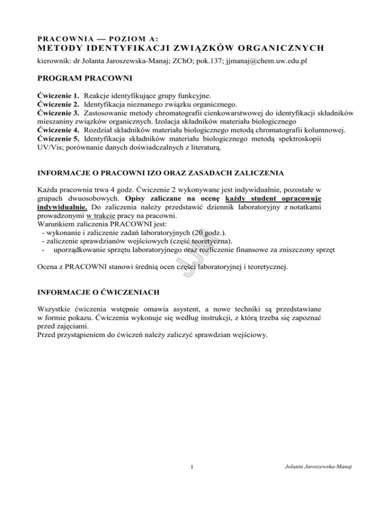PRACO W NI A PO ZI O M A: METODY IDENTYFIKACJI ZWIĄZKÓW ORGANICZNYCH kierownik: dr Jolanta Jaroszewska-Manaj; ZChO; pok.137; [email protected] PROGRAM PRACOWNI Ćwiczenie 1. Reakcje identyfikujące grupy funkcyjne. Ćwiczenie 2. Identyfikacja nieznanego związku organicznego. Ćwiczenie 3. Zastosowanie metody chromatografii cienkowarstwowej do identyfikacji składników mieszaniny związków organicznych. Izolacja składników materiału biologicznego Ćwiczenie 4. Rozdział składników materiału biologicznego metodą chromatografii kolumnowej. Ćwiczenie 5. Identyfikacja składników materiału biologicznego metodą spektroskopii UV/Vis; porównanie danych doświadczalnych z literaturą. INFORMACJE O PRACOWNI IZO ORAZ ZASADACH ZALICZENIA Każda pracownia trwa 4 godz. Ćwiczenie 2 wykonywane jest indywidualnie, pozostałe w grupach dwuosobowych. Opisy zaliczane na ocenę każdy student opracowuje indywidualnie. Do zaliczenia należy przedstawić dziennik laboratoryjny z notatkami prowadzonymi w trakcie pracy na pracowni. Warunkiem zaliczenia PRACOWNI jest: - wykonanie i zaliczenie zadań laboratoryjnych (20 godz.). - zaliczenie sprawdzianów wejściowych (część teoretyczna). - uporządkowanie sprzętu laboratoryjnego oraz rozliczenie finansowe za zniszczony sprzęt Ocena z PRACOWNI stanowi średnią ocen części laboratoryjnej i teoretycznej. INFORMACJE O ĆWICZENIACH Wszystkie ćwiczenia wstępnie omawia asystent, a nowe techniki są przedstawiane w formie pokazu. Ćwiczenia wykonuje się według instrukcji, z którą trzeba się zapoznać przed zajęciami. Przed przystąpieniem do ćwiczeń należy zaliczyć sprawdzian wejściowy. 1 Jolanta Jaroszewska-Manaj INSTRUKCJE, WSKAZÓWKI DO ĆWICZEŃ 2 Jolanta Jaroszewska-Manaj Ćwiczenie 1: Reakcje identyfikujące grupy funkcyjne. AMINY Związek Anilina, lub p-toluidyna N,N-dimetyloanilina Glicyna lub alkiloamina Prolina lub N-metyloanilina Typ Reakcje Irz amina aromatyczna NaNO2/HCl/0oC- r. z kw. azotowym(III); r. z Br2aq IIIrz amina aromatyczna Irz amina alifatyczna NaNO2/HCl/0oC- r. z kw. azotowym(III) IIrz amina 1)Reakcja z kwasem azotowym(III) (WYCIĄG!) aminy I rz. aromatyczne: powstaje sól diazoniowa, która w reakcji z 2-naftolem daje barwnik azowy N2+Cl N2+Cl NH2 OH O oC + NaNO2 ; + 2 H2O + NaCl + 2 HCl + + HCl N=N OH aminy II rzędowe aromatyczne: powstaje N-nitrozoamina (oleista, barwna ciecz lub ciało stałe) aminy III rzędowe aromatyczne: powstaje C-nitrozoamina w postaci żółtego lub zielonego osadu N(CH3)2 + NaNO2 + HCl OoC N(CH3)2 + H2O + NaCl O=N aminy I rzędowe alifatyczne: powstająca sól diazoniowa ulega natychmiastowemu rozkładowi – wydziela się gazowy azot. R NH2 + NaNO2 + HCl OoC N2 + R-OH + H2O + NaCl aminy II rzędowe alifatyczne: powstaje N-nitrozoamina (oleista, barwna ciecz) R2-NH + NaNO2 + HCl OoC R2N-N=O + H2O + NaCl 0 aminy III rzędowe alifatyczne: w temperaturze O C nie reagują z kwasem azotowym(III). WYKONANIE: 10% r. kwasu solnego; 10% r. azotanu(III) sodu; lód; 2-naftol; 10% r. wodorotlenku sodu Próbkę badanej aminy ok. 0.2 cm3 lub 0.2g (wielkość połowy ziarnka grochu) rozpuścić w kwasie solnym. Sprawdzić odczyn kwasowy papierkiem wskaźnikowym. Probówkę umieścić w łaźni oziębiającej na ok. 5 min. Nie wyjmując probówki z łaźni dodawać powoli ok.2 cm3 roztworu azotanu (III) sodu. Zanotować obserwowane zmiany. - amina alifatyczna I rz. - obserwuje się obficie wydzielający się azot - amina alifatyczna II rz. - obserwuje się wydzielanie żółtej nierozpuszczalnej cieczy - amina alifatyczna III rz. – nie obserwuje się zmian (brak reakcji) -amina aromatyczna II rz. - obserwuje się wydzielanie barwnej nierozpuszczalnej cieczy lub osadu -amina aromatyczna III rz. - obserwuje się wydzielanie barwnego osadu -amina aromatyczna I rz. - nie obserwuje się zmian – powstaje rozpuszczalna sól diazoniowa, którą należy zidentyfikować przez dodanie do otrzymanej mieszaniny poreakcyjnej 0.5 - 1 cm3 nasyconego roztworu 2-naftolu w 10%NaOH – powstaje intensywnie zabarwiony osad (najczęściej czerwony). 2) Bromowanie (WYCIĄG!) Aminy aromatyczne łatwo ulegają reakcji bromowania na zimno bez katalizatora. Br substytucja elektrofilowa N(R)2 + 3Br2 Br N(R)2 + 3 HBr Br WYKONANIE: 2% roztw. bromu w CCl4 lub woda bromowa Do próbki badanej aminy ok. 0.2 cm3 lub 0.2g (wielkość połowy ziarnka grochu) dodać trzy krople odczynnika. Wstrząsnąć, obserwować odbarwienie roztworu bromu. 3 Jolanta Jaroszewska-Manaj ALKOHOLE tert-butanol etanol OH w alkoholach OH w alkoholach r. z HCl stęż/ZnCl2bzw.(próba Lucasa); r. acylowania; próba jodoformowa 1) Rozróżnianie rzędowości alkoholi Alkohole trzeciorzędowe w obecności bezwodnego chlorku cynku bardzo szybko reagują z kwasem solnym (stężonym) dając chlorki alkilowe (nierozpuszczalne, oleiste ciecze). Alkohole drugorzędowe reagują powoli: po 5-10 min. Pojawia się zmętnienie, a dopiero po dłuższym czasie powstaje warstewka chlorku alkilowego. Alkohole pierwszorzędowe nie reagują. R3C OH + ZnCl2bzw. HCl R3C-Cl + H2O WYKONANIE: Odczynnik Lucasa: 15,5g bezwodnego chlorku cynku w 10 cm3 stężonego kwasu solnego. Do próbki alkoholu III rzędowego ok. 0.5 cm3 dodać ok. 3 cm3 odczynnika. Zakorkować probówkę i mocno skłócić. Pozostawić w spokoju, obserwować czy powstaje warstwa oleista. 2) Próba jodoformowa Alkohole zawierające grupę hydroksylową przy drugim atomie węgla ulegają reakcji jodoformowej. Alkohole IIIrz nie dają tej reakcji. CH3 R RCOONa + CHI3 (żolty osad) + CH OH + I2 + 2 NaOH NaI + 2 H2O WYKONANIE: Odczynnik : 10g jodku potasu i 5g jodu rozpuszcza się w 50 cm3 wody dest.; 5% NaOH Do próbki alkoholu (etanol) ok. 5 kropli dodać ok. 2cm3 wody i 1-2cm3 5% NaOH, a następnie kroplami dodawać odczynnik do chwili utrzymania się ciemnej barwy jodu. Jeśli po kilku minutach nie pojawi się osad wstawić probówkę do gorącej wody na kilka minut. Oziębić, obserwować zmiany. 3) Acylo