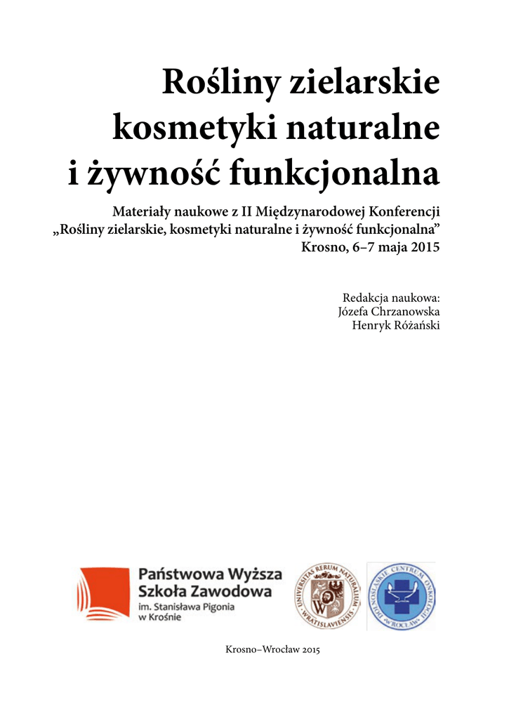 Rośliny zielarskie kosmetyki naturalne i żywność funkcjonalna Materiały naukowe z II Międzynarodowej Konferencji „Rośliny zielarskie, kosmetyki naturalne i żywność funkcjonalna” Krosno, 6–7 maja 2015 Redakcja naukowa: Józefa Chrzanowska Henryk Różański Krosno–Wrocław 2015