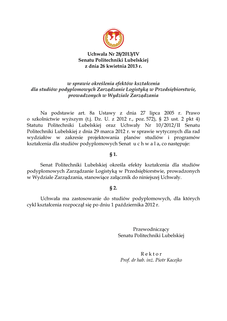 Uchwała Nr 28/2013/IV Senatu Politechniki Lubelskiej z dnia 26 kwietnia 2013 r. w sprawie określenia efektów kształcenia dla studiów podyplomowych Zarządzanie Logistyką w Przedsiębiorstwie, prowadzonych w Wydziale Zarządzania Na podstawie art. 8a Ustawy z dnia 27 lipca 2005 r. Prawo o szkolnictwie wyższym (t.j. Dz. U. z 2012 r., poz. 572), § 23 ust. 2 pkt 4) Statutu Politechniki Lubelskiej oraz Uchwały Nr 10/2012/II Senatu Politechniki Lubelskiej z dnia 29 marca 2012 r. w sprawie wytycznych dla rad wydziałów w zakresie projektowania planów studiów i programów kształcenia dla studiów podyplomowych Senat u c h w a l a, co następuje: § 1. Senat Politechniki Lubelskiej określa efekty kształcenia dla studiów podyplomowych Zarządzanie Logistyką w Przedsiębiorstwie, prowadzonych w Wydziale Zarządzania, stanowiące załącznik do niniejszej Uchwały. § 2. Uchwała ma zastosowanie do studiów podyplomowych, dla których cykl kształcenia rozpoczął się po dniu 1 października 2012 r. Przewodniczący Senatu Politechniki Lubelskiej Rektor Prof. dr hab. inż. Piotr Kacejko Załącznik do Uchwały Nr 28/2013/IV Senatu Politechniki Lubelskiej z dnia 26 kwietnia 2013 r. Ogólna charakterystyka studiów podyplomowych 1. Nazwa studiów: Zarządzanie Logistyką w Przedsiębiorstwie. 2. Profil kształcenia: ogólnoakademicki. 3. Forma studiów: niestacjonarne. 4. Wskazanie dziedzin nauki i dyscyplin naukowych, do których odnoszą się efekty kształcenia: obszar kształcenia – w zakresie nauk społecznych, dziedzina nauki – nauki ekonomiczne, dyscyplina naukowa – nauki o zarządzaniu, ekonomia. 5. Wskazanie związku z Misją Uczelni i Strategią jej rozwoju: studia są zgodne z Misją Uczelni, która jako ważny ośrodek edukacji i nauki silnie wspiera doskonalenie kadr kierowniczych odpowiedzialnych między innymi za kierowanie przepływem materiałów i informacji w ogólnie pojmowanym łańcuchu powiązań logistycznych. Program kształcenia na kierunku Zarządzanie Logistyką w Przedsiębiorstwie wpisuje się w cele i zadania ujęte w Misji i Strategii Rozwoju Politechniki Lubelskiej. Obszar dydaktyczny jest w nich traktowany jako jeden z najważniejszych, z wyraźnym wskazaniem celu, jakim jest: − przekazywanie studentom niezbędnej wiedzy i umiejętności; − kształtowanie twórczych i odpowiedzialnych postaw; − dostosowywanie procesu kształcenia studentów do potrzeb rynku pracy oraz funkcjonowania w społeczeństwie opartym na wiedzy. W Misji Politechniki Lubelskiej, w obszarze kształcenia, podkreślono znaczenie następujących zadań: − kształcenie młodzieży studenckiej na kompetentnych specjalistów oraz światłych i odpowiedzialnych obywateli; − zapewnienie najwyższego poziomu pracy dydaktycznej, naukowej i wychowawczej jako głównej społecznej roli Uczelni; − udział w tworzeniu europejskiej przestrzeni edukacyjnej; − przekazywanie studentom niezbędnej wiedzy i umiejętności oraz kształtowanie twórczych i odpowiedzialnych postaw; − odpowiedzialny i twórczy udział w procesie tworzenia nowoczesnego społeczeństwa informacyjnego; − uznanie jedności edukacji i nauki. Z kolei za cel strategiczny w obszarze kształcenia uznano „wzrost konkurencyjności oferty dydaktycznej Politechniki Lubelskiej na rynku krajowym oraz międzynarodowym poprzez dostosowanie procesu kształcenia studentów do potrzeb rynku pracy oraz funkcjonowania w społeczeństwie opartym na wiedzy”. W kontekście Misji i przyjętych celów strategicznych Uczelni, program kształcenia na kierunku Zarządzanie Logistyką w Przedsiębiorstwie zakłada zarówno dostarczenie studentom kompleksowej, aktualnej wiedzy z zakresu zarządzania przepływem materiałów i informacji w ogólnie pojmowanym łańcuchu powiązań logistycznych, jak i umiejętności jej praktycznego zastosowania. Nacisk położony został na rozwiązywanie problemów pojawiających się w praktyce funkcjonowania przedsiębiorstw produkcyjnych i usługowych. Zakres oferowanych przedmiotów umożliwia poszerzenie i pogłębienie efektów uzyskanych na I i II stopniu studiów, zaś tematyka poszczególnych specjalności pozwala na nabycie wiedzy i umiejętności pod kątem oczekiwań rynku i pracodawców. Ważnym celem kierunku jest także rozwój kompetencji kierowniczych, dzięki którym absolwent kierunku dostrzega potrzebę ciągłego doskonalenia, pogłębiania i rozszerzania posiadanej wiedzy oraz umiejętności, a w rezultacie – nabywa i rozwija umiejętność uczenia się przez całe życie, co jest szczególnie istotne w gospodarce opartej na wiedzy. Wykorzystanie wzorców i doświadczenia partnera zewnętrznego – Firmy LOGNET Solutions Sp. z o.o. – pozwala na zapewnienie innowacyjności i elastyczności oferty dydaktycznej, ale przede wszystkim tworzy, pożądany w Strategii Rozwoju Uczelni, związek z praktyką biznesu. 6. Ogólne cele kształcenia oraz uprawnienia nabyte przez absolwentów studiów: − przekazanie zaawansowanej, wyspecjalizowanej wiedzy z zakresu nauk o zarządzaniu i nauk pokrewnych oraz kształtowanie krytycznego i oryginalnego myślenia o jej przydatności i skuteczności; − przygotowanie absolwentów do podjęcia pracy w roli specjalistów w zakresie logistyki przedsiębiorstw poprzez kształtowanie zaawansowanych umiejętności identyfikowania, formułowania i rozwiązywania problemów pojawiających się w szeroko rozumianym łańcuchu logistycznym; − kształtowanie aktywnej postawy wobec problemów logistycznych w przedsiębiorstwie oraz zaangażowania i poczucia osobistej odpowiedzialności za podejmowane decyzje w środowisku pracy i poza nim. Po studiach podyplomowych na kierunku Zarządzanie Logistyką w Przedsiębiorstwie absolwent może znaleźć zatrudnienie jako: – specjalista z zakresu logistyki; – konsultant/doradca dla instytucji gospodarczych i społecznych; – menedżer/kierownik średniego lub wyższego szczebla zarządzania; 