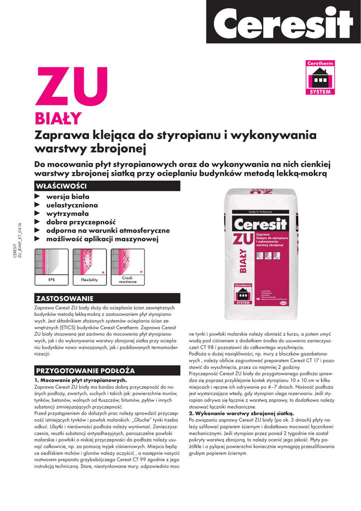 ZU BIAŁY Zaprawa klejąca do styropianu i wykonywania warstwy zbrojonej CERESIT ZU_BIAŁY_KT_04.16 Do mocowania płyt styropianowych oraz do wykonywania na nich cienkiej warstwy zbrojonej siatką przy ocieplaniu budynków metodą lekką-mokrą WŁAŚCIWOŚCI wersja biała uelastyczniona wytrzymała dobra przyczepność odporna na warunki atmosferyczne możliwość aplikacji maszynowej ZASTOSOWANIE Zaprawa Ceresit ZU biały służy do ocieplania ścian zewnętrznych budynków metodą lekką-mokrą z zastosowaniem płyt styropianowych. Jest składnikiem złożonych systemów ocieplania ścian zewnętrznych (ETICS) budynków Ceresit Ceretherm. Zaprawa Ceresit ZU biały stosowana jest zarówno do mocowania płyt styropianowych, jak i do wykonywania warstwy zbrojonej siatka przy ocieplaniu budynków nowo wznoszonych, jak i poddawanych termomodernizacjii. PRZYGOTOWANIE PODŁOŻA 1. Mocowanie płyt styropianowych. Zaprawa Ceresit ZU biały ma bardzo dobrą przyczepność do nośnych podłoży, zwartych, suchych i takich jak: powierzchnie murów, tynków, betonów, wolnych od tłuszczów, bitumów, pyłów i innych substancji zmniejszających przyczepność. Przed przystąpieniem do dalszych prac należy sprawdzić przyczepność istniejących tynków i powłok malarskich. „Głuche” tynki trzeba odkuć. Ubytki i nierówności podłoża należy wyrównać. Zanieczyszczenia, resztki substancji antyadhezyjnych, paroszczelne powłoki malarskie i powłoki o niskiej przyczepności do podłoża należy usunąć całkowicie, np. za pomocą myjek ciśnieniowych. Miejsca będące siedliskiem mchów i glonów należy oczyścić , a następnie nasycić roztworem preparatu grzybobójczego Ceresit CT 99 zgodnie z jego instrukcją techniczną. Stare, nieotynkowane mury, odpowiednio moc- ne tynki i powłoki malarskie należy obmieść z kurzu, a potem umyć wodą pod ciśnieniem z dodatkiem środka do usuwania zanieczyszczeń CT 98 i pozostawić do całkowitego wyschnięcia. Podłoża o dużej nasiąkliwości, np. mury z bloczków gazobetonowych , należy obficie zagruntować preparatem Ceresit CT 17 i pozostawić do wyschnięcia, przez co najmniej 2 godziny. Przyczepność Ceresit ZU biały do przygotowanego podłoża sprawdza się poprzez przyklejanie kostek styropianu 10 x 10 cm w kilku miejscach i ręczne ich odrywanie po 4–7 dniach. Nośność podłoża jest wystarczająca wtedy, gdy styropian ulega rozerwaniu. Jeśli styropian odrywa się łącznie z warstwą zaprawy, to dodatkowo należy stosować łączniki mechaniczne. 2. Wykonanie warstwy zbrojonej siatką. Po związaniu zaprawy Ceresit ZU biały (po ok. 3 dniach) płyty należy szlifować papierem ściernym i dodatkowo mocować łącznikami mechanicznymi. Jeśli styropian przez ponad 2 tygodnie nie został pokryty warstwą zbrojoną, to należy ocenić jego jakość. Płyty pożółkłe i o pylącej powierzchni koniecznie wymagają przeszlifowania grubym papierem ściernym. Do odmierzonej ilości czystej, chłodnej wody wsypywać zawartość opakowania i mieszać za pomocą wiertarki z mieszadłem, aż do uzyskania jednorodnej masy bez grudek, odczekać około 5 min i ponownie zamieszać. 1. Mocowanie płyt styropianowych. Gotową zaprawę należy nakładać kielnią po obwodzie płyty pasmem o szerokości 3–4 cm i kilkoma plackami o średnicy ok. 8 cm. Bezzwłocznie trzeba przyłożyć płytę do ściany i docisnąć uderzeniami długiej pacy. Prawidłowo nałożona zaprawa po dociśnięciu płyty pokrywa min. 40% jej powierzchni. W przypadku równych, gładkich podłoży zaprawę można nakładać na płyty za pomocą pacy zębatej (zęby 10–12 mm). Płyty należy mocować ściśle jedna przy drugiej, w jednej płaszczyźnie, z zachowaniem mijankowego układu styków pionowych. 2. Wykonanie warstwy zbrojonej siatką. Gotową zaprawę rozprowadzać pacą zębata 10 lub 12 mm na powierzchni płyt styropianowych. Na świeżą zaprawę nakładać siatkę z włókna szklanego (z zachowaniem zakładów 10 cm) i równo zagładzać powierzchnię, tak by siatka przestała być widoczna. Po ok. 24 godzinach od aplikacji warstwy zbrojonej można wykonać na niej cienka warstwę szpachlową o grubości ok. 1mm. Możliwość aplikacji maszynowej. Zalecany typ maszyny np: Wagner PC 15, PC 830, SPG Baumaschinen PG 20, wielkość dyszy þ 6 mm. Świeże zabrudzenia zaprawą zmywać wodą, a stwardniałe można usuwać mechanicznie. UWAGA W czasie wykonywania warstwy zbrojonej nie należy pracować na ścianach silnie nasłonecznionych, a wykonaną warstwę chronić przed opadami deszczu. Zaleca się stosowanie osłon na rusztowaniach. Prace należy wykonywać w suchych warunkach, przy temperaturze powietrza i podłoża od +5°C do +25°C. Szczegóły dotyczące prac ociepleniowych opisane są w Instrukcji ITB nr 418/2007 oraz 447/2009. Ceresit ZU biały zawiera cement i zmieszany z wodą ma odczyn alkaliczny. W związku z tym należy chronić skórę i oczy. W przypadku kontaktu materiału z oczami płukać je obficie wodą i zasięgnąć porady lekarza. Właściwości użytkowe podane są w treści odpowiadającej wyrobowi Deklaracji Właściwości Użytkowych. ZALECENIA Należy stosować płyty ze styropianu białego lub grafitowego, które spełniają wymagania złożonego systemu ocieplania ścian zewnętrznych (ETICS) wg PN-EN 13163. Szczegóły dotyczące prac ociepleniowych opisane są w Instrukcji ITB nr 418/2007 oraz 447/2009. SKŁADOWANIE Do 12 miesięcy od daty produkcji, przy składowaniu na paletach, w suchych warunkach i w oryginalnych, nieuszkodzonych opakowaniach. OPAKOWANIA Worek 25 kg. DANE TECHNICZNE Baza: mieszanka cementów z wypełniaczami mineralnymi i modyfikatorami Gęstość nasypowa: ok. 1,3 kg/dm3 Proporcje mieszania: 4,5–5,0 l wody na 25 kg Temperatura stosowania: od +5°C do +25°C Czas zużycia: ok. 2 godz. Przyczepność: –do betonu ≥ 0,25 MPa –do styropianu ≥ 0,08 MPa wg ZUAT-15/V.03/2010 Orientacyjne zużycie: