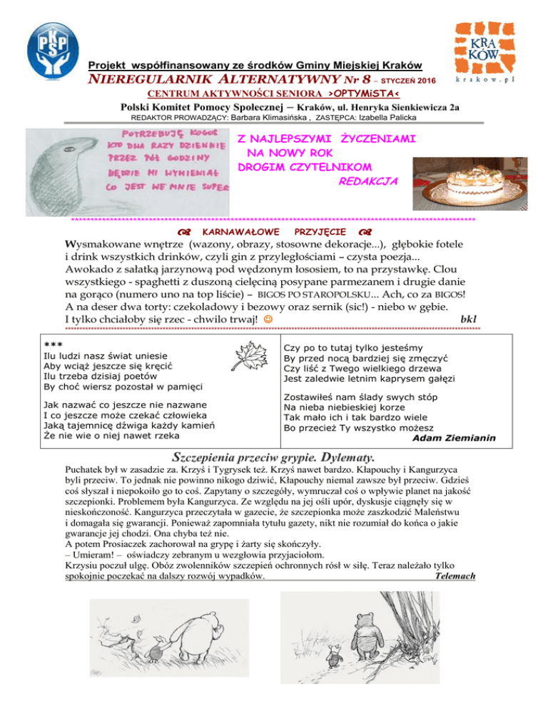 Projekt współfinansowany ze środków Gminy Miejskiej Kraków NIEREGULARNIK ALTERNATYWNY Nr 8 – STYCZEŃ 2016 CENTRUM AKTYWNOŚCI SENIORA >OPTYMiSTA< Polski Komitet Pomocy Społecznej – Kraków, ul. Henryka Sienkiewicza 2a REDAKTOR PROWADZĄCY: Barbara Klimasińska , ZASTĘPCA: Izabella Palicka Z NAJLEPSZYMI ŻYCZENIAMI NA NOWY ROK DROGIM CZYTELNIKOM REDAKCJA ******************************************************************************************************** KARNAWAŁOWE PRZYJĘCIE Wysmakowane wnętrze (wazony, obrazy, stosowne dekoracje...), głębokie fotele i drink wszystkich drinków, czyli gin z przyległościami – czysta poezja... Awokado z sałatką jarzynową pod wędzonym łososiem, to na przystawkę. Clou wszystkiego - spaghetti z duszoną cielęciną posypane parmezanem i drugie danie na gorąco (numero uno na top liście) – BIGOS PO STAROPOLSKU... Ach, co za BIGOS! A na deser dwa torty: czekoladowy i bezowy oraz sernik (sic!) - niebo w gębie. I tylko chciałoby się rzec - chwilo trwaj! bkl ************************************************************************************************************************************************* *** Ilu ludzi nasz świat uniesie Aby wciąż jeszcze się kręcić Ilu trzeba dzisiaj poetów By choć wiersz pozostał w pamięci Czy po to tutaj tylko jesteśmy By przed nocą bardziej się zmęczyć Czy liść z Twego wielkiego drzewa Jest zaledwie letnim kaprysem gałęzi Jak nazwać co jeszcze nie nazwane I co jeszcze może czekać człowieka Jaką tajemnicę dźwiga każdy kamień Że nie wie o niej nawet rzeka Zostawiłeś nam ślady swych stóp Na nieba niebieskiej korze Tak mało ich i tak bardzo wiele Bo przecież Ty wszystko możesz Adam Ziemianin Szczepienia przeciw grypie. Dylematy. Puchatek był w zasadzie za. Krzyś i Tygrysek też. Krzyś nawet bardzo. Kłapouchy i Kangurzyca byli przeciw. To jednak nie powinno nikogo dziwić, Kłapouchy niemal zawsze był przeciw. Gdzieś coś słyszał i niepokoiło go to coś. Zapytany o szczegóły, wymruczał coś o wpływie planet na jakość szczepionki. Problemem była Kangurzyca. Ze względu na jej ośli upór, dyskusje ciągnęły się w nieskończoność. Kangurzyca przeczytała w gazecie, że szczepionka może zaszkodzić Maleństwu i domagała się gwarancji. Ponieważ zapomniała tytułu gazety, nikt nie rozumiał do końca o jakie gwarancje jej chodzi. Ona chyba też nie. A potem Prosiaczek zachorował na grypę i żarty się skończyły. – Umieram! – oświadczy zebranym u wezgłowia przyjaciołom. Krzysiu poczuł ulgę. Obóz zwolenników szczepień ochronnych rósł w siłę. Teraz należało tylko spokojnie poczekać na dalszy rozwój wypadków. Telemach * AKTUALNOŚCI CENTRUM * - PLAN NA LUTY 1 pon. godz.17,00-18,00 Migawki z podróży do Indii i Nepalu, cz. II, dr Radosław Uliszak „ 18,00-19,00 Gry planszowe, czytanie gazet 2 wt. „ 16,45 Kino „Mikro”, film „Młodość”; godz.17,00 Szachy - rozgrywki 4 czw. „ 13,00-13,45 Gimnastyka, ul. Krowoderska 8; godz.16,00-19,00 Klub: Tłusty Czwartek 5 pt. „ 11,00-12,00 Rehabilitacja i profilaktyka ruchowa, klub; godz.10,00-14,00 Prasa, dyskusje 6 sob. „ 11,00-14,00 Warsztaty rękodzielnicze 8 pon. „ 16,00-17,00 Prezentowanie swoich pasji - Najpiękniejsze miejsca na kuli ziemskiej, Pani J. Cwener; godz.17,00-19,00 Gry stolikowe, bieżące dyskusje 9 wt. Kino Mikro, ul.Lea; godz.17,00 Szachy - rozgrywki 11 czw. „ 13,00-13,45 Gimnastyka, ul. Krowoderska 8; godz.15,00-19,00 Scrabble, gry stolikowe 12 pt. „ 10,00-14,00 Czytanie prasy, bieżące dyskusje; godz.15,00 Wystawa Szopek, Krzysztofory 13 sob. „ 10,00-14,00 Warsztaty rękodzielnicze 15 pon. „ 15,00-16,00 Zajęcia otwarte, czytanie prasy, gry planszowe; „ 16,00-17,00 Francja – moja pasja, Pani W. Wielgosz 16 wt. Kino Mikro, ul.Lea; godz.17,00 Szachy – rozgrywki 18 czw. „ 13,00-13,45 Gimnastyka, ul. Krowoderska 8; godz.15,00-19,00 Klub - gry i dyskusje 19 pt. „ 11,00-12,00 Seniorze, zadbaj o swoją kondycję psychiczną. Stymulacja pamięci „ 12,00-14,00 Warsztaty rękodzielnicze 20 sob. „ 10,00-14,00 Warsztaty żywieniowe 22 pon. „ 15,00-19,00 Zajęcia otwarte, czytanie prasy, gry planszowe; „ 16,00-17,00 Moskwa - prezentuje Pani M. Lubelska 23 wt. Kino Mikro, ul.Lea; godz.17,00 Szachy – rozgrywki 25 czw. „ 13,00-13,45 Gimnastyka, ul. Krowoderska 8; godz.15,00-19,00 Klub - gry, prasa 26 pt. „ 10,00-14,00 Warsztaty rękodzielnicze 27 sob. „ 10,00-14,00 Warsztaty żywieniowe 29 pon. „ 15,00-19,00 Gry planszowe- rozwój funkcji poznawczych. Czytanie prasy J. Canfield i M. Hansen, Balsam dla Duszy - Szczeniaki na sprzedaż Właściciel sklepu przytwierdził nad wejściem tabliczkę z napisem "Szczeniaki na sprzedaż"'. Takie ogłoszenia zazwyczaj przyciągają dzieci, toteż niebawem w sklepie pojawił się mały chłopiec. - Po ile pan sprzedaje swoje szczeniaki? - zapytał. - Tak po 30 do 50 dolarów - odparł właściciel. Chłopczyk sięgnął do kieszeni i wydobył z niej kilka drobnych monet. - Mam 2 dolary i 37 centów - powiedział. - Czy mogę zobaczyć te pieski, proszę pana? Sprzedawca uśmiechnął się i zagwizdał. Z budy wyszła Lady. Truchtem pobiegła poprzez sklep, a za nią potoczyło się pięć malusieńkich, drobniusieńkich kuleczek. Jedno ze szczeniąt wyraźnie zostawało w tyle. Chłopiec wskazał na nie nadążającego za resztą, kulejącego psiaka i spytał: - Co mu się stało? Właściciel wyjaśnił mu, że badał go już weterynarz i okazało się, że psiak ma niewłaściwą budowę biodra. Zawsze będzie kulał, na zawsze pozostanie kaleką. Chłopiec zapalił się natychmiast. - Właśnie tego szczeniaka chciałbym kupić! - oznajmił. - Nie, nie. To niemożliwe, byś chciał kupić tego pieska - odparł sprzedawca. - Jeśli naprawdę ci na nim zależy, po prostu ci go dam. Chłopczyk wyglądał na poważnie zdenerwowanego. Spojrzał właścicielowi prosto w oczy i wskazując 