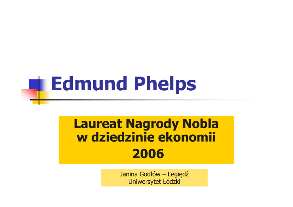 Edmund Phelps Laureat Nagrody Nobla w dziedzinie ekonomii 2006 Janina Godłów – Legiędź Uniwersytet Łódzki Nagroda Nobla w dziedzinie ekonomii Ustanowiona w 1968 r. przez Centralny Bank Szwecji Pierwsi laureaci w 1969 r.: Ragnar Frisch i Jan Tinbergen Medal: Dyplom, który otrzymał Edmund Phelps: http://nobelprize.org/nobel_prizes/economics/medal.html http://nobelprize.org/nobel_prizes/economics/laureates/2006/phelpsdiploma.html Edmund Phelps 58. laureatem 1969 – 2006; 38 nagród 58 laureatów E. Phelps jest 21. laureatem, który otrzymał samodzielnie Nagrodę; czternastokrotnie był dwóch laureatów, trzykrotnie trzech http://nobelprize.org/nobel_prizes/economics/laureates/ Wartość nominalna Nagrody Nobla (w koronach szwedzkich) 1901 1923 1969 od 2001 150 782 114 935 375 000 10 000 000 http://nobelprize.org/nobel_prizes/amounts.html Wykres umieszczony w witrynie Fundacji Noblowskiej pozwala śledzić zmiany nominalnej i realnej wartości Nagrody Z wykresu http://nobelprize.org/nobel_prizes/amounts.html moŜemy odczytać, Ŝe Wartość Nagrody przyznanej w 1901 r. wyraŜona w koronach szwedzkich z roku 2006 wynosiła 7 mln Do początku lat 50. realna wartość Nagrody ulegała znaczącym wahaniom, dominował ruch spadkowy – wartość realna Nagrody przyznanej w 1953 r. stanowiła ok. 28% wartości początkowej. Dynamiczny wzrost wartości nominalnej i realnej Nagrody ma miejsce od 1980 r. W 1991 r. wartość realna Nagrody osiągnęła poziom z roku 1901, a kwota, którą laureaci otrzymali w 2006 r. jest realnie o ok.. 40% wyŜsza od pierwszej Nagrody Wartość Nagrody Nobla w ujęciu nominalnym i realnym Copyright © The Nobel Foundation 2006 „Mamy wspaniałe Ŝycie”. Dwie pasje: muzyka i ekonomia Dwaj idole: Harry James i Paul Samuelson Nauczyciele Viviana Podręczniki, banki centralne „Nie pracuję dla nagród, ani pieniędzy” „Mamy wspaniałe Ŝycie” – zdanie z przemówienia E. Phelpsa. to Dwie pasje: muzyka i ekonomia (jako nastolatek grał na trąbce) Dwaj idole: Harry James i Paul Samuelson Nauczyciele z róŜnych szkół ekonomii – to dobra podstawa badań naukowych Największe odkrycie: Ŝona Viviana Idee trafiają do podręczników i stają się podstawą działania banków centralnych „Nie pracuję dla nagród, ani pieniędzy” Edmund S. Phelps delivering his banquet speech. Copyright © Nobel Web AB 2006 Photo: Hans Mehlin Wykład 8.12.2006 Copyright © Nobel Web AB 2006 Photo: Mirek Labedzki Za co Edmund Phelps otrzymał Nagrodę Nobla? Oficjalne uzasadnienie Komitetu Noblowskiego: „ za analizę międzyokresowych zaleŜności w polityce makroekonomicznej”. „Dzieło Edmunda Phelpsa przyczyniło się do pogłębienia rozumienia związku między krótkookresowymi i długookresowymi skutkami polityki ekonomicznej. Jego wkład miał wielki wpływ zarówno na badania ekonomiczne jak i politykę.” http://nobelprize.org/nobel_prizes/economics/laureates/2006/pr ess.html Główne kierunki badań Phelpsa Teoria wyjaśniająca zaleŜność między inflacją a bezrobociem Naturalna stopa bezrobocia Złota reguła akumulacji kapitału Źródło: http://www.britannica.com/eb/art-92485 Na czym polega znaczenie teorii E. Phelpsa? Wyjaśnienie relacji między celami polityki ekonomicznej (wzrost gospodarczy, niskie bezrobocie, niska inflacja) Wkład do sporu, czy polityka pienięŜna moŜe być skutecznym narzędziem realizacji wzrostu gospodarczego i obniŜania bezrobocia Zrozumienie znaczenia wkładu Phelpsa wymaga przedstawienia wcześniejszego stanu wiedzy ekonomicznej na temat relacji między inflacją a bezrobociem Nie ma sprzeczności między pełnym zatrudnieniem a stabilnym poziomem cen John M. Keynes 1883 -1946 Wielki kryzys 1929 -1933 i tzw. rewolucja keynesowska Polityka sterowania globalnym popytem pozwala zapewnić pełne zatrudnienie bez powodowania inflacji A. Phillips, (1958) Związek między stopą bezrobocia i stopą zmiany płac nominalnych w Wielkiej Brytanii w latach 1861-1957 Stopa zmiany płac nominalnych jest funkcją bezrobocia I = f (B) Oryginalna krzywa Phillipsa Stopa zmian płac nominalnych Stopa bezrobocia Spadkowi stopy bezrobocia towarzyszy wzrost stopy wzrostu płac nominalnych Krzywa Phillipsa – interpretacja Samuelsona i Solowa Stopa inflacji Stopa bezrobocia P.A. Samuelson i R. M. Solow (Analytical Aspects of AntiInflation Policy, 1960) – teza o istnieniu funkcyjnej zaleŜności między tempem wzrostu płac nominalnych i tempem wzrostu cen Krzywa Phillipsa jako ujemna zaleŜność między stopą bezrobocia a stopą inflacji. Polityka ekonomiczna oparta na krzywej Phillipsa Krzywa Phillipsa przedstawia zbiór moŜliwych kombinacji bezrobocia i inflacji („karta dań” dla polityków) Wniosek: Polityka łatwego pieniądza moŜe być środkiem zmniejszania bezrobocia Wkład Phelpsa Nowe ujęcie krzywej Phillipsa – znaczenie oczekiwań inflacyjnych Koncepcja naturalnej stopy bezrobocia Zakwestionowanie poglądu, Ŝe wyŜsza inflacja jest antidotum na bezrobocie Phelps, E. S. (1967), Phillips Curves, Expectations of Inflation and Optimal Unemployment over Time, Economica, Vol. 34, 254-281. Phelps, E. S. (1968a), Money-Wage Dynamics and Labor-Market Equilibrium, Journal of Political Economy, Vol. 76, 678-711. Phelps, E. S. (1994), Structural Slumps: The Modern Equilibrium Theory of Employment, Interest and Assets, Cambridge, MA: Harvard University Press. Krzywa Phillipsa z oczekiwaniami inflacyjnymi Z perspektywy długookresowej gospodarka zmierza do naturalnej stopy bezrobocia Ceną obniŜenia stopy bezrobocia jest nie tylko wzrost inflacji dzisiaj, ale takŜe wyŜsza inflacja w przyszłości i „gorsza karta dań w przyszłości” Inflacja % I =f(B) I = f(B) + I 10 E 6 3 2,5% 5% Bezrobocie Teoria a empiria Teoria naturalnej stopy bezrobocia jest wynikiem niezaleŜnie prowadzonych badań Phelpsa i Friedmana opublikowanych w latach 1967-68: Phelps, E. S. (1967), Phillips Curves, Expectations of Inflation and 