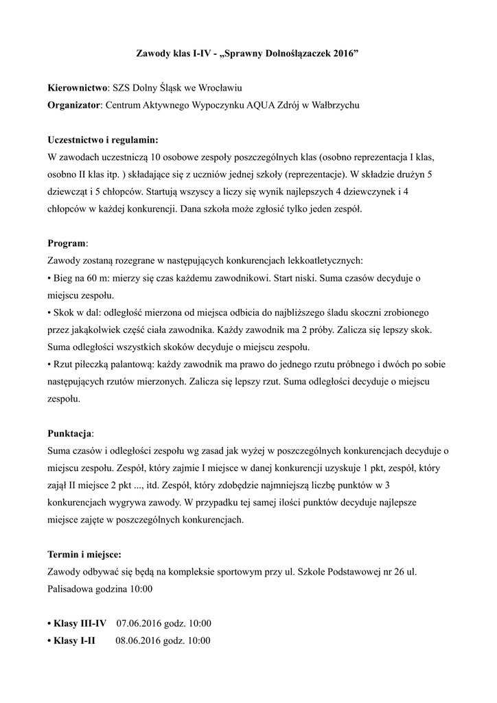 Zawody klas I-IV - „Sprawny Dolnoślązaczek 2016” Kierownictwo: SZS Dolny Śląsk we Wrocławiu Organizator: Centrum Aktywnego Wypoczynku AQUA Zdrój w Wałbrzychu Uczestnictwo i regulamin: W zawodach uczestniczą 10 osobowe zespoły poszczególnych klas (osobno reprezentacja I klas, osobno II klas itp. ) składające się z uczniów jednej szkoły (reprezentacje). W składzie drużyn 5 dziewcząt i 5 chłopców. Startują wszyscy a liczy się wynik najlepszych 4 dziewczynek i 4 chłopców w każdej konkurencji. Dana szkoła może zgłosić tylko jeden zespół. Program: Zawody zostaną rozegrane w następujących konkurencjach lekkoatletycznych: • Bieg na 60 m: mierzy się czas każdemu zawodnikowi. Start niski. Suma czasów decyduje o miejscu zespołu. • Skok w dal: odległość mierzona od miejsca odbicia do najbliższego śladu skoczni zrobionego przez jakąkolwiek część ciała zawodnika. Każdy zawodnik ma 2 próby. Zalicza się lepszy skok. Suma odległości wszystkich skoków decyduje o miejscu zespołu. • Rzut piłeczką palantową: każdy zawodnik ma prawo do jednego rzutu próbnego i dwóch po sobie następujących rzutów mierzonych. Zalicza się lepszy rzut. Suma odległości decyduje o miejscu zespołu. Punktacja: Suma czasów i odległości zespołu wg zasad jak wyżej w poszczególnych konkurencjach decyduje o miejscu zespołu. Zespół, który zajmie I miejsce w danej konkurencji uzyskuje 1 pkt, zespół, który zajął II miejsce 2 pkt ..., itd. Zespół, który zdobędzie najmniejszą liczbę punktów w 3 konkurencjach wygrywa zawody. W przypadku tej samej ilości punktów decyduje najlepsze miejsce zajęte w poszczególnych konkurencjach. Termin i miejsce: Zawody odbywać się będą na kompleksie sportowym przy ul. Szkole Podstawowej nr 26 ul. Palisadowa godzina 10:00 • Klasy III-IV 07.06.2016 godz. 10:00 • Klasy I-II 08.06.2016 godz. 10:00