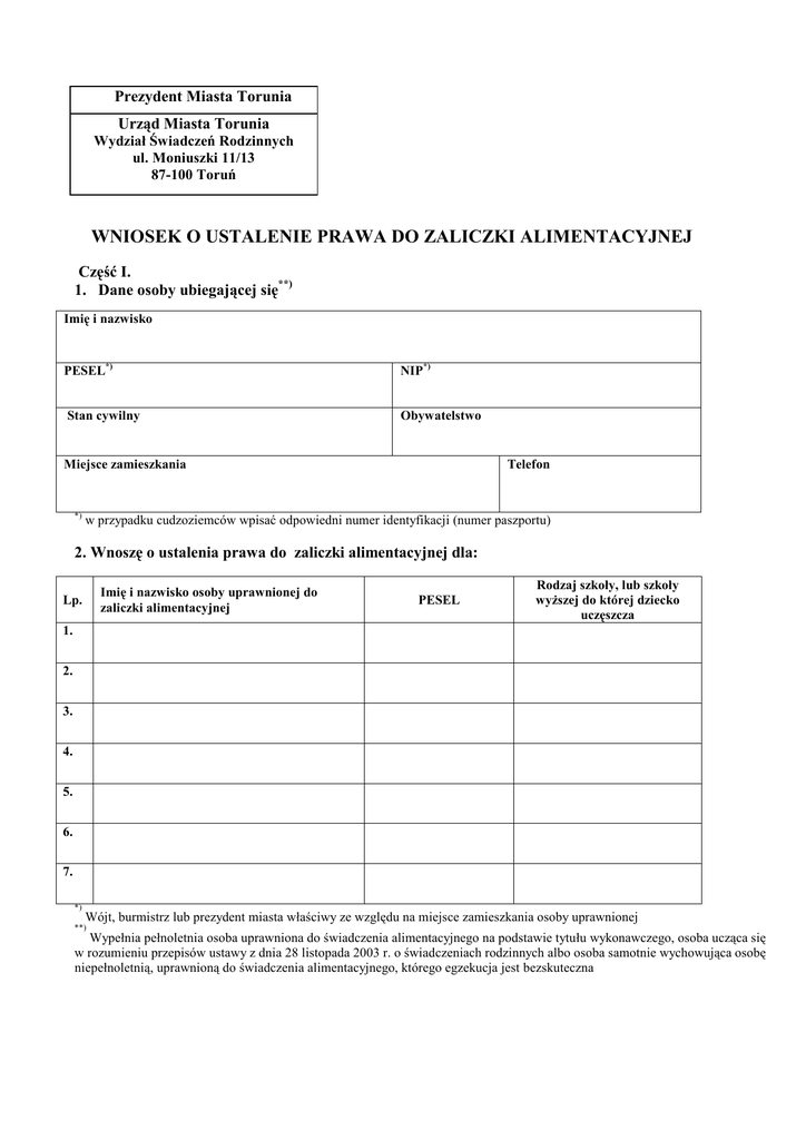 Prezydent Miasta Torunia Urząd Miasta Torunia Wydział Świadczeń Rodzinnych ul. Moniuszki 11/13 87-100 Toruń WNIOSEK O USTALENIE PRAWA DO ZALICZKI ALIMENTACYJNEJ Część I. 1. Dane osoby ubiegającej się**) Imię i nazwisko PESEL*) NIP*) Stan cywilny Obywatelstwo Miejsce zamieszkania *) Telefon w przypadku cudzoziemców wpisać odpowiedni numer identyfikacji (numer paszportu) 2. Wnoszę o ustalenia prawa do zaliczki alimentacyjnej dla: Imię i nazwisko osoby uprawnionej do zaliczki alimentacyjnej Lp. PESEL Rodzaj szkoły, lub szkoły wyŜszej do której dziecko uczęszcza 1. 2. 3. 4. 5. 6. 7. *) Wójt, burmistrz lub prezydent miasta właściwy ze względu na miejsce zamieszkania osoby uprawnionej **) Wypełnia pełnoletnia osoba uprawniona do świadczenia alimentacyjnego na podstawie tytułu wykonawczego, osoba ucząca się w rozumieniu przepisów ustawy z dnia 28 listopada 2003 r. o świadczeniach rodzinnych albo osoba samotnie wychowująca osobę niepełnoletnią, uprawnioną do świadczenia alimentacyjnego, którego egzekucja jest bezskuteczna 3. Dane członków rodziny ( w tym dzieci do ukończenia 25 lat, a takŜe dziecka, które ukończyło 25 rok Ŝycia legitymującego się orzeczeniem o znacznym stopniu niepełnosprawności, jeŜeli w związku z tą niepełnosprawnością rodzinie przysługuje świadczenie pielęgnacyjne; do członków rodziny nie zalicza się dziecka znajdującego się pod opieką opiekuna prawnego) (art. 3 pkt. 16 ustawy o świadczeniach rodzinnych) W skład rodziny wchodzą: 1 ......................................................................................................................................................................................... ( imię i nazwisko stopień pokrewieństwa PESEL* ) 2 ......................................................................................................................................................................................... ( imię i nazwisko stopień pokrewieństwa PESEL* ) 3 ......................................................................................................................................................................................... ( imię i nazwisko stopień pokrewieństwa PESEL* ) 4 ......................................................................................................................................................................................... ( imię i nazwisko stopień pokrewieństwa PESEL* ) 5 ......................................................................................................................................................................................... ( imię i nazwisko *) stopień pokrewieństwa PESEL* ) W przypadku cudzoziemców wpisać odpowiedni numer identyfikacji (numer paszportu) 4. Inne dane 4.1 Łączna kwota alimentów świadczonych przez członków rodziny na rzecz innych osób wyniosła w roku ................. *) ............... zł.....gr 4.2 Łączna kwota opłat poniesionych z tytułu przebywania członka rodziny w instytucji zapewniającej całodobowe utrzymanie w roku ................. *) wyniosła ............zł.....gr 4.3 Dochód utracony z roku .................*) miesięcznie wyniósł ............... zł.....gr 4.4 Dochód uzyskany w roku .............. *) miesięcznie wyniósł ............... zł.....gr ) * Wpisać rok, z którego dochód stanowi podstawę ustalenia dochodu rodziny (art. 3 pkt 2 ustawy o świadczeniach rodzinnych) Część II. 1. Oświadczenie słuŜące ustaleniu prawa do zaliczki alimentacyjnej (oświadcza osoba ubiegająca się o zaliczkę alimentacyjną w imieniu osoby uprawnionej) Oświadczam, Ŝe: - powyŜsze dane są prawdziwe, - zapoznałam/em się z warunkami uprawniającymi do zaliczki alimentacyjnej, - dziecko/dzieci, na które ubiegam się o zaliczkę alimentacyjną nie pozostaje/ją w związku małŜeńskim ani nie przebywa/ją w rodzinie zastępczej, instytucji zapewniającej całodobowe utrzymanie, tj. domu pomocy społecznej, placówce opiekuńczo wychowawczej, młodzieŜowym ośrodku wychowawczym, schronisku dla nieletnich, zakładzie poprawczym, areszcie śledczym, zakładzie karnym, zakładzie opiekuńczo-leczniczym, zakładzie pielęgnacyjno–opiekuńczym, a takŜe szkole wojskowej lub innej szkole zapewniającej nieodpłatnie pełne utrzymanie, w tym wyŜywienie, zakwaterowanie i umundurowanie, - dziecko/dzieci, na które ubiegam się o zaliczkę alimentacyjną nie jest/są uprawnione do zasiłku rodzinnego na własne dziecko, - jestem panną/kawalerem/osobą pozostającą w separacji /osobą rozwiedzioną/wdową/wdowcem*), - nie wychowuję dziecka razem z ojcem/ matką dziecka*). ...................................................... (data podpis osoby ubiegającej się) ) * Niepotrzebne skreślić 2. Oświadczenie słuŜące ustaleniu prawa do zaliczki alimentacyjnej (oświadcza pełnoletnia osoba uprawniona, ubiegająca się o zaliczkę alimentacyjną oraz osoba ucząca się) Oświadczam, Ŝe: - powyŜsze dane są prawdziwe, - zapoznałam/em się z warunkami uprawniającymi do zaliczki alimentacyjnej, - nie pozostaję w związku małŜeńskim ani nie przebywam w instytucji zapewniającej całodobowe utrzymanie, tj. domu pomocy społecznej, placówce opiekuńczo wychowawczej, młodzieŜowym ośrodku wychowawczym, schronisku dla nieletnich, zakładzie poprawczym, areszcie śledczym, zakładzie karnym, zakładzie opiekuńczo-leczniczym, zakładzie pielęgnacyjno–opiekuńczym, a takŜe szkole wojskowej lub innej szkole zapewniającej nieodpłatnie pełne utrzymanie, w tym wyŜywienie, zakwaterowanie i umundurowanie, - nie jestem uprawniona/ny do zasiłku rodzinnego na własne dziecko, - osoba, która mnie wychowuje jest panną/kawalerem/osobą pozostającą w separacji /osobą rozwiedzioną/ wdową/wdowcem*) oraz nie wychowuje dziecka razem z ojcem/ matką dziecka*). ...................................................... (data podpis osoby 