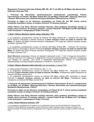 Regulamin Promocji Internetu Pakiety MP, M+, M i P od 200 do 20 Mbps dla Abonentów Internetu i/lub bez TVK. I. Promocja dla Abonentów zainteresowanych zwiększeniem posiadanego Pakietu Internetowego do Pakietu 100 Mbps (Pakiet M+) lub 200 Mbps (Pakiet MP). Obejmuje Obecnych i Nowych Abonentów sieci telekomunikacyjnej Spółdzielni Mieszkaniowej „Północ”. Promocją tą objęci są też Abonenci posiadający już Pakiet M+ lub MP, którzy zechcą przedłużyć posiadane umowy na kolejne minimum 18 miesięcy płatnych. Każdy Obecny oraz Nowy Abonent naszego Internetu, który podpisze (przedłuży) umowę na kolejny okres minimum 18 miesięcy płatnych i zamówi Pakiet M+ (100 Mbps) lub MP (200 Mbps) może skorzystać z następujących Super Promocji: 1. Nowi i Obecni Abonenci dwóch usług: Internetu i TVK a. po podpisaniu (przedłużeniu) umowy na Internet 100 Mbps (Pakiet M+) i Cyfrową TVK (minimum Pakiet Startowy) otrzymają w ramach Promocji 4 pełne miesiące wolne od opłat za Internet 100 Mbps. W ramach tej Super Promocji Abonenci Analogowej TVK mogą bez żadnych kosztów przejść na odbiór Cyfrowej TVK. b. po podpisaniu (przedłużeniu) umowy na Internet 200 Mbps (Pakiet MP) i Cyfrową TVK (minimum Pakiet Startowy) otrzymają w ramach Promocji 6 pełnych miesięcy wolnych od opłat za Internet 200 Mbps. W ramach tej Super Promocji Abonenci Analogowej TVK mogą bez żadnych kosztów przejść na odbiór Cyfrowej TVK. Nowi Abonenci zawierający Umowy na zasadach opisanych w pkt. I.1 lub I.2 mogą też skorzystać z Promocji Cyfrowej TVK opisanych w Regulaminu Promocji Telewizji Kablowej Cyfrowej i Analogowej oraz dostępu do Internetu „Lato 2016” w Spółdzielni Mieszkaniowej „Północ” w Częstochowie zatwierdzonego Uchwałą Zarządu Spółdzielni nr 40/2016 z 19.04.2016 r. 2. Nowi i Obecni Abonenci tylko Internetu (nie korzystający z naszej TVK) a. mogą zacząć korzystać z TVK i Promocji z pkt. I.1 i I.2 b. po podpisaniu (przedłużeniu) umowy na Internet 100 Mbps (Pakiet M+) otrzymają w ramach Promocji 3 pełne miesiące wolne od opłat za Internet 100 Mbps. Podstawowa opłata miesięczna za Internet 100 Mbps wynosi 49 zł. c. po podpisaniu (przedłużeniu) umowy na Internet 200 Mbps (Pakiet MP) otrzymają w ramach Promocji 5 pełnych miesięcy wolnych od opłat za Internet 200 Mbps. Podstawowa opłata miesięczna za Internet 200 Mbps wynosi 59 zł. II. Promocja dla Abonentów zainteresowanych Pakietem Internetowym M lub P z prędkościami do 50 Mbps i do 20 Mbps. Obejmuje Obecnych i Nowych Abonentów sieci telekomunikacyjnej Spółdzielni Mieszkaniowej „Północ”. Promocją tą objęci są też Abonenci posiadający już Pakiet M lub P, którzy zechcą przedłużyć posiadane umowy na kolejne minimum 18 miesięcy płatnych. Każdy Obecny oraz Nowy Abonent naszego Internetu, który podpisze (przedłuży) umowę na kolejny okres minimum 18 miesięcy płatnych i zamówi Pakiet M (do 50 Mbps) lub P (20 Mbps) może skorzystać z następujących Super Promocji: 1. Nowi i Obecni Abonenci Internetu i TVK a. po podpisaniu (przedłużeniu na kolejne 18 m-cy płatnych) umowy na Internet Pakiet M i Cyfrową TVK (minimum Pakiet Startowy) otrzymają w ramach Promocji 3 pełne miesiące wolne od opłat za Internet. W ramach tej Super Promocji Abonenci Analogowej TVK mogą bez żadnych kosztów przejść na odbiór Cyfrowej TVK. b. po podpisaniu (przedłużeniu na kolejne 18 m-cy płatnych) umowy na Internet Pakiet P i Cyfrową TVK (minimum Pakiet Startowy) otrzymają w ramach Promocji 2 pełne miesiące wolne od opłat za Internet. W ramach tej Super Promocji Abonenci Analogowej TVK mogą bez żadnych kosztów przejść na odbiór Cyfrowej TVK. 2. Nowi i Obecni Abonenci Internetu (nie korzystający z naszej TVK) a. mogą zacząć korzystać z TVK i odpowiednich Promocji ujętych w punktach powyżej. b. po przedłużeniu na kolejne 18 m-cy płatnych umowy na Internet Pakiet M otrzymają w ramach Promocji 2 pełne miesiące wolne od opłat za Internet. Podstawowa opłata miesięczna za Internet Pakiet M wynosi 40 zł. c. po przedłużeniu na kolejne 18 m-cy płatnych umowy na Internet Pakiet P otrzymają w ramach Promocji 1 pełny miesiąc wolny od opłat za Internet. Podstawowa opłata miesięczna za Internet Pakiet P wynosi 28 zł. Podane ceny Internetu dotyczą Abonentów naszej sieci TVK. Osoby nie korzystające z naszej sieci płacą dodatkowo za utrzymanie linii telekomunikacyjnej - 6 zł. miesięcznie. Wszystkie w/w Promocje są dostępne dla Nowych Abonentów oraz dla Obecnych Abonentów jedynie utrzymujących lub zwiększających posiadany Pakiet Internetowy. Nie dotyczą Obecnych Abonentów zmniejszających posiadany Pakiet Internetowy. Promocje dla Nowych Abonentów korzystających z TVK są dostępne przy jednoczesnym podpisaniu obydwu Umów (na Internet i TVK) na warunkach tej Promocji a dla Obecnych Abonentów przy jednoczesnym anektowaniu obydwu w/w Umów na warunkach tej Promocji. Nowi Abonenci zawierający Umowy na zasadach opisanych w pkt. I.1 lub II.1 mogą też skorzystać z Promocji Cyfrowej TVK opisanych w Regulaminu Promocji Telewizji Kablowej Cyfrowej i Analogowej oraz dostępu do Internetu „Lato 2016” w Spółdzielni Mieszkaniowej „Północ” w Częstochowie zatwierdzonego Uchwałą Zarządu Spółdzielni nr 40/2016 z 19.04.2016 r. Za niedotrzymanie warunków Promocji obowiązywałyby zapisy paragrafu 4 w/w Uchwały. Proponujemy wprowadzenie Promocji od dnia 01.10.2016 r. do dnia 30.11.2016 r. W przypadku zainteresowania Promocja zostanie przedłużona w miarę potrzeb na podstawie kolejnego wniosku. Wszystkie w/w Promocje dotyczą wszystkich Obecnych Abonentów Internetu bez względu na posiadany Pakiet Internetowy a także na czas kiedy zawarta została z nami Umowa na świadczenie usług. Tym samym po wprowadzeniu w/w Promocji ulegają zmianie transfery pobierania danych z Internetu podane w punktach I.4 i I.5 obowiązującego w Sp