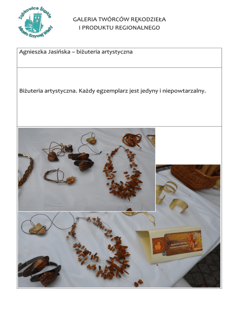 GALERIA TWÓRCÓW RĘKODZIEŁA I PRODUKTU REGIONALNEGO Agnieszka Jasińska – biżuteria artystyczna Biżuteria artystyczna. Każdy egzemplarz jest jedyny i niepowtarzalny.