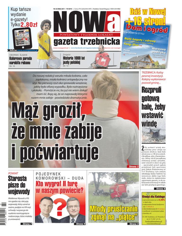 Tylko Nr 22 (966) 26 V – 1 VI 2015 | Cena z TV: 3,50 zł (5% VAT) | Redaktor: Daniel Długosz | ISSN1234-4982 '() 1 Nr 22 (966) 26 V – 1 VI 2015 | www.nowagazeta.pl +16 stron! Dom i o Czerwiec 2015 Dodatek bud owlano-ogrod niczy NOWa ' () gazeta trzebnicka gród !"#$ %& -+ "0" *1 s. 10 www.nowagazeta.pl | www.facebook.com/gazeta.trzebnicka | Codziennie coś nowego! Info na www.nowagazeta.pl 2%251,.,¥/k6.,( ¿PLJUöG Kolorowa parada Historia 1000 lat jazdy polskiej s. 15 6WU TRZEBNICA: Kulisy pewnej inwestycji. Kolejny wykonawca pozwał gminę... Do naszej redakcji weszła młoda kobieta, cała zapłakana, miała kołnierz ortopedyczny na szyi. Na pierwszy rzut oka sprawiała wrażenie, jakby była ofiarą wypadku. Była roztrzęsiona i płakała. - Pomóżcie mi, bo już nie wiem dokąd mam iść. Boją się, że on naprawdę którymś razem mnie zabije - powiedziała dramatycznie. ! " #" $ Strona 5 POWIAT POJEDYNEK KOMOROWSKI – DUDA Starosta pisze do wojewody Waldemar Wysocki z PiS nie zgadza się z decyzją wojewody, który uznał za ważne, podjęte na VIII sesji uchwały i wzywa go do wydania rozstrzygnięcia nadzorczego, które miałoby je unieważnić. Strona 7 !"* +, "*-. / s. 2 Strona 8 %DQN6SyáG]LHOF]\ Z7U]HEQLF\ $ %& Strona 9 ! " #$ #% && ' '# % !" # ""$ % "" Strona 4 • oprocentowanie już od 4,90% w skali roku • maksymalna kwota kredytowania 75 000,00 zł • okres kredytowania do 60 miesięcy • możliwość wcześniejszej spłaty • dowolny cel 55-100 Trzebnica, ul. Prusicka 1 tel. 0-71/387-43-33, [email protected] www.bstrzebnica.pl REKLAMA 6WU Warzywa Domy ekologiczn e 1