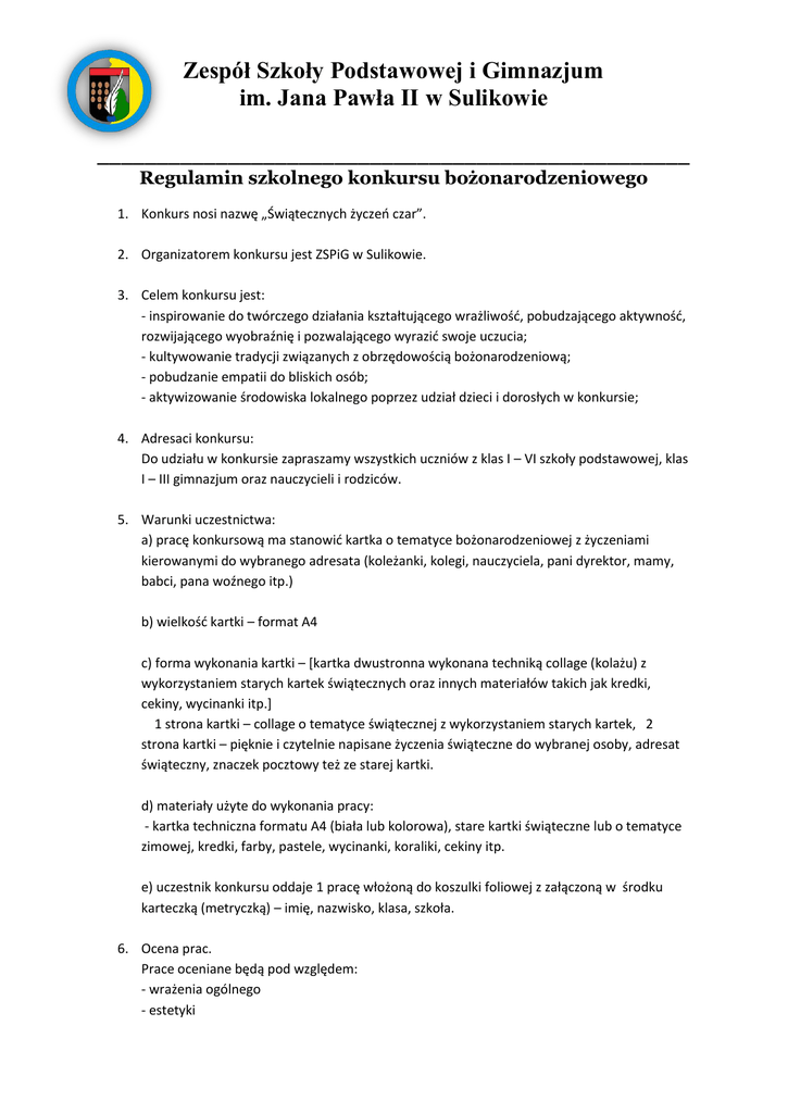 Zespół Szkoły Podstawowej i Gimnazjum im. Jana Pawła II w Sulikowie __________________________________________________ Regulamin szkolnego konkursu bożonarodzeniowego 1. Konkurs nosi nazwę „Świątecznych życzeń czar”. 2. Organizatorem konkursu jest ZSPiG w Sulikowie. 3. Celem konkursu jest: - inspirowanie do twórczego działania kształtującego wrażliwość, pobudzającego aktywność, rozwijającego wyobraźnię i pozwalającego wyrazić swoje uczucia; - kultywowanie tradycji związanych z obrzędowością bożonarodzeniową; - pobudzanie empatii do bliskich osób; - aktywizowanie środowiska lokalnego poprzez udział dzieci i dorosłych w konkursie; 4. Adresaci konkursu: Do udziału w konkursie zapraszamy wszystkich uczniów z klas I – VI szkoły podstawowej, klas I – III gimnazjum oraz nauczycieli i rodziców. 5. Warunki uczestnictwa: a) pracę konkursową ma stanowić kartka o tematyce bożonarodzeniowej z życzeniami kierowanymi do wybranego adresata (koleżanki, kolegi, nauczyciela, pani dyrektor, mamy, babci, pana woźnego itp.) b) wielkość kartki – format A4 c) forma wykonania kartki – [kartka dwustronna wykonana techniką collage (kolażu) z wykorzystaniem starych kartek świątecznych oraz innych materiałów takich jak kredki, cekiny, wycinanki itp.] 1 strona kartki – collage o tematyce świątecznej z wykorzystaniem starych kartek, 2 strona kartki – pięknie i czytelnie napisane życzenia świąteczne do wybranej osoby, adresat świąteczny, znaczek pocztowy też ze starej kartki. d) materiały użyte do wykonania pracy: - kartka techniczna formatu A4 (biała lub kolorowa), stare kartki świąteczne lub o tematyce zimowej, kredki, farby, pastele, wycinanki, koraliki, cekiny itp. e) uczestnik konkursu oddaje 1 pracę włożoną do koszulki foliowej z załączoną w środku karteczką (metryczką) – imię, nazwisko, klasa, szkoła. 6. Ocena prac. Prace oceniane będą pod względem: - wrażenia ogólnego - estetyki Zespół Szkoły Podstawowej i Gimnazjum im. Jana Pawła II w Sulikowie __________________________________________________ - sposobu i trwałości wykonania - różnorodności materiałów - oryginalności - zgodności z tematem 7. Terminy. a) ogłoszenie konkursu – 18.11.13 (poniedziałek) b) dostarczanie prac – do 13.12.13 (piątek) do pracowni sztuki w gimnazjum, n – la plastyki I. Kusiak lub do świetlicy szkolnej c) ogłoszenie wyników i wręczenie nagród podczas bożonarodzeniowego apelu w dniu 20.12.13 (piątek) 8. Wszystkie prace wystawione będą do przeglądu na holu w gimnazjum. 9. Dodatkowe informacje u p. I. Kusiak lub pań ze świetlicy – K. Smoch, M. Andziak. Serdecznie zapraszamy do udziału w konkursie.