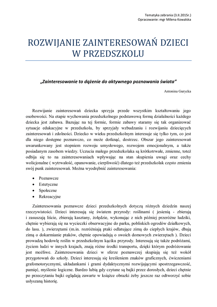 Tematyka zebrania (3.II.2015r.) Opracowanie: mgr Milena Kowalska ROZWIJANIE ZAINTERESOWAN DZIECI W PRZEDSZKOLU „Zainteresowanie to dążenie do aktywnego poznawania świata” Antonina Gurycka Rozwijanie zainteresowań dziecka sprzyja przede wszystkim kształtowaniu jego osobowości. Na etapie wychowania przedszkolnego podstawową formą działalności każdego dziecka jest zabawa. Bazując na tej formie, formie zabawy staramy się tak organizować sytuacje edukacyjne w przedszkolu, by sprzyjały wzbudzaniu i rozwijaniu dziecięcych zainteresowań i zdolności. Dziecko w wieku przedszkolnym interesuje się tylko tym, co jest dla niego dostępne poznawczo, co może dotknąć, dostrzec. Obszar jego zainteresowań uwarunkowany jest stopniem rozwoju umysłowego, rozwojem emocjonalnym, a także posiadanym zasobem wiedzy. Uczucia małego przedszkolaka są krótkotrwałe, zmienne, toteż odbija się to na zainteresowaniach wpływając na stan skupienia uwagi oraz cechy wolicjonalne ( wytrwałość, opanowanie, cierpliwość) dlatego też przedszkolak często zmienia swój punk zainteresowań. Można wyodrębnić zainteresowania: Poznawcze Estetyczne Społeczne Rekreacyjne Zainteresowania poznawcze dzieci przedszkolnych dotyczą różnych dziedzin naszej rzeczywistości. Dzieci interesują się światem przyrody: roślinami ( jesienią - zbierają i zasuszają liście, zbierają kasztany, żołędzie, wykonując z nich później przeróżne ludziki, chętnie wybierają się na wycieczki obserwacyjne do parku, pobliskich ogrodów działkowych, do lasu. ), zwierzętami (m.in. rozróżniają ptaki odlatujące zimą do ciepłych krajów, dbają zimą o dokarmianie ptaków, chętnie opowiadają o swoich domowych zwierzętach ). Dzieci prowadzą hodowlę roślin w przedszkolnym kąciku przyrody. Interesują się także podróżami, życiem ludzi w innych krajach, znają różne środki transportu, dzięki którym podróżowanie jest możliwe. Zainteresowania dzieci w sferze poznawczej skupiają się też wokół przygotowań do szkoły. Dzieci interesują się kreśleniem znaków graficznych, ćwiczeniami grafomotorycznymi, układankami i grami dydaktycznymi rozwijającymi spostrzegawczość, pamięć, myślenie logiczne. Bardzo lubią gdy czytane są bajki przez dorosłych, dzieci chętnie po przeczytaniu bajki oglądają zawarte w książce obrazki żeby jeszcze raz odtworzyć sobie usłyszaną historię. Tematyka zebrania (3.II.2015r.) Opracowanie: mgr Milena Kowalska Ważne miejsce w działalności przedszkola zajmuje wychowanie estetyczne. Dzieci bardzo chętnie podejmują działalność plastyczno-konstrukcyjną, szczególnie ich zainteresowanie budzą niekonwencjonalne techniki plastyczne, jak malowanie palcami, modelowanie w masie solnej, rysowanie kolorową kredą lub techniką "origami", malowanie patykiem na piasku czy frotaż. Do zainteresowań estetycznych należą również bardzo lubiane przez dzieci zabawy konstrukcyjne wśród nich dominują zabawy klockami, z których powstają wspaniałe przestrzenne konstrukcje, które są zawsze umieszcza na wystawie w sali. Dzieci w wieku przedszkolnym interesują się również muzyką, bardzo chętnie uczą się pląsów, zabaw ze śpiewem, zabaw muzyczno-ruchowych. Śpiewają różnorodne piosenkichętnie przedstawiają je podczas przedszkolnych uroczystości, próbują odtwarzać rymy i proste melodie na instrumentach, tańczyć. Twórcze obcowanie z muzyką przynosi dzieciom nie tylko radość, ale również ułatwia kontakty z otoczeniem, rozwija osobowość, zaspokaja naturalną potrzebę ruchu i rozładowuje wewnętrzne napięcia. Dużym zainteresowaniem cieszą się także zabawy w "teatr". Dzieci same wymyślają historyki, które pragną przedstawić, bawią się kukiełkami, wymyślają stroje, dzielą się rolami, malują dekoracje. Dzieci w tym wieku interesują się czasem również literaturą dziecięcą, chętnie sięgają po książki, które same oglądają, albo czytają z pomocą osoby dorosłej. Przypominamy i zapraszamy do włączenie się w akcję „Cała Polska czyta dzieciom”, dziękujmy tym rodzicom, którzy brali już w niej udział. Największą różnorodnością odznaczają się zainteresowania rekreacyjne. Są one związane z ulubioną formą spędzania wolnego czasu, ich treść uzależniona jest w dużej mierze od środowiska domowego dziecka, w tym również od zainteresowań rodziców. W tej grupie wyróżnić można zainteresowania kolekcjonerskie, zainteresowania programami telewizyjnymi, grami komputerowymi oraz sportowe. Dzieci zbierają przeróżne obrazki, pocztówki kolorowe karteczki, figurki którymi się później wymieniają mgr Milena Kowalska Bibliografia: 1. A.Gurycka, Rozwój i kształtowanie zainteresowań- Warszawa 1978, WSiP. 2. M. Irzyniec, O zainteresowaniach dzieci w wieku przedszkolnym., "Wychowanie w Przedszkolu" 1997/4.