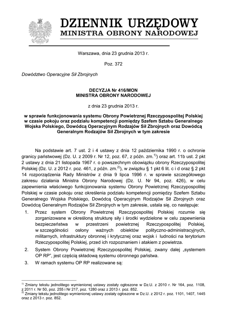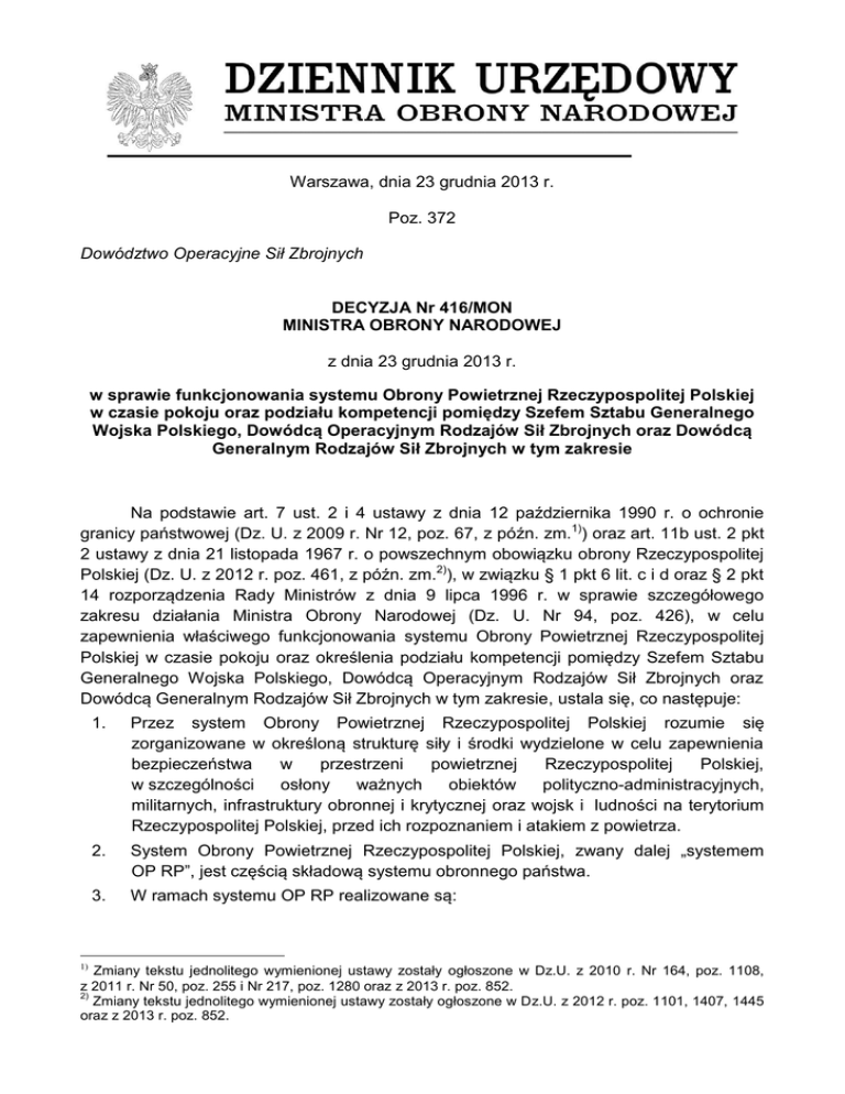 Warszawa, dnia 23 grudnia 2013 r. Poz. 372 Dowództwo Operacyjne Sił Zbrojnych DECYZJA Nr 416/MON MINISTRA OBRONY NARODOWEJ z dnia 23 grudnia 2013 r. w sprawie funkcjonowania systemu Obrony Powietrznej Rzeczypospolitej Polskiej w czasie pokoju oraz podziału kompetencji pomiędzy Szefem Sztabu Generalnego Wojska Polskiego, Dowódcą Operacyjnym Rodzajów Sił Zbrojnych oraz Dowódcą Generalnym Rodzajów Sił Zbrojnych w tym zakresie Na podstawie art. 7 ust. 2 i 4 ustawy z dnia 12 października 1990 r. o ochronie granicy państwowej (Dz. U. z 2009 r. Nr 12, poz. 67, z późn. zm.1)) oraz art. 11b ust. 2 pkt 2 ustawy z dnia 21 listopada 1967 r. o powszechnym obowiązku obrony Rzeczypospolitej Polskiej (Dz. U. z 2012 r. poz. 461, z późn. zm.2)), w związku § 1 pkt 6 lit. c i d oraz § 2 pkt 14 rozporządzenia Rady Ministrów z dnia 9 lipca 1996 r. w sprawie szczegółowego zakresu działania Ministra Obrony Narodowej (Dz. U. Nr 94, poz. 426), w celu zapewnienia właściwego funkcjonowania systemu Obrony Powietrznej Rzeczypospolitej Polskiej w czasie pokoju oraz określenia podziału kompetencji pomiędzy Szefem Sztabu Generalnego Wojska Polskiego, Dowódcą Operacyjnym Rodzajów Sił Zbrojnych oraz Dowódcą Generalnym Rodzajów Sił Zbrojnych w tym zakresie, ustala się, co następuje: 1. Przez system Obrony Powietrznej Rzeczypospolitej Polskiej rozumie się zorganizowane w określoną strukturę siły i środki wydzielone w celu zapewnienia bezpieczeństwa w przestrzeni powietrznej Rzeczypospolitej Polskiej, w szczególności osłony ważnych obiektów polityczno-administracyjnych, militarnych, infrastruktury obronnej i krytycznej oraz wojsk i ludności na terytorium Rzeczypospolitej Polskiej, przed ich rozpoznaniem i atakiem z powietrza. 2. System Obrony Powietrznej Rzeczypospolitej Polskiej, zwany dalej „systemem OP RP”, jest częścią składową systemu obronnego państwa. 3. W ramach systemu OP RP realizowane są: Zmiany tekstu jednolitego wymienionej ustawy zostały ogłoszone w Dz.U. z 2010 r. Nr 164, poz. 1108, z 2011 r. Nr 50, poz. 255 i Nr 217, poz. 1280 oraz z 2013 r. poz. 852. 2) Zmiany tekstu jednolitego wymienionej ustawy zostały ogłoszone w Dz.U. z 2012 r. poz. 1101, 1407, 1445 oraz z 2013 r. poz. 852. 1) 1) ochrona granicy państwowej w przestrzeni powietrznej Rzeczypospolitej Polskiej; 2) ochrona przestrzeni powietrznej Rzeczypospolitej Polskiej. 4. W czasie pokoju w ramach systemu OP RP pełni się całodobowe dyżury bojowe. 5. Szczegółowe zasady organizacji i pełnienia dyżurów bojowych w systemie OP RP określa „Instrukcja organizacji i pełnienia dyżurów bojowych w systemie Obrony Powietrznej”. 6. Dowódca Operacyjny Rodzajów Sił Zbrojnych odpowiada za zapewnienie funkcjonowania systemu OP RP, w tym celu: 1) organizuje system OP RP w uzgodnieniu z Szefem Sztabu Generalnego Wojska Polskiego oraz we współdziałaniu z Dowódcą Generalnym Rodzajów Sił Zbrojnych; 2) dowodzi operacyjnie siłami i środkami, wydzielonymi przez Dowódcę Generalnego Rodzajów Sił Zbrojnych do pełnienia dyżurów bojowych w systemie OP RP, przy pomocy Centrum Operacji Powietrznych – Dowództwa Komponentu Powietrznego, z zastrzeżeniem, że użycie sił i środków wydzielonych do Zintegrowanego Systemu Obrony Powietrznej i Przeciwrakietowej Organizacji Traktatu Północnoatlantyckiego (NATO Integrated Air and Missile Defence System - NATINAMDS) wymaga uzyskania zgody właściwego organu dowodzenia tego systemu; 3) realizuje zadania, wynikające z ustawy z dnia 12 października 1990 r. o ochronie granicy państwowej; 4) określa potrzeby dla zdolności operacyjnych systemu OP RP; 5) prowadzi dopuszczenia do pełnienia dyżurów bojowych oraz kontrole gotowości bojowej dyżurnych sił i środków systemu OP RP; 6) współpracuje z Szefem Obrony Cywilnej Kraju w zakresie funkcjonowania podsystemu ostrzegania i alarmowania wojsk i ludności cywilnej przed zagrożeniami z powietrza; 7) realizuje zadania związane z zobowiązaniami sojuszniczymi, koalicyjnymi i międzynarodowymi dotyczącymi obrony powietrznej, zgodnie z zakresem działania. 7. Szef Sztabu Generalnego Wojska Polskiego odpowiada za programowanie wieloletniego rozwoju Systemu Obrony Powietrznej w ramach planowania rozwoju zdolności operacyjnych Sił Zbrojnych RP. 8. Dowódca Generalny Rodzajów Sił Zbrojnych odpowiada za: 1) przygotowanie i wydzielenie sił i środków do realizacji zadań w ramach systemu OP RP; 2) realizację planu rozwoju Rzeczypospolitej Polskiej; Systemu Obrony Powietrznej Sił Zbrojnych 3) realizację zadań związanych zobowiązaniami sojuszniczymi, koalicyjnymi i międzynarodowymi dotyczącymi obrony powietrznej, zgodnie z zakresem działania; 4) prowadzenie analiz, uczestniczenie w prezentowaniu stanowiska resortu obrony narodowej i realizowanie zadań w obronie powietrznej, zgodnie z zakresem działania, w ramach prac Komitetu Obrony Powietrznej i Przeciwrakietowej Organizacji Traktatu Północnoatlantyckiego (NATO Air and Missile Defence Committee), a także w pracach komitetów i grup roboczych Organizacji Traktatu Północnoatlantyckiego, Unii Europejskiej i Rady NATO-Rosja. 9. Dyżurny Dowódca Obrony Powietrznej, kieruje działaniami Dyżurnej Służby Operacyjnej Centrum Operacji Powietrznych – Dowództwa Komponentu Powietrznego w zakresie nienaruszalności przestrzeni powietrznej Rzeczypospolitej Polskiej oraz wykonuje obowiązki narodowego przedstawiciela władz państwowych (National Governmental Authority - NGA) w Zintegrowanym Systemie Obrony Powietrznej i Przeciwrakietowej Organizacji Traktatu Północnoatlantyckiego (NATINAMDS). 10. Szczegółowe zadania oraz procedury działania Dyżurnego Dowódcy Obrony Powietrznej określa „Instrukcja organizacji i pełnienia dyżurów bojowych w systemie Obrony Powietrznej”. 11. Traci moc decyzja Nr Pf-2/MON Ministra Obrony Narodowej z dnia 8 lutego 1995 r. w sprawie utworzenia jednolitego systemu obrony powietrznej