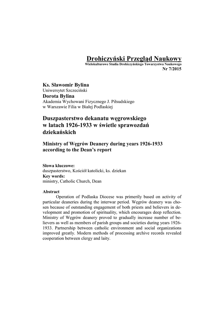 Drohiczyński Przegląd Naukowy Wielokulturowe Studia Drohiczyńskiego Towarzystwa Naukowego Nr 7/2015 Ks. Sławomir Bylina Uniwersytet Szczeciński Dorota Bylina Akademia Wychowani Fizycznego J. Piłsudskiego w Warszawie Filia w Białej Podlaskiej Duszpasterstwo dekanatu węgrowskiego w latach 1926-1933 w świetle sprawozdań dziekańskich Ministry of Węgrów Deanery during years 1926-1933 according to the Dean’s report Słowa kluczowe: duszpasterstwo, Kościół katolicki, ks. dziekan Key words: ministry, Catholic Church, Dean Abstract Operation of Podlaska Diocese was primerily based on activity of particular deaneries during the interwar period. Węgrów deanery was chosen because of outstanding engagement of both priests and believers in development and promotion of spirituality, which encourages deep reflection. Ministry of Węgrów deanery proved to gradually increase number of believers as well as members of parish groups and societies during years 19261933. Partnership between catholic environment and social organizations improved greatly. Modern methods of processing archive records revealed cooperation between clergy and laity. 248 Ks. Sławomir Bylina, Dorota Bylina Wstęp Omawiając zagadnienie duszpasterstwa parafialnego w dekanacie węgrowskim w latach 1926-1933 należy rozpocząć od stwierdzenia, że po zakończeniu pierwszej wojny światowej została wskrzeszona Diecezja Janowska czyli Podlaska1. Aktu wskrzeszenia dokonał papież Benedykt XV bullą Commissum humilitati Nostrae z dnia 24 września 1918 r.2. W nowo powstałej diecezji postanowiono utworzyć strukturę terytorialną na bazie 18 dekanatów, włącznie z dekanatem węgrowskim3. Stolicą dekanatu węgrowskiego było miasto Węgrów, gdzie w omawianym okresie posługę pełnili księża dziekani: Aleksander Wojdyna w latach 1926-19324, w 1932 r. ks. Bolesław Krasucki5 oraz ks. Kazimierz Czarkowski dziekan węgrowski w latach 1933-19686. W porównaniu do pozostałych części diecezji dekanat węgrowski nie zmienił znacznie swojej struktury administracyjnej. Ostatecznie podczas okresu międzywojennego liczył 11 parafii w 1918 r. i taką liczbą podsumował czas II Rzeczypospolitej. 1. Znaczenie sprawozdań dziekańskich Diecezji Podlaskiej w II Rzeczypospolitej Celem sprawozdań dziekańskich było wizytowanie poszczególnych parafii przez ks. dziekana, aby przekazać obiektywną wiedzę księdzu biskupowi. Tematem sprawozdań były zagadnienia funkcjonowania życia para1 W celu ujednolicenia nazwy diecezji w artykule użyto pojęcie Diecezji Podlaskiej, która od 1918 r. nosiła nazwę Diecezji Janowskiej czyli Podlaskiej, natomiast od 1924 r. określana była jako Diecezja Siedlecka czyli Podlaska. 2 Pius XI, „Bulla Commissum humilitati Nostrae” z 24 września 1918 r., „Wiadomości Diecezjalne Podlaskie”(dalej „WDP”) 1919 nr 2, s. 7-8. 3 Dekret Biskupa Podlaskiego Henryka Przeździeckiego No 38 z dnia 9 grudnia 1918 r., „WDP” 1918 nr 2, s. 20-21; P. Aleksandrowicz, Diecezja Siedlecka czyli Podlaska. W 150 rocznicę erekcji (1818-1968). Przyczynki i materiały do dziejów Diecezji Siedleckiej czyli Podlaskiej, Siedlce 1971, s. 203-205; S. Bylina, Relacje państwo – Kościół katolicki na Południowym Podlasiu w II Rzeczypospolitej, Drohiczyn 2013, s. 91; tenże, Podział terytorialny Diecezji Podlaskiej na tle kraju w latach 1918-1939, „Wiadomości Diecezjalne Siedleckie” 2011 nr 12, s. 541-557; R. Dmowski, Sieć dekanalna Kościoła katolickiego na terenie Diecezji Podlaskiej w latach 1918-1939, w: „Szkice Podlaskie”, 2004 z. 12, s. 125126; tenże, Unitis Viribus Diecezja Podlaska w II Rzeczypospolitej, Warszawa 2013, s. 84. 4 Por. Zmiany w składzie osobistym Duchowieństwa, „WDP” 1932 nr 1, s. 24. 5 Tamże. 6 http://parafia.to-my.pl/index.php?option=com_content&view=category&layout= blog&id=50&Itemid=48 [dostęp: 02.02.2015] Duszpasterstwo dekanatu węgrowskiego w latach 1926-1933… 249 fialnego, kwestie materialne i społeczne, włącznie z zagrożeniami, jakie mogły mieć miejsce i wpływ na prawidłowe funkcjonowanie życia wiernych. Podstawową bazą źródłową, oprócz literatury przedmiotu omawiającą dzieje Diecezji Podlaskiej, czy też terenu dekanatu węgrowskiego7, były sprawozdania dziekańskie, które znajdują się w Archiwum Diecezjalnym w Siedlcach8. Dodatkową wiedzę i perspektywę porównawczą autorzy pracy posiadają dzięki analizie powyższych dokumentów archiwalnych dekanatu bialskiego również w omawianym okresie9. Analizując sprawozdania dziekańskie okresu II Rzeczypospolitej na terenie Diecezji Podlaskiej należy zauważyć, że pierwsze sprawozdania były przedstawiane „Przewielebnej Władzy Diecezji Podlaskiej”10, na początku 1919 r. przez każdego księdza dziekana11. W trakcie przebiegu lat poja7 Węgrów: dzieje, społeczeństwo, kultura, red. F. Midura, A. Chmiel, Węgrów 2011; 590 lat Korytnicy, 1419-2009: „Mnie ta ziemia od innych droższa”, Korytnica 2011; Węgrów i Ziemia Liwska: perły kultury i atrakcyjność turystyczna, red. W. Kaprowski, F. Midura, J. W. Sienkiewicz, Warszawa 2009; D. Grodzka-Wojdyna, Powiat Węgrowski: kraina znad Liwca, Węgrów 2013; A. Kołodziejczyk, Dzieje Korytnicy i ziemi korytnickiej, Korytnica 2007; Węgrów: dzieje miasta i okolic w latach 1441-1944, red. A. Kołodziejczyk, T. Swat, Węgrów 1991; S. Dydek, Stara Wieś: z dziejów wsi i sanktuarium, Brzozów 1996; P. Rytel-Andrianik, Sanktuarium i parafia Trójcy Przenajświętszej i św. Anny w Prostyni, Warszawa 2011. 8 Za udostępnienie dokumentów pragnę podziękować ks. prał. mgr lic. Bernardowi Błońskiemu oraz s. mgr Hannie Redzik. 9 S. Bylina, Duszpasterstwo dekanatu bialskiego w latach 1918-1922 w świetle sprawozdań dziekańskich, „Rocznik Bialskopodlaski” 2013 Tom XXI, s. 63-82; S. Bylina, D. Bylina, Duszpasterstwo dekanatu bialskiego w latach 1926-1928 w świetle sprawozdań dziekańskich, „Rocznik Bialskopod