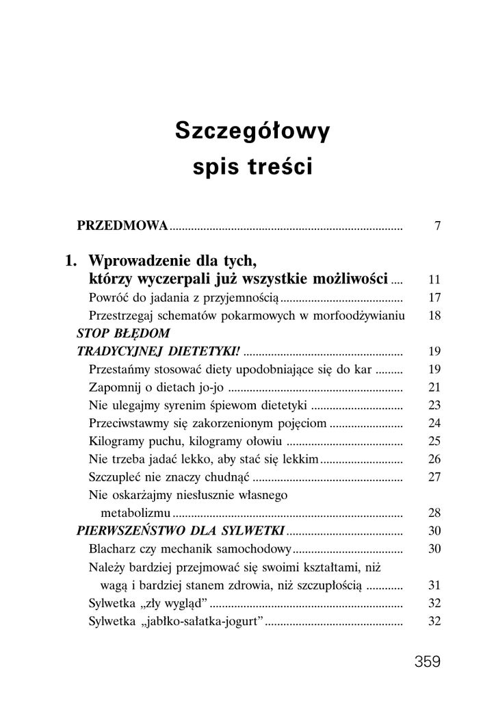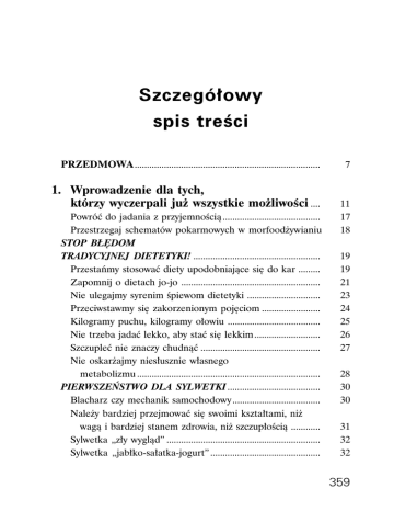 Szczegółowy spis treści PRZEDMOWA ............................................................................ 1. Wprowadzenie dla tych, którzy wyczerpali już wszystkie możliwości .... Powróć do jadania z przyjemnością ........................................ Przestrzegaj schematów pokarmowych w morfoodżywianiu STOP BŁĘDOM TRADYCYJNEJ DIETETYKI! .................................................... Przestańmy stosować diety upodobniające się do kar ......... Zapomnij o dietach jo-jo ......................................................... Nie ulegajmy syrenim śpiewom dietetyki .............................. Przeciwstawmy się zakorzenionym pojęciom ........................ Kilogramy puchu, kilogramy ołowiu ...................................... Nie trzeba jadać lekko, aby stać się lekkim ........................... Szczupleć nie znaczy chudnąć ................................................. Nie oskarżajmy niesłusznie własnego metabolizmu ........................................................................... PIERWSZEŃSTWO DLA SYLWETKI ...................................... Blacharz czy mechanik samochodowy .................................... Należy bardziej przejmować się swoimi kształtami, niż wagą i bardziej stanem zdrowia, niż szczupłością ............ Sylwetka „zły wygląd” ............................................................... Sylwetka „jabłko-sałatka-jogurt” ............................................. 7 11 17 18 19 19 21 23 24 25 26 27 28 30 30 31 32 32 359 Umięśniona sylwetka bez wysiłku ........................................... Na początek sprawdźmy stan twojego zdrowia próbką krwi 34 35 2. Metoda Delabos ................................................................ 39 43 43 44 44 44 46 47 49 50 51 53 57 58 59 59 59 60 60 61 61 62 63 63 64 64 64 65 65 Powrót do zasad naszych przodków ....................................... Wybór nowej techniki ............................................................... Dietetyka .............................................................................. Odżywianie kontrolowane ................................................. Chrono- i morfoodżywianie ............................................... OCENA MORFOLOGICZNA .................................................... Parametry oceny morfologicznej ............................................ Metodologia ............................................................................... Dokonywanie pomiarów .......................................................... Twoje obecne kształty ........................................................ Twoje pożądane kształty .................................................... Określanie twojego morfotypu ................................................ Morfotyp klepsydra ............................................................. Morfotyp Cheopsa .............................................................. Morfotyp zakonny ............................................................... Morfotyp Schwarzy ............................................................. Morfotyp pień drzewa ......................................................... Uwagi praktyczne ...................................................................... ® ZASADY CHRONOODŻYWIANIA ......................................... Czym jest chronoodżywianie ................................................... Instynkt ....................................................................................... Jakość .......................................................................................... Ilość ............................................................................................. Środowisko ................................................................................. Morfologia .................................................................................. Aktywność .................................................................................. Proces rośnięcia ......................................................................... Starzenie się ............................................................................... 360 Ogólna ocena ............................................................................. Faza powolnego postępu .......................................................... Od chronoodżywiania do morfoodżywiania .......................... CHRONOBIOLOGIA ODŻYWIANIA ....................................... Wróćmy do schematu odziedziczonego po przodkach ........ Zmiana sposobu życia, zmiana odżywiania ........................... Chronobiologia współczesnego człowieka ............................. Rano .................................................................................... W południe .......................................................................... Po południu ........................................................................ Wieczorem ........................................................................... Zaufać swojemu instynktowi ................................................... Potwierdzenie naukowe ............................................................ 65 66 67 67 67 69 71 71 72 72 72 72 74 3. Wdrożenie zasad chronoodżywiania .................... 77 80 80 81 82 83 84 86 87 Jak nauczyć się planować codzienne odżywianie ................. Zwalczyć monotonię ................................................................. Granice dietetyki ....................................................................... Błędy „dobrego jedzenia” ........................................................ Nie odrzucajmy już nigdy więcej „bogatych” dań ................ O której godzinie? .................................................................... Dwa posiłki-dżokery w ciągu tygodnia ................................... Kilka drobnych rad ................