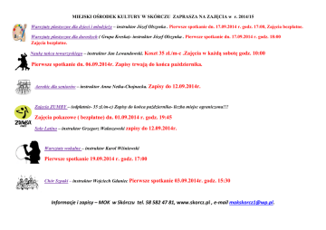 MIEJSKI OŚRODEK KULTURY W SKÓRCZU ZAPRASZA NA ZAJĘCIA w r. 2014/15 Warsztaty plastyczne dla dzieci i młodzieży – instruktor Józef Olszynka . Pierwsze spotkanie dn. 17.09.2014 r. godz. 17:00, Zajęcia bezpłatne. Warsztaty plastyczne dla dorosłych ( Grupa Kreska)- instruktor Józef Olszynka . Pierwsze spotkanie dn. 17.09.2014 r. godz. 18:00 Zajęcia bezpłatne. Naukę tańca towarzyskiego – instruktor Jan Lewandowski. Koszt 35 zł./m-c .Zajęcia w każdą sobotę godz. 10:00 Pierwsze spotkanie dn. 06.09.2014r. Zapisy trwają do końca października. Aerobic dla seniorów – instruktor Anna Netka-Chojnacka. Zapisy do 12.09.2014r. Zajęcia ZUMBY – (odpłatnie- 35 zł./m-c) Zapisy do końca października- liczba miejsc ograniczona!!! Zajęcia pokazowe ( bezpłatne) dn. 01.09.2014 r. godz. 19:45 Solo Latino – instruktor Grzegorz Wałaszewski zapisy do 12.09.2014r. Warsztaty wokalne – instruktor Karol Wiśniewski Pierwsze spotkanie 19.09.2014 r. godz. 17:00 Chór Szpaki – instruktor Wojciech Gdaniec Pierwsze spotkanie 03.09.2014r. godz. 15:30 Informacje i zapisy – MOK w Skórczu tel. 58 582 47 81, www.skorcz.pl , e-mail [email protected].