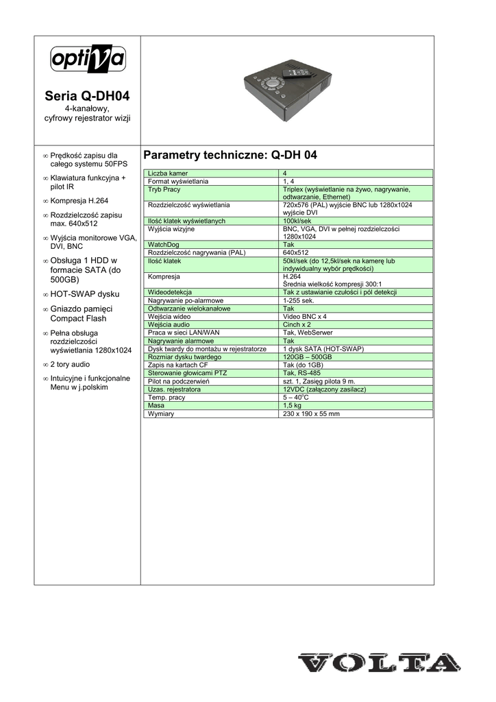 Seria Q-DH04 4-kanałowy, cyfrowy rejestrator wizji • Prędkość zapisu dla całego systemu 50FPS Parametry techniczne: Q-DH 04 • Klawiatura funkcyjna + pilot IR Liczba kamer Format wyświetlania Tryb Pracy • Kompresja H.264 Rozdzielczość wyświetlania • Rozdzielczość zapisu max. 640x512 • Wyjścia monitorowe VGA, DVI, BNC • Obsługa 1 HDD w formacie SATA (do 500GB) • HOT-SWAP dysku • Gniazdo pamięci Compact Flash • Pełna obsługa rozdzielczości wyświetlania 1280x1024 • 2 tory audio • Intuicyjne i funkcjonalne Menu w j.polskim Ilość klatek wyświetlanych Wyjścia wizyjne WatchDog Rozdzielczość nagrywania (PAL) Ilość klatek Kompresja Wideodetekcja Nagrywanie po-alarmowe Odtwarzanie wielokanałowe Wejścia wideo Wejścia audio Praca w sieci LAN/WAN Nagrywanie alarmowe Dysk twardy do montaŜu w rejestratorze Rozmiar dysku twardego Zapis na kartach CF Sterowanie głowicami PTZ Pilot na podczerwień Uzas. rejestratora Temp. pracy Masa Wymiary 4 1, 4 Triplex (wyświetlanie na Ŝywo, nagrywanie, odtwarzanie, Ethernet) 720x576 (PAL) wyjście BNC lub 1280x1024 wyjście DVI 100kl/sek BNC, VGA, DVI w pełnej rozdzielczości 1280x1024 Tak 640x512 50kl/sek (do 12,5kl/sek na kamerę lub indywidualny wybór prędkości) H.264 Średnia wielkość kompresji 300:1 Tak z ustawianie czułości i pól detekcji 1-255 sek. Tak Video BNC x 4 Cinch x 2 Tak, WebSerwer Tak 1 dysk SATA (HOT-SWAP) 120GB – 500GB Tak (do 1GB) Tak, RS-485 szt. 1, Zasięg pilota 9 m. 12VDC (załączony zasilacz) 5 – 40oC 1,5 kg 230 x 190 x 55 mm