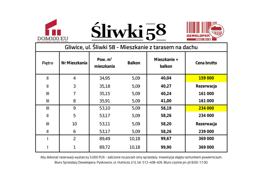 Nr Mieszkania Pow. m2 mieszkania Balkon Mieszkanie + balkon Cena brutto II 4 34,95 5,09 40,04 159 000 II 3 35,18 5,09 40,27 Rezerwacja III 7 35,15 5,09 40,24 161 000 III 8 35,91 5,09 41,00 161 000 III 9 53,10 5,09 58,19 234 000 II 5 53,17 5,09 58,26 234 000 III 10 53,11 5,09 58,20 Rezerwacja II 6 53,17 5,09 58,26 239 000 I 2 89,49 10,18 99,67 369 000 I 1 89,72 10,18 99,90 369 000