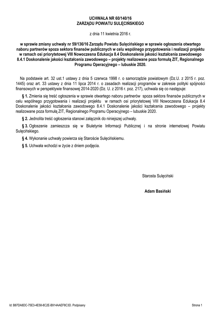 UCHWAŁA NR 60/140/16 ZARZĄDU POWIATU SULĘCIŃSKIEGO z dnia 11 kwietnia 2016 r. w sprawie zmiany uchwały nr 59/136/16 Zarządu Powiatu Sulęcińskiego w sprawie ogłoszenia otwartego naboru partnerów spoza sektora finansów publicznych w celu wspólnego przygotowania i realizacji projektu w ramach osi priorytetowej VIII Nowoczesna Edukacja 8.4 Doskonalenie jakości kształcenia zawodowego 8.4.1 Doskonalenie jakości kształcenia zawodowego – projekty realizowane poza formułą ZIT, Regionalnego Programu Operacyjnego – lubuskie 2020. Na podstawie art. 32 ust.1 ustawy z dnia 5 czerwca 1998 r. o samorządzie powiatowym (Dz.U. z 2015 r. poz. 1445) oraz art. 33 ustawy z dnia 11 lipca 2014 r. o zasadach realizacji programów w zakresie polityki spójności finansowych w perspektywie finansowej 2014-2020 (Dz. U. z 2016 r. poz. 217), uchwala się co następuje: § 1. Zmienia się treść ogłoszenia w sprawie otwartego naboru partnerów spoza sektora finansów publicznych w celu wspólnego przygotowania i realizacji projektu w ramach osi priorytetowej VIII Nowoczesna Edukacja 8.4 Doskonalenie jakości kształcenia zawodowego 8.4.1 Doskonalenie jakości kształcenia zawodowego – projekty realizowane poza formułą ZIT, Regionalnego Programu Operacyjnego – lubuskie 2020. § 2. Jednolita treść ogłoszenia stanowi załącznik do niniejszej uchwały. § 3. Ogłoszenie zamieszcza się w Biuletynie Informacji Publicznej i na stronie internetowej Powiatu Sulęcińskiego. § 4. Wykonanie uchwały powierza się Staroście Sulęcińskiemu. § 5. Uchwała wchodzi w życie z dniem podjęcia. Starosta Sulęciński Adam Basiński Id: B87DA8DC-75E3-4E58-8C2E-B914AAEF8C3D. Podpisany Strona 1 Załącznik Nr 1 do Uchwały Nr 60/140/16 Zarządu Powiatu Sulęcińskiego z dnia 11 kwietnia 2016 r. Ogłoszenie o otwartym naborze partnera w celu wspólnej realizacji projektu Ogłaszający konkurs: Powiat Sulęciński ul. Lipowa 18a 69-200 Sulęcin NIP 927-16-79-474 REGON: 210967389 Strona internetowa: www.powiatsulecinski.pl I. OGŁOSZENIE O KONKURSIE Na podstawie art. 33 ustawy z dnia 11 lipca 2014 r. o zasadach realizacji programów w zakresie polityki spójności finansowanych w perspektywie finansowej 2014–2020 (Dz. U. z 2016 r. poz. 217) PowiatSulęciński ogłasza otwarty nabór na partnera (spoza sektora finansów publicznych) w celu wspólnego przygotowania i realizacji projektu w ramach osi priorytetowej VII Nowoczesna Edukacja 8.4 Doskonalenie jakości kształcenia zawodowego 8.4.1 Doskonalenie jakości kształcenia zawodowego – projekty realizowane poza formułą ZIT, Regionalnego Programu Operacyjnego – lubuskie 2020. II. CEL PARTNERSTWA Wspólne przygotowanie, zarządzanie i realizacja projektu w ramach osi priorytetowe VIII Nowoczesna Edukacja 8.4 Doskonalenie jakości kształcenia zawodowego 8.4.1 Doskonalenie jakości kształcenia zawodowego – projekty realizowane poza formułą ZIT, Regionalnego Programu Operacyjnego – Lubuskie 2020. Realizacja projektu przewidywana jest w terminie: od 01.07.2016 r. do 30.06.2022 r. Do zadań Partnera będzie należało: 1. Wsparcie doskonalenia nauczycieli kształcenia zawodowego – kursy kwalifikacyjne, szkolenia doskonalące dla nauczycieli w zakresie tematyki związanej z nauczaniem zawodowym, studia podyplomowe. 2. Organizacja dla uczniów Zespołu Szkół Licealnych i Zawodowych w Sulęcinie dodatkowych zajęć specjalistycznych, kursów nadających nowe kwalifikacje i umiejętności, kursów i szkoleń przygotowujące do egzaminów zawodowych. 3. Doradztwo edukacyjno-zawodowe dla uczniów, m.in. tworzenie Szkolnych Punktów Informacji i Kariery oraz innych formy doradztwa zawodowego, także z wykorzystaniem technologii komunikacyjnoinformacyjnych. III. ZAKRES TEMATYCZNY PARTNERSTWA W ramach projektu przewidziane są działania związane z kompleksowym wsparciem Zespołu Szkół Licealnych i Zawodowych w Sulęcinie, których celem jest poprawa jakości edukacji, realizowana w oparciu o diagnozę potrzeb, w szczególności przez: 1. Podniesienie jakości kształcenia zawodowego, w tym rozwój współpracy szkół i placówek systemu oświaty prowadzących kształcenie zawodowe z ich otoczeniem społeczno-gospodarczym, poprzez: Id: B87DA8DC-75E3-4E58-8C2E-B914AAEF8C3D. Podpisany Strona 1 a) doskonalenie umiejętności i kompetencji zawodowych nauczycieli zawodu i instruktorów praktycznej nauki zawodu, związanych z nauczanym zawodem, we współpracy z instytucjami otoczenia społeczno-gospodarczego szkół i placówek systemu oświaty prowadzących kształcenie zawodowe; b) podnoszenie umiejętności oraz uzyskiwanie kwalifikacji zawodowych przez uczniów oraz słuchaczy uczestników pozaszkolnych form kształcenia zawodowego i wzmacnianie ich zdolności do zatrudnienia; c) tworzenie warunków odzwierciedlających naturalne warunki pracy właściwe dla nauczanych zawodów; d) rozwój współpracy szkół lub placówek systemu oświaty prowadzących kształcenie zawodowe z ich otoczeniem społeczno-gospodarczym. 2. Tworzenie i rozwój ukierunkowanych branżowo centrów kształcenia zawodowego i ustawicznego oraz tworzenie innych zespołów realizujących zadania zbieżne z zadaniami CKZiU poprzez: a) przygotowanie szkoły prowadzącej kształcenie zawodowe do pełnienia funkcji CKZiU lub innych zespołów realizujących zadania zbieżne z zadaniami CKZiU dla określonej branży; b) wsparcie realizacji zadań przez CKZiU z zadaniami CKZiU dla określonych branż. lub innych zespołów realizujących zadania zbieżne 3. Rozwój doradztwa edukacyjno–zawodowego poprzez: a) uzyskiwanie kwalifikacji doradców zawodowych przez osoby realizujące zadania z zakresu doradztwa zawodowego, które nie posiadają kwalifikacji z tego zakresu oraz poodnoszenie kwalifikacji zawodowych doradców edukacyjno-zawodowych, realizujących zadania z zakresu doradztwa edukacyjno-zawodowego; b) utworzenie Szkolnego Punktu Informacji i Kariery; c) zewnętrzne wsparci
