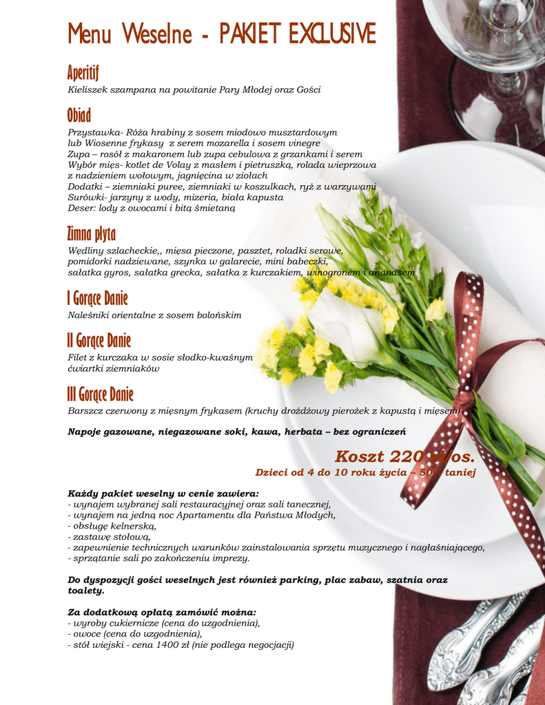 Menu Weselne - PAKIET EXCLUSIVE Aperitif Kieliszek szampana na powitanie Pary Młodej oraz Gości Obiad Przystawka- Róża hrabiny z sosem miodowo musztardowym lub Wiosenne frykasy z serem mozarella i sosem vinegre Zupa – rosół z makaronem lub zupa cebulowa z grzankami i serem Wybór mięs- kotlet de Volay z masłem i pietruszką, rolada wieprzowa z nadzieniem wołowym, jagnięcina w ziołach Dodatki – ziemniaki puree, ziemniaki w koszulkach, ryż z warzywami Surówki- jarzyny z wody, mizeria, biała kapusta Deser: lody z owocami i bitą śmietaną Zimna płyta Wędliny szlacheckie,, mięsa pieczone, pasztet, roladki serowe, pomidorki nadziewane, szynka w galarecie, mini babeczki, sałatka gyros, sałatka grecka, sałatka z kurczakiem, winogronem i ananasem I Gorące Danie Naleśniki orientalne z sosem bolońskim II Gorące Danie Filet z kurczaka w sosie słodko-kwaśnym ćwiartki ziemniaków III Gorące Danie Barszcz czerwony z mięsnym frykasem (kruchy drożdżowy pierożek z kapustą i mięsem) Napoje gazowane, niegazowane soki, kawa, herbata – bez ograniczeń Koszt 220 zł/os. Dzieci od 4 do 10 roku życia – 50% taniej Każdy pakiet weselny w cenie zawiera: - wynajem wybranej sali restauracyjnej oraz sali tanecznej, - wynajem na jedną noc Apartamentu dla Państwa Młodych, - obsługę kelnerską, - zastawę stołową, - zapewnienie technicznych warunków zainstalowania sprzętu muzycznego i nagłaśniającego, - sprzątanie sali po zakończeniu imprezy. Do dyspozycji gości weselnych jest również parking, plac zabaw, szatnia oraz toalety. Za dodatkową opłatą zamówić można: - wyroby cukiernicze (cena do uzgodnienia), - owoce (cena do uzgodnienia), - stół wiejski - cena 1400 zł (nie podlega negocjacji)