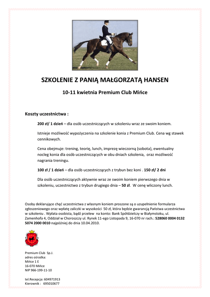 SZKOLENIE Z PANIĄ MAŁGORZATĄ HANSEN 10-11 kwietnia Premium Club Mińce Koszty uczestnictwa : 200 zł/ 1 dzień – dla osób uczestniczących w szkoleniu wraz ze swoim koniem. Istnieje możliwość wypożyczenia na szkolenie konia z Premium Club. Cena wg stawek cennikowych. Cena obejmuje: trening, teorię, lunch, imprezę wieczorną (sobota), ewentualny nocleg konia dla osób uczestniczących w obu dniach szkolenia, oraz możliwość nagrania treningu. 100 zł / 1 dzień – dla osób uczestniczących z trybun bez koni . 150 zł/ 2 dni Dla osób uczestniczących aktywnie wraz ze swoim koniem pierwszego dnia w szkoleniu, uczestnictwo z trybun drugiego dnia – 50 zł. W cenę wliczony lunch. Osoby deklarujące chęć uczestnictwa z własnym koniem proszone są o uzupełnienie formularza zgłoszeniowego oraz wpłatę zaliczki w wysokości 50 zł, która będzie gwarancją Państwa uczestnictwa w szkoleniu . Wpłata osobista, bądź przelew na konto: Bank Spółdzielczy w Białymstoku, ul. Zamenhofa 4, Oddział w Choroszczy ul. Rynek 11-ego Listopada 9, 16-070 nr rach.: 528060 0004 0132 5074 2000 0010 najpóźniej do dnia 10.04.2010. Premium Club Sp.J. adres ośrodka: Mińce 1 E 16-070 Mińce NIP 966-199-11-10 tel.Recepcja: 604971913 Kierownik : 695010677