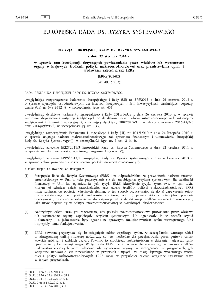 3.4.2014 Dziennik Urzędowy Unii Europejskiej PL C 98/3 EUROPEJSKA RADA DS. RYZYKA SYSTEMOWEGO DECYZJA EUROPEJSKIEJ RADY DS. RYZYKA SYSTEMOWEGO z dnia 27 stycznia 2014 r. w sprawie ram koordynacji dotyczących powiadamiania przez właściwe lub wyznaczone organy o krajowych środkach polityki makroostrożnościowej oraz przedstawiania opinii i wydawania zaleceń przez ERRS (ERRS/2014/2) (2014/C 98/03) RADA GENERALNA EUROPEJSKIEJ RADY DS. RYZYKA SYSTEMOWEGO, uwzględniając rozporządzenie Parlamentu Europejskiego i Rady (UE) nr 575/2013 z dnia 26 czerwca 2013 r. w sprawie wymogów ostrożnościowych dla instytucji kredytowych i firm inwestycyjnych, zmieniające rozporzą dzenie (UE) nr 648/2012 (1), w szczególności jego art. 458, uwzględniając dyrektywę Parlamentu Europejskiego i Rady 2013/36/UE z dnia 26 czerwca 2013 r. w sprawie warunków dopuszczenia instytucji kredytowych do działalności oraz nadzoru ostrożnościowego nad instytucjami kredytowymi i firmami inwestycyjnymi, zmieniającą dyrektywę 2002/87/WE i uchylającą dyrektywy 2006/48/WE oraz 2006/49/WE (2), w szczególności jej art. 133, uwzględniając rozporządzenie Parlamentu Europejskiego i Rady (UE) nr 1092/2010 z dnia 24 listopada 2010 r. w sprawie unijnego nadzoru makroostrożnościowego nad systemem finansowym i ustanowienia Europejskiej Rady ds. Ryzyka Systemowego (3), w szczególności jego art. 3 ust. 2 lit. j), uwzględniając zalecenie ERRS/2011/3 Europejskiej Rady ds. Ryzyka Systemowego z dnia 22 grudnia 2011 r. w sprawie mandatu makroostrożnościowego organów krajowych (4), uwzględniając zalecenie ERRS/2013/1 Europejskiej Rady ds. Ryzyka Systemowego z dnia 4 kwietnia 2013 r. w sprawie celów pośrednich i instrumentów polityki makroostrożnościowej (5), a także mając na uwadze, co następuje: (1) Europejska Rada ds. Ryzyka Systemowego (ERRS) jest odpowiedzialna za prowadzenie nadzoru makroo strożnościowego w Unii w celu przyczyniania się do zapobiegania ryzykom systemowym dla stabilności finansowej w Unii lub ograniczania tych ryzyk. ERRS identyfikuje ryzyka systemowe, w tym takie, którym jej zdaniem należy przeciwdziałać przy użyciu środków polityki makroostrożnościowej. ERRS może zachęcać do podjęcia właściwych działań, w ten sposób przyczyniając się do a) zapewnienia osiąg nięcia ostatecznego celu polityki makroostrożnościowej; oraz b) przeciwdziałania potencjalnej postawie bezczynności, zarówno w odniesieniu do aktywacji, jak i dezaktywacji środków makroostrożnościowych, jaka może pojawić się w polityce makroostrożnościowej w określonych okolicznościach. (2) Nadrzędnym celem ERRS jest zapewnienie, aby polityki makroostrożnościowe prowadzone przez właściwe lub wyznaczone organy zapobiegały ryzykom systemowym lub ograniczały je w sposób szybki i skuteczny , a jednocześnie były zgodne ze sprawnym funkcjonowaniem rynku wewnętrznego Unii i sprzyjały temu funkcjonowaniu. (3) ERRS powinna przyczyniać się do osiągnięcia celów wspólnego rynku, w szczególności wnosząc wkład w zintegrowaną unijną strukturę nadzorczą, co jest niezbędne dla podejmowania przez państwa człon kowskie spójnych i szybkich decyzji. Powinno to zapobiegać rozbieżnościom w działaniu i ulepszać funk cjonowanie rynku wewnętrznego. W tym celu ERRS może zachęcać do wzajemnego uznawania środków makroostrożnościowych przez właściwe lub wyznaczone organy, w szczególności w przypadkach, gdy wzajemne uznawanie jest przewidziane w przepisach unijnych. W miarę lepszego wzajemnego zrozu mienia polityk makroostrożnościowych ERRS może w przyszłości zalecać wzajemne uznawanie także w innych przypadkach. (1) (2) (3) (4) (5) Dz.U. L 176 z 27.6.2013, s. 1. Dz.U. L 176 z 27.6.2013, s. 338. Dz.U. L 331 z 15.12.2010, s. 1. Dz.U. C 41 z 14.2.2012, s. 1. Dz.U. C 170 z 15.6.2013, s. 1. C 98/4 PL Dziennik Urzędowy Unii Europejskiej 3.4.2014 (4) Zgodnie ze swymi uprawnieniami ERRS współpracuje z międzynarodowymi instytucjami finansowymi i organami makroostrożnościowymi w państwach trzecich oraz ocenia potrzebę podjęcia ogólnounijnych działań makroostrożnościowych w odpowiedzi na ryzyka systemowe i polityki makroostrożnościowe w państwach trzecich. (5) Nowe unijne ramy regulacyjne dotyczące bankowości zawierają dwa oddzielne instrumenty legislacyjne: dyrektywę 2013/36/UE (zwaną dalej „dyrektywą w sprawie wymogów kapitałowych”) oraz rozporządzenie (UE) nr 575/2013 (zwane dalej „rozporządzeniem w sprawie wymogów kapitałowych”). Dyrektywa w sprawie wymogów kapitałowych zawiera mniej przepisów bezwzględnie obowiązujących niż rozporzą dzenie. Zatem państwa członkowskie korzystają ze znacznej elastyczności przy stosowaniu instrumentów makroostrożnościowych opartych na dyrektywie w sprawie wymogów kapitałowych, np. różnego rodzaju buforów kapitałowych. Natomiast instrumenty makroostrożnościowe, o których mowa w art. 458 rozpo rządzenia w sprawie wymogów kapitałowych, nie zapewniają takiego stopnia elastyczności. Korzystanie z nich przez organy krajowe podlega określonej procedurze, która jednocześnie określa zakres ich stoso wania. (6) Dyrektywa w sprawie wymogów kapitałowych i rozporządzenie w sprawie wymogów kapitałowych usta nawiają określone wymogi dotyczące powiadamiania, których właściwe lub wyznaczone organy muszą przestrzegać w stosunku do ERRS w kontekście nadzoru makroostrożnościowego, w szczególności w następujących przepisach: art. 129 ust. 2, art. 130 ust. 2, art. 131 ust. 7, art. 131 ust. 12, art. 133, art. 134 ust. 2, art. 136 ust. 7 i art. 160 dyrektywy w sprawie wymogów kapitałowych oraz art. 99 ust. 7 i art. 458 rozporządzenia w sprawie wymogów kapitałowych. (7) Zgodnie z art. 133 dyrektywy w sprawie wymogów kapitałowych i art. 458 rozporządzenia w sprawie wymogów kapitałowych ERRS ma obowiązek przedstawiania opinii i wydawania zaleceń dotyczących p