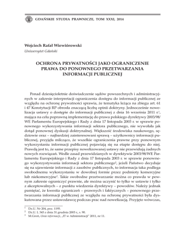 GDAŃSKIE STUDIA PRAWNICZE, TOM XXXI, 2014 Wojciech Rafał Wiewiórowski Uniwersytet Gdański Ochrona prywatności jako ograniczenie prawa do ponownego przetwarzania informacji publicznej Ponad dziesięcioletnie doświadczenie sądów powszechnych i administracyjnych w zakresie interpretacji ograniczenia dostępu do informacji publicznej ze względu na ochronę prywatności sprawia, że tematyka leżąca na zbiegu art. 61 i 47 Konstytucji RP obrosła znaczącą liczbą opinii doktryny. Jednocześnie nowelizacja ustawy o dostępie do informacji publicznej z dnia 16 września 2011 r.1, mająca na celu poprawną implementację do prawa polskiego dyrektywy 2003/98/ WE Parlamentu Europejskiego i Rady z dnia 17 listopada 2003 r. w sprawie ponownego wykorzystywania informacji sektora publicznego, nie wywołała jak dotąd ponownej dyskusji doktrynalnej. Większość środowiska naukowego, sędziowie oraz – najbardziej zainteresowani sprawą – użytkownicy informacji publicznej, przyjęła milcząco, że wszelkie ograniczenia prawne przy ponownym wykorzystaniu informacji publicznej pojawiają się na etapie dostępu do niej. Prawdą jest to, że same przepisy nowelizowanej ustawy nie przewidują żadnych nowych rozwiązań. Wedle zasad przewidzianych w dyrektywie 2003/98/WE Parlamentu Europejskiego i Rady z dnia 17 listopada 2003 r. w sprawie ponownego wykorzystywania informacji sektora publicznego2, jeżeli Państwo decyduje się na ujawnienie informacji z zasobów publicznych, to informacja taka podlega swobodnemu wykorzystaniu w dowolnej formie przez podmioty komercyjne lub niekomercyjne3. Takie swobodne przetwarzanie można co prawda w pewnym zakresie ograniczyć prawnie, ale można uczynić to tylko w ustawie i tylko z akceptowalnych – z punktu wiedzenia dyrektywy – powodów. Należy jednak pamiętać, że kwestia ograniczeń – prawnych i faktycznych – ponownego przetwarzania informacji publicznej ze względu na ochronę prywatności była dyskutowana przez ustawodawcę podczas prac nad nowelizacją. Przyjęto wówczas, 1 Dz.U. Nr 204, poz. 1195. Dz.U. L 345 z dnia 31 grudnia 2003 r., s. 90. 3 M.Groń, Unia informacji, „IT w Administracji” 2011, nr 11. 2 146 Wojciech Rafał Wiewiórowski że uzupełnianie rządowego projektu ustawy o zmianie ustawy o dostępie do informacji publicznej oraz niektórych innych ustaw o jakiekolwiek postanowienia dotyczące ochrony prywatności przy ponownym wykorzystaniu informacji publicznej nie jest konieczne, jako że zasady te wynikają wprost z innego obowiązującego aktu prawnego – ustawy o ochronie danych osobowych – którego stosowania w żaden sposób nie ograniczają nowe przepisy. Podczas prac sejmowych nad zmianą ustawy o dostępie do informacji publicznej podkreślano, że informacja publiczna w rozumieniu ustawy zawarta jest nie tylko w klasycznych dokumentach urzędowych lub dokumentach informacyjnych przekazywanych przez podmioty zobowiązane do udzielenia informacji publicznej, ale również w prowadzonych przez nie rejestrach publicznych4. Za słuszny należy uznać pogląd, że dane z rejestrów publicznych stanowią informację publiczną. Są bowiem informacją sektora publicznego w rozumieniu dyrektywy, a polska ustawa nie zróżnicowała pojęć „informacja sektora publicznego” oraz „informacja publiczna”. Jeśli zaś dane rejestrowe są informacją publiczną, to mogą być ponownie wykorzystane, o ile jawność formalna rejestru nie została ograniczona. Pamiętając, że definicje rejestru publicznego i dokumentu elektronicznego zawarte w ustawie z dnia 17 lutego 2005 r. o informatyzacji działalności podmiotów realizujących zadania publiczne5 są bardzo szerokie, należy mieć świadomość, że dane osobowe z rejestrów publicznych będą łączone przykładowo, obejmując także: –– dane z ksiąg wieczystych ujawniane w systemach teleinformatycznych6; –– dane z Krajowego Rejestru Sądowego ujawniane w systemach teleinformatycznych7; –– dane z dowolnych rejestrów publicznych, w których ujawniono obiekty przestrzenne (w rozumieniu ustawy z dnia 4 marca 2010 r. o infrastrukturze informacji przestrzennej)8; –– dane dotyczące sprawy zagospodarowania przestrzennego prezentowane dla celów tworzenia miejscowych planów zagospodarowania przestrzennego; –– dane z Centralnej Ewidencji i Informacji o Działalności Gospodarczej; 4 O zakresie danych przetwarzanych przez administrację publiczną i stanowiących informację publiczną najszerzej pisali w ostatnich latach P. Fajgielski, Informacja w administracji publicznej. Prawne aspekty gromadzenia, udostępniania i ochrony, Presscom, Wrocław 2007, s. 33–62 oraz 74–112 oraz A.Pawłowska, Zasoby informacyjne w administracji publicznej w Polsce. Problemy zarządzania, Wyd. UMCS, Lublin 2002. 5 Dz. U. Nr 64, poz. 565 ze zm. 6 A.Gryszczyńska, Nowa Księga Wieczysta. Informatyzacja rejestru publicznego, LexisNexis, Warszawa 2012, s. 226-282; A. Stefańska, Elektroniczna księga wieczysta, LexisNexis, Warszawa 2011, s. 115–141 oraz A. Gryszczyńska, Elektroniczny dostęp do Nowej Księgi Wieczystej i Krajowego Rejestru Sądowego, [w:] Internet. Prawno-informatyczne problemy sieci, portali i e-usług, red. G. Szpor, W. Wiewiórowski, C.H. Beck, Warszawa 2012, s. 289–304. 7 A.Gryszczyńska, Elektroniczny dostęp…, s. 296–300. 8 A.Gryszczyńska, Nowa Księga Wieczysta…, s. 115–171. Ochrona prywatności jako ograniczenie prawa do ponownego przetwarzania… 147 –– dane z krajowych rejestrów urzędowych w rozumieniu przepisów o statystyce publicznej (REGON, TERYT); –– publicznie dostępne dane z ofert przygotowanych na podstawie przepisów o handlu wierzytelnościami9; –– rejestry zawodowe10; –– oświadczenia majątkowe składane przez urzędników publicznych i członków władz publicznych oraz –– pozostające w gestii danego podmiotu dane przetwarzane z zachowaniem odpowiednich podstaw prawnych a dotyczące