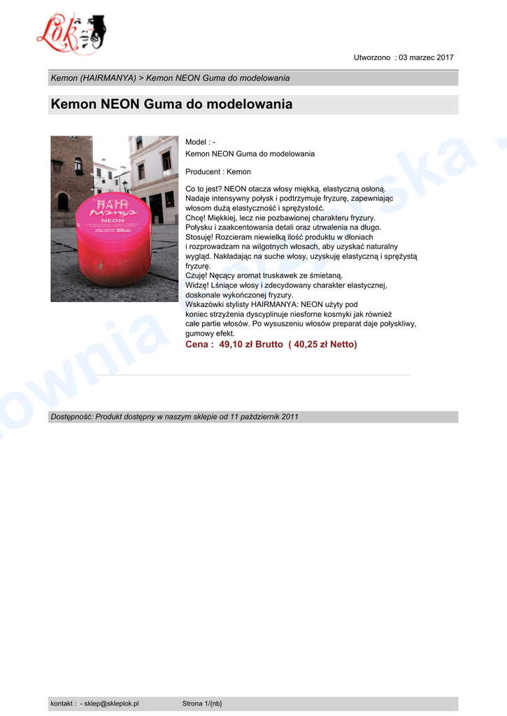 Utworzono : 03 marzec 2017 Kemon (HAIRMANYA) > Kemon NEON Guma do modelowania L a Kemon NEON Guma do modelowania Model : - k s r Kemon NEON Guma do modelowania Producent : Kemon Co to jest? NEON otacza włosy miękką, elastyczną osłoną. Nadaje intensywny połysk i podtrzymuje fryzurę, zapewniając włosom dużą elastyczność i sprężystość. Chcę! Miękkiej, lecz nie pozbawionej charakteru fryzury. Połysku i zaakcentowania detali oraz utrwalenia na długo. Stosuję! Rozcieram niewielką ilość produktu w dłoniach i rozprowadzam na wilgotnych włosach, aby uzyskać naturalny wygląd. Nakładając na suche włosy, uzyskuję elastyczną i sprężystą fryzurę. Czuję! Nęcący aromat truskawek ze śmietaną. Widzę! Lśniące włosy i zdecydowany charakter elastycznej, doskonale wykończonej fryzury. Wskazówki stylisty HAIRMANYA: NEON użyty pod koniec strzyżenia dyscyplinuje niesforne kosmyki jak również całe partie włosów. Po wysuszeniu włosów preparat daje połyskliwy, gumowy efekt. e j z a i n w to y r F Cena : 49,10 zł Brutto ( 40,25 zł Netto) Dostępność: Produkt dostępny w naszym sklepie od 11 październik 2011 kontakt : - [email protected] Strona 1/{nb}