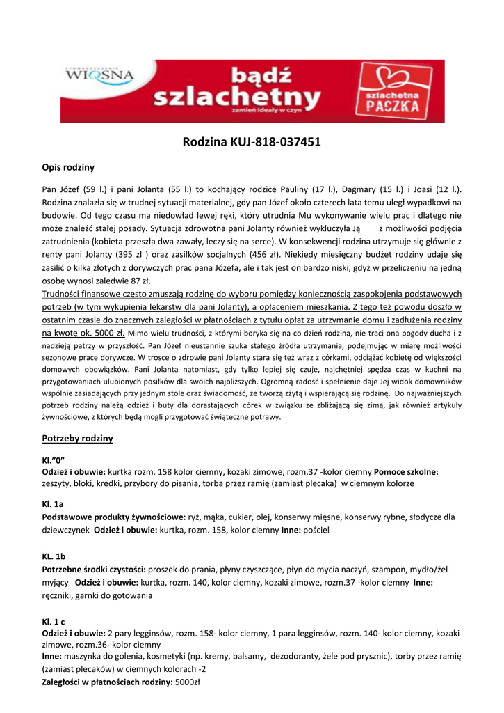 Rodzina KUJ-818-037451 Opis rodziny Pan Józef (59 l.) i pani Jolanta (55 l.) to kochający rodzice Pauliny (17 l.), Dagmary (15 l.) i Joasi (12 l.). Rodzina znalazła się w trudnej sytuacji materialnej, gdy pan Józef około czterech lata temu uległ wypadkowi na budowie. Od tego czasu ma niedowład lewej ręki, który utrudnia Mu wykonywanie wielu prac i dlatego nie może znaleźć stałej posady. Sytuacja zdrowotna pani Jolanty również wykluczyła Ją z możliwości podjęcia zatrudnienia (kobieta przeszła dwa zawały, leczy się na serce). W konsekwencji rodzina utrzymuje się głównie z renty pani Jolanty (395 zł ) oraz zasiłków socjalnych (456 zł). Niekiedy miesięczny budżet rodziny udaje się zasilić o kilka złotych z dorywczych prac pana Józefa, ale i tak jest on bardzo niski, gdyż w przeliczeniu na jedną osobę wynosi zaledwie 87 zł. Trudności finansowe często zmuszają rodzinę do wyboru pomiędzy koniecznością zaspokojenia podstawowych potrzeb (w tym wykupienia lekarstw dla pani Jolanty), a opłaceniem mieszkania. Z tego też powodu doszło w ostatnim czasie do znacznych zaległości w płatnościach z tytułu opłat za utrzymanie domu i zadłużenia rodziny na kwotę ok. 5000 zł. Mimo wielu trudności, z którymi boryka się na co dzień rodzina, nie traci ona pogody ducha i z nadzieją patrzy w przyszłość. Pan Józef nieustannie szuka stałego źródła utrzymania, podejmując w miarę możliwości sezonowe prace dorywcze. W trosce o zdrowie pani Jolanty stara się też wraz z córkami, odciążać kobietę od większości domowych obowiązków. Pani Jolanta natomiast, gdy tylko lepiej się czuje, najchętniej spędza czas w kuchni na przygotowaniach ulubionych posiłków dla swoich najbliższych. Ogromną radość i spełnienie daje Jej widok domowników wspólnie zasiadających przy jednym stole oraz świadomość, że tworzą zżytą i wspierającą się rodzinę. Do najważniejszych potrzeb rodziny należą odzież i buty dla dorastających córek w związku ze zbliżającą się zimą, jak również artykuły żywnościowe, z których będą mogli przygotować świąteczne potrawy. Potrzeby rodziny Kl.”0” Odzież i obuwie: kurtka rozm. 158 kolor ciemny, kozaki zimowe, rozm.37 -kolor ciemny Pomoce szkolne: zeszyty, bloki, kredki, przybory do pisania, torba przez ramię (zamiast plecaka) w ciemnym kolorze Kl. 1a Podstawowe produkty żywnościowe: ryż, mąka, cukier, olej, konserwy mięsne, konserwy rybne, słodycze dla dziewczynek Odzież i obuwie: kurtka, rozm. 158, kolor ciemny Inne: pościel KL. 1b Potrzebne środki czystości: proszek do prania, płyny czyszczące, płyn do mycia naczyń, szampon, mydło/żel myjący Odzież i obuwie: kurtka, rozm. 140, kolor ciemny, kozaki zimowe, rozm.37 -kolor ciemny Inne: ręczniki, garnki do gotowania Kl. 1 c Odzież i obuwie: 2 pary legginsów, rozm. 158- kolor ciemny, 1 para legginsów, rozm. 140- kolor ciemny, kozaki zimowe, rozm.36- kolor ciemny Inne: maszynka do golenia, kosmetyki (np. kremy, balsamy, dezodoranty, żele pod prysznic), torby przez ramię (zamiast plecaków) w ciemnych kolorach -2 Zaległości w płatnościach rodziny: 5000zł