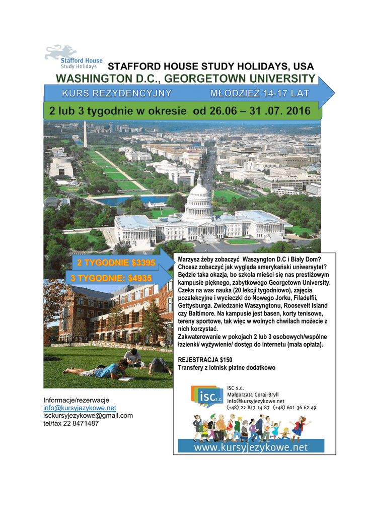 STAFFORD HOUSE STUDY HOLIDAYS, USA Marzysz żeby zobaczyć Waszyngton D.C i Biały Dom? Chcesz zobaczyć jak wygląda amerykański uniwersytet? Będzie taka okazja, bo szkoła mieści się nas prestiżowym kampusie pięknego, zabytkowego Georgetown University. Czeka na was nauka (20 lekcji tygodniowo), zajęcia pozalekcyjne i wycieczki do Nowego Jorku, Filadelfii, Gettysburga. Zwiedzanie Waszyngtonu, Roosevelt Island czy Baltimore. Na kampusie jest basen, korty tenisowe, tereny sportowe, tak więc w wolnych chwilach możecie z nich korzystać. Zakwaterowanie w pokojach 2 lub 3 osobowych/wspólne łazienki/ wyżywienie/ dostęp do Internetu (mała opłata). REJESTRACJA $150 Transfery z lotnisk płatne dodatkowo Informacje/rezerwacje [email protected] [email protected] tel/fax 22 8471487