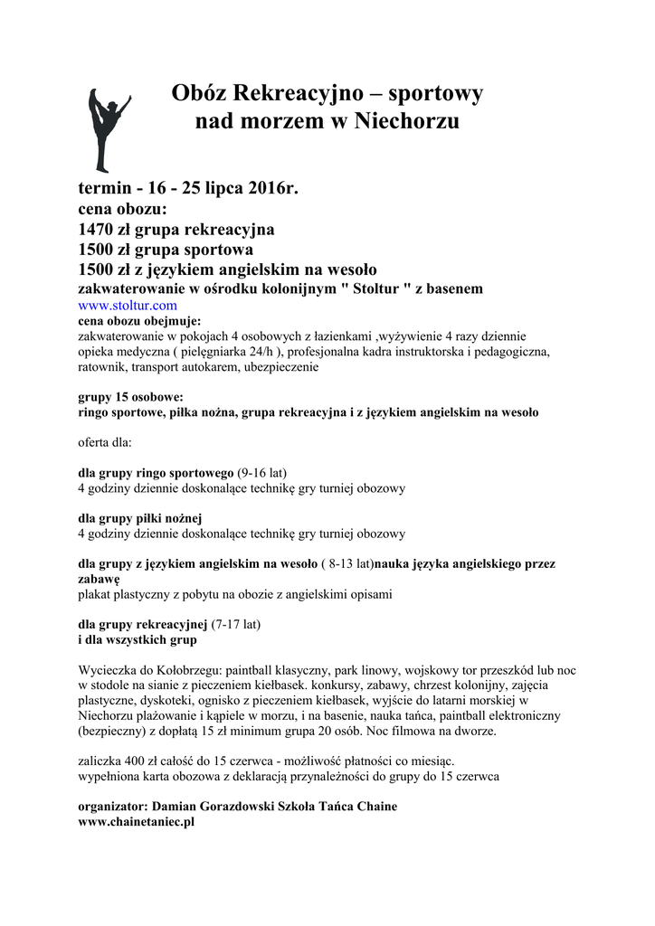 Obóz Rekreacyjno – sportowy nad morzem w Niechorzu termin - 16 - 25 lipca 2016r. cena obozu: 1470 zł grupa rekreacyjna 1500 zł grupa sportowa 1500 zł z językiem angielskim na wesoło zakwaterowanie w ośrodku kolonijnym " Stoltur " z basenem www.stoltur.com cena obozu obejmuje: zakwaterowanie w pokojach 4 osobowych z łazienkami ,wyżywienie 4 razy dziennie opieka medyczna ( pielęgniarka 24/h ), profesjonalna kadra instruktorska i pedagogiczna, ratownik, transport autokarem, ubezpieczenie grupy 15 osobowe: ringo sportowe, piłka nożna, grupa rekreacyjna i z językiem angielskim na wesoło oferta dla: dla grupy ringo sportowego (9-16 lat) 4 godziny dziennie doskonalące technikę gry turniej obozowy dla grupy piłki nożnej 4 godziny dziennie doskonalące technikę gry turniej obozowy dla grupy z językiem angielskim na wesoło ( 8-13 lat)nauka języka angielskiego przez zabawę plakat plastyczny z pobytu na obozie z angielskimi opisami dla grupy rekreacyjnej (7-17 lat) i dla wszystkich grup Wycieczka do Kołobrzegu: paintball klasyczny, park linowy, wojskowy tor przeszkód lub noc w stodole na sianie z pieczeniem kiełbasek. konkursy, zabawy, chrzest kolonijny, zajęcia plastyczne, dyskoteki, ognisko z pieczeniem kiełbasek, wyjście do latarni morskiej w Niechorzu plażowanie i kąpiele w morzu, i na basenie, nauka tańca, paintball elektroniczny (bezpieczny) z dopłatą 15 zł minimum grupa 20 osób. Noc filmowa na dworze. zaliczka 400 zł całość do 15 czerwca - możliwość płatności co miesiąc. wypełniona karta obozowa z deklaracją przynależności do grupy do 15 czerwca organizator: Damian Gorazdowski Szkoła Tańca Chaine www.chainetaniec.pl