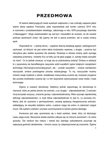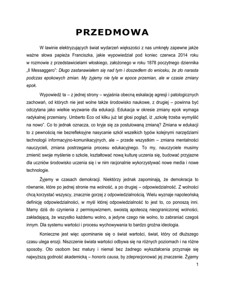 PRZEDMOWA W lawinie elektryzujących świat wydarzeń większości z nas umknęły zapewne jakże ważne słowa papieża Franciszka, jakie wypowiedział pod koniec czerwca 2014 roku w rozmowie z przedstawicielami włoskiego, założonego w roku 1878 poczytnego dziennika „Il Messaggero”: Długo zastanawiałem się nad tym i doszedłem do wniosku, że zło narasta podczas epokowych zmian. My żyjemy nie tyle w epoce przemian, ale w czasie zmiany epok. Wypowiedź ta – z jednej strony – wyjaśnia obecną eskalację agresji i patologicznych zachowań, od których nie jest wolne także środowisko naukowe, z drugiej – powinna być odczytana jako wielkie wyzwanie dla edukacji. Edukacja w okresie zmiany epok wymaga radykalnej przemiany. Umberto Eco od kilku już lat głosi pogląd, iż „szkołę trzeba wymyślić na nowo”. Co to jednak oznacza, co kryje się za postulowaną zmianą? Zmiana w edukacji to z pewnością nie bezrefleksyjne nasycanie szkół wszelkich typów kolejnymi narzędziami technologii informacyjno-komunikacyjnych, ale – przede wszystkim – zmiana mentalności nauczycieli, zmiana postrzegania procesu edukacyjnego. To my, nauczyciele musimy zmienić swoje myślenie o szkole, kształtować nową kulturę uczenia się, budować przyjazne dla uczniów środowisko uczenia się i w nim racjonalnie wykorzystywać nowe media i nowe technologie. Żyjemy w czasach demokracji. Niektórzy jednak zapominają, że demokracja to równanie, które po jednej stronie ma wolność, a po drugiej – odpowiedzialność. Z wolności chcą korzystać wszyscy, znacznie gorzej z odpowiedzialnością. Wielu wyznaje napoleońską definicję odpowiedzialności, w myśl której odpowiedzialność to jest to, co ponoszą inni. Mamy dziś do czynienia z permisywizmem, swoistą apoteozą nieograniczonej wolności, zakładającą, że wszystko każdemu wolno, a jedyne czego nie wolno, to zabraniać czegoś innym. Dla systemu wartości i procesu wychowywania to bardzo groźna ideologia. Konieczne jest więc upominanie się o świat wartości, świat, który od dłuższego czasu ulega erozji. Niszczenie świata wartości odbywa się na różnych poziomach i na różne sposoby. Oto osobom bez matury i niemal bez żadnego wykształcenia przyznaje się najwyższą godność akademicką – honoris causa, by zdeprecjonować jej znaczenie. Żyjemy 1 w społeczeństwie informacyjnym, w którym informacja stała się jednym z najważniejszych towarów. Ale dziś towarem stało się też wykształcenie, a niektórzy uważają, że są nim również stopnie i tytuły naukowe, które można kupić, najłatwiej w krajach sąsiednich. Co gorsza, zniknęło poczucie jakiegokolwiek zażenowania takim postępowaniem, bo przecież prawo nie zostało naruszone, a o przyzwoitości wspominać nie warto. Powyższe słowa adresuję wyłącznie do tych, których nieestetyczna droga rozwoju naukowego budzi w środowisku zdziwienie i niesmak, wielu bowiem korzysta z tej ścieżki awansu w sposób całkowicie uczciwy i rzetelny. Naukowcy, którzy zawsze cieszyli się intelektualną niezależnością i wolnością, dziś coraz bardziej doświadczają zaciskania się administracyjnego gorsetu, kierującego ich aktywność w stronę nonsensownej, a często wręcz szkodliwej biurokracji, mającej na celu jedynie ograniczenie ich naukowej działalności. Niestety, tylko część środowiska naukowego ma odwagę przeciwstawiać się tym ograniczeniom, wielu bezkrytycznie pokochało świat ogłupiających procedur. Dzięki globalnym mediom wiemy dziś znacznie więcej o świecie, o innych ludziach i wydarzeniach. Ale też żyjemy w warunkach nieustannej i – jak to nazwał w swojej ostatniej książce Zygmunt Bauman – płynnej inwigilacji, związanej z naszą mobilnością i wykorzystywaniem mobilnych urządzeń komunikowania się [Z. Bauman, D. Lyon: Płynna inwigilacja. Rozmowy. Wydaw. Literackie, Kraków 2013]. Ostatnia afera podsłuchowa w Polsce pokazała doskonałość techniczną i obnażyła głęboki kryzys aksjologiczny. Poszukuje się winnych samego nagrania, a żaden z dziennikarzy nie pokusił się o jakże oczywistą konkluzję i istotny dla przyszłości wniosek: jeżeli nie sposób dziś uniknąć inwigilacji, to w każdej sytuacji, nie tylko publicznej, ale i prywatnej, należy się zachowywać przyzwoicie, tak, aby nie stać się obiektem szantażu, medialnej nagonki, by nie dać pretekstu do zniszczenia własnej kariery zawodowej czy rodzinnego szczęścia. Zmarły przed blisko pół wiekiem poeta, satyryk i aforysta Stanisław Jerzy Lec jest autorem między innymi takiego aforyzmu: „Mów mądrze, wróg podsłuchuje”. W świetle wspomnianej afery zasadne obecnie będzie posługiwanie się parafrazą tego aforyzmu: „Zachowuj się porządnie, wróg rejestruje”. Ta sytuacja pokazuje też, jak bardzo konieczna jest powszechna edukacja medialna, której istotnym elementem muszą być treści kulturowe, w tym – aksjologiczne. Współczesny człowiek, tak silnie zanurzony w świecie mediów, 2 człowiek medialny – powinien być człowiekiem mądrym. Pojęcie to oznacza wyposażenie zarówno w odpowiednią wiedzę, jak i świat wartości, konieczny do podejmowania trafnych decyzji, w tym też do racjonalnych wyborów docierającej do nas informacji, w szczególności do jej selekcji. Dziś bowiem prawdziwe jest stwierdzenie, że jakość docierającej do nas informacji silnie determinuje jakość naszego życia. Istnieje zatem konieczność upominania się o wartości, bo – jak zauważył jeden z największych polskich autorytetów w dziedzinie aksjologii, Prof. Władysław Stróżewski – zatraciliśmy wrażliwość na wartości, zagubiliśmy ich smak, [...] pogubiliśmy się w odczytywaniu ich właściwej hierarchii. Kryzys sięga głębiej: dotyczy aksjologicznej struktury człowieka [W. Stróżewski: O wielkości. Znak, Kraków 2002, s. 168]. Ważnym elementem erozji wartości jest utożsamian