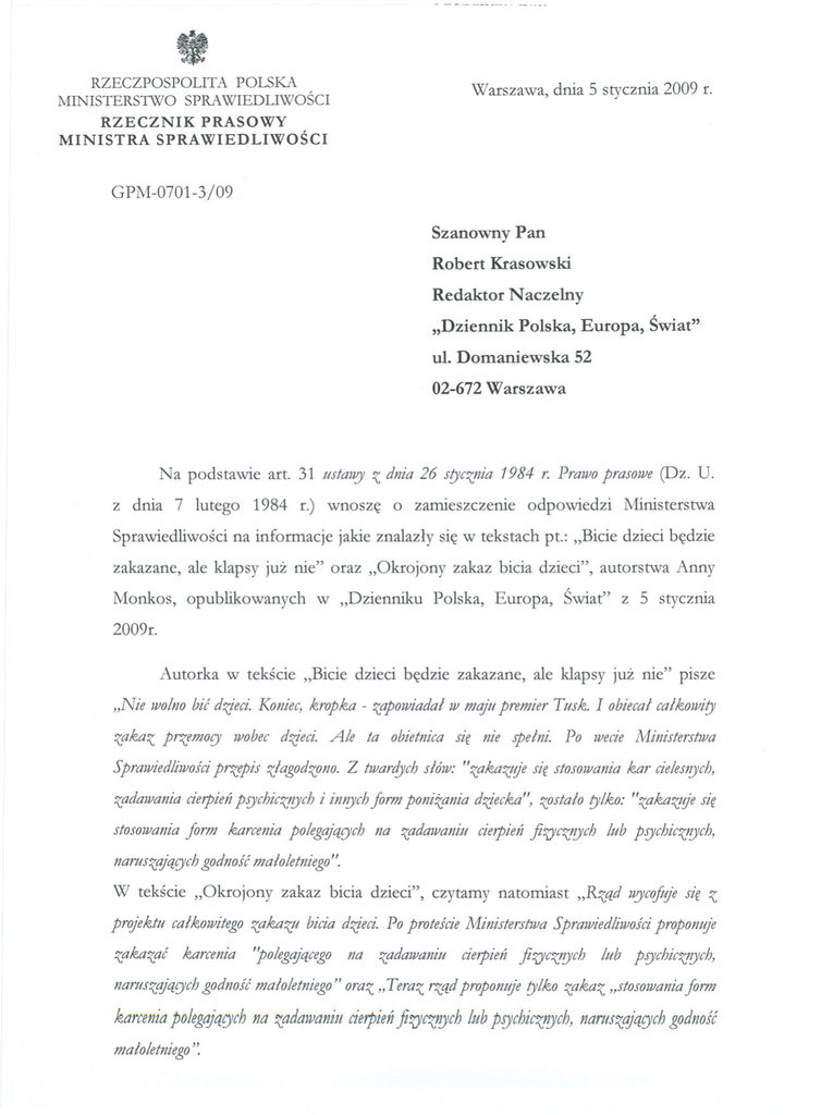 RZECZPOSPOLITA POLSKA MINISTERSTWO SPRAWIEDLIWOSCI RZECZNIK PRASOWY MINISTRA SPRAWIEDLIWOSCI Warszawa, dnia 5 stycznia 2009 r. GPM-0701-3j09 Szanowny Pan Robert Krasowski Redaktor~aczeh1y "Dziennik Polska, Europa, Swiat" ul. Domaniewska 52 02-672 Warszawa Na podstawie art. 31 ustawyZ dnia 26 srycznia1984 r. Prawoprasowe(Dz. U. z dnia 7 lutego 1984 r.) wnosze o zamieszczenie odpowiedzi Ministerstwa Sprawiedliwosci na informacje jakie znalazly sie w tekstach pt.: "Bicie dzieci bedzie zakazane, ale klapsy juz nie" oraz "Okrojony zakaz bicia dzieci", autorstwa Anny Monkos, opublikowanych w "Dzienniku Polska, Europa, Swiat" z 5 stycznia 2009r. Autorka w tekscie "Bicie dzieci bedzie zakazane, ale klapsy juz nie" pisze "Nie wolno bic d~eci. Koniec, kropka - zapowiadal w mqju premier Tusk. I obiecalcalkowiry zakaz przemory wobec d~eci. Ale ta obietnica sie nie spelni. Po wecie Ministerstwa Sprawiedliwosciprzepis zlagodzono. Z twarc!Jchslów: "zakazzge sie stosowaniakar cieles'!}ch, zadawania cierpienpsychicZ'!}chi in'!}chform ponizania d~ecka", zostalo rylko: "zakaijge sie stosowaniaform karcenia polegqjarych na zadawaniu cierpien.ft:rycZ'!}chlub psychicZ'!}ch, naruszqjarych godnosc maloletniego". W tekscie "Okrojony zakaz bicia dzieci", czytamy natomiast "Rzad uycofzgesie Z prOjektu calkowitego zakazu bicia d~eci. Po protescieMinisterstwa Sprawiedliwosciproponzge zakazac karcenia "polegqjacego na zadawaniu cierpien .ft:rycZ'!}ch lub psychicZ'!}ch, naruszqjarychgodnoscmaloletniego"oraz" Teraz rzad proponzgerylko zakaz "stosowaniaform karceniapolegajqCJch na zadawaniucierpien ji:rycZt!Ychlub psychicznych, naruszajqCJch godnosc maloletniego ': 2 Zacytowane fragmenty tekstów swiadcza o niezrozumieniu przez autorke intencji Ministerstwa Sprawiedliwosci. Sugeruje ona w swoich tekstach, jakoby nasz resort dazyl do ograniczenia jest natomiast dokladnie autorki ze sluzbami materialu zakazu stosowania przemocy wobec dzieci. Prawda odwrotna niz sugestie zamieszczone prasowymi z pewnoscia resortu pozwolilby sprawiedliwosci na unikniecie w tekstach. Kontakt przy przygotowywaniu tego nieporozumienia. Taki kontakt jednak nie nastapil. W zwiazku z powyzszym prosze o opublikowanie odpowiedzi :Ministerstwa Sprawiedliwosci nastepujacej tresci: "Watpliwosci Ministerstwa Sprawiedliwosci dotyczace projektowanej przez resort pracy ustawy o przeciwdzialaniu przemocy w rodzinie, dotycza pojecia "kar cielesnych", rozumianego przez twórców jako obejmujace wszystkie przypadki przemocy wobec dziecka. Naszym zdaniem nie kazdy z takich przypadków moze byc potraktowany jako "kara". Praktyka organów scigania wskazuje na czeste przypadki bicia dzieci bez powodu i bez powiazania z naruszeniem przez dziecko jakichkolwiek norm zachowania (czyli przemoc niezwiazana z wymierzaniem kary). Dlatego tez sformulowanie pierwotnej, Ministerstwo przepisu, rozszerzaloby Sprawiedliwosci które w niczym katalog zaproponowalo nie ograniczajac czynów zabronionych takie propozycji o przypadki przemocy fizycznej i psychicznej, które nie sa zwiazane z wymierzaniem kary. Dodatkowo bedzie zabroniony w naszej propozycji znalazlo sie zastrzezenie, tylko gdy naruszy godnosc w naszej intencji, ograniczenie karcenie powodowane maloletniego. ewentualnych byloby zapobiezeniem krzywdy dziecka)." oczywistym ze czyn taki Ma to na celu, sporów w przypadku gdy dobrem dziecka (np.