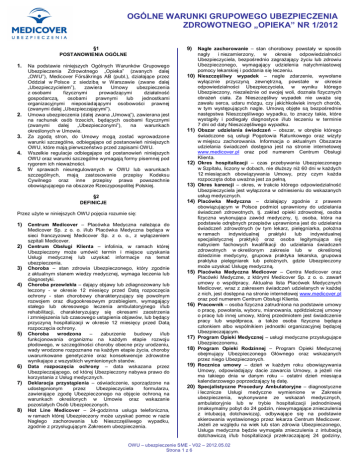 OGÓLNE WARUNKI GRUPOWEGO UBEZPIECZENIA ZDROWOTNEGO „OPIEKA” NR 1/2012 9) §1 POSTANOWIENIA OGÓLNE 1. 2. 3. 4. 5. Na podstawie niniejszych Ogólnych Warunków Grupowego Ubezpieczenia Zdrowotnego „Opieka” (zwanych dalej „OWU”), Medicover Försäkrings AB (publ.), działające przez Oddział w Polsce z siedzibą w Warszawie (zwane dalej „Ubezpieczycielem”), zawiera Umowy ubezpieczenia z osobami fizycznymi prowadzącymi działalność gospodarczą, osobami prawnymi lub jednostkami organizacyjnymi nieposiadającymi osobowości prawnej (zwanymi dalej „Ubezpieczającymi”). Umowa ubezpieczenia (dalej zwana „Umową”), zawierana jest na rachunek osób trzecich, będących osobami fizycznymi (zwanymi dalej „Ubezpieczonymi”), na warunkach określonych w Umowie. Za zgodą stron, do Umowy mogą zostać wprowadzone warunki szczególne, odbiegające od postanowień niniejszych OWU, które mają pierwszeństwo przed zapisami OWU. Wszelkie regulacje odbiegające od postanowień niniejszych OWU oraz warunki szczególne wymagają formy pisemnej pod rygorem ich nieważności. W sprawach nieuregulowanych w OWU lub warunkach szczególnych, mają zastosowanie przepisy Kodeksu Cywilnego oraz inne przepisy prawa powszechnie obowiązującego na obszarze Rzeczypospolitej Polskiej. §2 DEFINICJE 10) 11) 12) 13) 14) Przez użyte w niniejszych OWU pojęcia rozumie się: 1) 2) 3) 4) 5) 6) 7) 8) Centrum Medicover – Placówka Medyczna należąca do Medicover Sp. z o. o. i/lub Placówka Medyczna będąca w sieci franczyzowej Medicover Sp. z o. o., z wyłączeniem szpitali Medicover. Centrum Obsługi Klienta – infolinia, w ramach której Ubezpieczony może umówić termin i miejsce uzyskania Usługi medycznej lub uzyskać informacje na temat ubezpieczenia. Choroba – stan zdrowia Ubezpieczonego, który zgodnie z aktualnym stanem wiedzy medycznej, wymaga leczenia lub diagnostyki. Choroba przewlekła – dający objawy lub zdiagnozowany lub leczony - w okresie 12 miesięcy przed Datą rozpoczęcia ochrony - stan chorobowy charakteryzujący się powolnym rozwojem oraz długookresowym przebiegiem, wymagający stałego lub okresowego leczenia ambulatoryjnego i/lub rehabilitacji, charakteryzujący się okresami zaostrzenia i zmniejszenia lub czasowego ustąpienia objawów, lub będący przyczyną hospitalizacji w okresie 12 miesięcy przed Datą rozpoczęcia ochrony. Choroba wrodzona – zaburzenie budowy i/lub funkcjonowania organizmu na każdym etapie rozwoju płodowego, w szczególności choroby obecne przy urodzeniu, wady wrodzone rozpoznane na każdym etapie życia, choroby uwarunkowane genetycznie oraz konsekwencje zdrowotne wynikające z wszystkich wymienionych stanów. Data rozpoczęcia ochrony – data wskazana przez Ubezpieczającego, od której Ubezpieczony nabywa prawo do korzystania z Usług medycznych. Deklaracja przystąpienia – oświadczenie, sporządzone na udostępnionym przez Ubezpieczyciela formularzu, zawierające zgodę Ubezpieczonego na objęcie ochroną na warunkach określonych w Umowie oraz wskazanie pozostałych Osób Ubezpieczonych. Hot Line Medicover – 24-godzinna usługa telefoniczna, w ramach której Ubezpieczony może uzyskać pomoc w razie Nagłego zachorowania lub Nieszczęśliwego wypadku, zgodnie z przysługującym Zakresem ubezpieczenia. 15) 16) 17) 18) 19) 20) Nagłe zachorowanie – stan chorobowy powstały w sposób nagły i niezamierzony, w okresie odpowiedzialności Ubezpieczyciela, bezpośrednio zagrażający życiu lub zdrowiu Ubezpieczonego, wymagający udzielenia natychmiastowej pomocy lekarskiej i poddania się leczeniu. Nieszczęśliwy wypadek – nagłe zdarzenie, wywołane wyłącznie przyczyną zewnętrzną, powstałe w okresie odpowiedzialności Ubezpieczyciela, w wyniku którego Ubezpieczony, niezależnie od swojej woli, doznała fizycznych obrażeń ciała. Za Nieszczęśliwy wypadek nie uważa się zawału serca, udaru mózgu, czy jakichkolwiek innych chorób, w tym występujących nagle. Umową objęte są bezpośrednie następstwa Nieszczęśliwego wypadku, to znaczy takie, które wystąpiły i podlegały diagnostyce i/lub leczeniu w terminie 7 dni od daty Nieszczęśliwego wypadku. Obszar udzielania świadczeń – obszar, w obrębie którego świadczone są usługi Pogotowia Ratunkowego oraz wizyty w miejscu zachorowania. Informacja o aktualnym Obszarze udzielania świadczeń dostępna jest na stronie internetowej www.medicover.pl oraz pod numerem Centrum Obsługi Klienta. Okres hospitalizacji – czas przebywania Ubezpieczonego w Szpitalu, liczony w dobach, nie dłuższy niż 60 dni w każdych 12 miesiącach obowiązywania Umowy, przy czym każda rozpoczęta doba uważna jest za pełną. Okres karencji – okres, w trakcie którego odpowiedzialność Ubezpieczyciela jest wyłączona w odniesieniu do wskazanych usług medycznych. Placówka Medyczna – działający zgodnie z prawem obowiązującym w Polsce podmiot uprawniony do udzielania świadczeń zdrowotnych, tj. zakład opieki zdrowotnej, osoba fizyczna wykonująca zawód medyczny, tj. osoba, która na podstawie odrębnych przepisów uprawniona jest do udzielania świadczeń zdrowotnych (w tym lekarz, pielęgniarka, położna w ramach indywidualnej praktyki lub indywidualnej specjalistycznej praktyki) oraz osoba legitymująca się nabyciem fachowych kwalifikacji do udzielania świadczeń zdrowotnych w określonym zakresie lub w określonej dziedzinie medycyny, grupowa praktyka lekarska, grupowa praktyka pielęgniarek lub położnych, gdzie Ubezpieczony może uzyskać Usługę medyczną. Placówka Medyczna Medicover – Centra Medicover oraz Placówki Medyczne, z którymi Medicover Sp. z o. o. zawarł umowy o współpracy. Aktualna lista Placówek Medycznych Medicover, wraz z zakresem świadczeń udzielanych w każdej z nich, jest dostępna na stronie internetowej www.medicover.pl oraz pod numerem Centrum Obsługi Klienta. Pracownik – osoba fizyczna zatrudniona na podstawie um