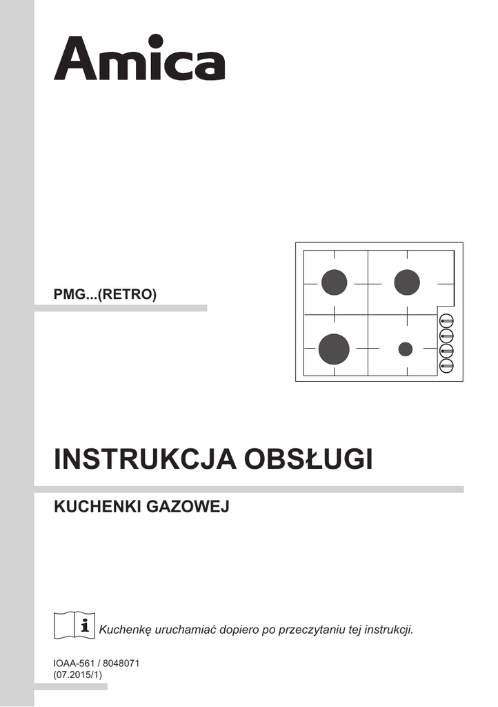 PMG...(RETRO) INSTRUKCJA OBSŁUGI KUCHENKI GAZOWEJ Kuchenkę uruchamiać dopiero po przeczytaniu tej instrukcji. IOAA-561 / 8048071 (07.2015/1) SZANOWNY KLIENCIE, Płyta Amica to połączenie wyjątkowej łatwości obsługi i doskonałej efektywności. Po prze czytaniu instrukcji, obsługa płyty nie będzie problemem. Płyta, która opuściła fabrykę była dokładnie sprawdzona przed zapakowaniem pod wzglę dem bezpieczeństwa i funkcjonalności na stanowiskach kontrolnych. Prosimy Państwa o uważną lekturę instrukcji obsługi przed uruchomieniem urządzenia. Przestrzeganie zawartych w niej wskazówek uchroni Państwa przed niewłaściwym użytko waniem. Instrukcję należy zachować i przechowywać tak, aby mieć ją zawsze pod ręką. Należy dokładnie przestrzegać instrukcji obsługi w celu uniknięcia nieszczęśliwych wypad ków. Uwaga! Urządzenie obsługiwać tylko po przeczytaniu / zrozumieniu niniejszej instrukcji. Urządzenie zostało zaprojektowane wyłącznie jako urządzenie do gotowania.Każde inne jego zastosowanie ( np. do ogrzewania pomieszczeń) jest niezgodne z jego przeznaczeniem i może być niebezpieczne. Producent zastrzega sobie możliwość dokonywania zmian nie wpływających na działanie urządzenia. Przyłączenia kuchenki do butli z gazem płynnym lub do istniejącej instalacji może wykonać wyłącznie uprawniony instalator z zachowaniem wszystkich przepisów bezpieczeństwa. Oświadczenie producenta Producent deklaruje niniejszym, że wyrób ten spełnia zasadnicze wymagania wymienionych poniżej dyrektyw europejskich: ● dyrektywy niskonapięciowej 2006/95/WE, ● dyrektywy kompatybilności elektromagnetycznej 2004/108/WE, ● dyrektywy “urządzenia gazowe” 2009/142/WE, ● dyrektywy ekoprojektowania 2009/125/WE, i dlatego wyrób został oznakowany oraz została wystawiona dla niego deklaracja zgodności udostępniana organom nadzorującym rynek. Masz wątpliwości? Nie wszystko, co przeczytałeś w instrukcji jest zrozumiałe zadzwoń do Centrum Serwisowego, gdzie uzyskasz wszechstronną pomoc. tel. 801 801 800 2 SPIS TREŚCI Podstawowe informacje............................................................................................2 Wskazówki odnośnie bezpieczeństwa......................................................................4 Jak oszczędzać energię..............................................................................................7 Opis wyrobu......................................................................................................9 Dane techniczne..............................................................................................9 Instalacja..................................................................................................................10 Obsługa.................................................................................................................16 Czyszczenie i konserwacja................................................................................20 Postępowanie w sytuacjach awaryjnych...........................................................22 Gwarancja, obsługa posprzedażna....................................................................23 3 WSKAZÓWKI DOTYCZĄCE BEZPIECZEŃSTWA UŻYTKOWANIA Uwaga.Urządzenie i jego dostępne części stają się gorące podczas użycia. Możliwość dotknięcia elementów grzejnych powinno być objęte szczególną troską. Dzieci poniżej 8 roku życia powinny trzymać się z daleka, chyba że są pod stałą opieką. Niniejszy sprzęt może być używany przez dzieci w wieku od 8 lat i wyżej i osoby z ograniczeniami fizycznymi, czuciowymi albo umysłowymi albo brakiem doświadczenia i wiedzy, jeśli odbywa się pod nadzorem lub zgodnie z instrukcją użytkowania sprzętu, przekazanej przez osoby odpowiadające za ich bezpieczeństwo. Należy zwracać uwagę na dzieci, aby nie bawiły się sprzętem. Sprzątanie i czynności obsługowe nie powinny być robione przez dzieci bez nadzoru. Uwaga. Gotowanie bez nadzoru tłuszczu lub oleju na płycie kuchennej może być niebezpieczne i doprowadzić do pożaru. NIGDY nie próbuj gasić ognia wodą, ale wyłącz urządzenie i wtedy przykryj płomień np. pokrywką lub niepalnym kocem. Uwaga. Niebezpieczeństwo pożaru: nie gromadź rzeczy na powierzchni do gotowania. 4 WSKAZÓWKI DOTYCZĄCE BEZPIECZEŃSTWA UŻYTKOWANIA Urządzeniem nie należy sterować zewnętrznym zegarem lub niezależnym układem zdalnego sterowania. Do czyszczenia płyty nie wolno używać sprzętu do czyszczenia parą. ! Przed pierwszym użyciem płyty grzejnej należy przeczytać instrukcję użytkowania. W ten sposób zapewniamy sobie bezpieczeństwo oraz unikamy uszkodzenia płyty. ! Należy zwracać uwagę na dzieci, aby nie bawiły się sprzętem. Szczególnie gorące palniki nawierzchniowe, ruszta, ustawione naczynia z gorącymi płynami mogą być przyczyną poparzenia dziecka. ! Należy uważać, żeby elektryczny przewód przyłączeniowy zmechanizowanego sprzętu nie dotykał gorących części kuchenki. ! Wtyczka przewodu przyłączeniowego powinna być dostępna po zainstalowaniu kuchenki. ! Zabrania się instalować kuchenkę w pobliżu urządzeń chłodniczych. ! Nie należy pozostawiać kuchenki bez nadzoru podczas smażenia. Oleje i tłuszcze mogą się zapalić z powodu przegrzania. ! Uważać na moment zagotowania, by nie dopuścić do zalania palników. ! Jeżeli nastąpi uszkodzenie kuchenki to można ją ponownie używać po usunięciu wady przez fachowca. ! Nie otwierać kurka na przyłączu gazu lub zaworu na butli bez uprzedniego sprawdzenia czy wszystkie kurki są zamknięte. ! Nie dopuszczać do zalewania palników oraz ich zanieczyszczania. Zabrudzone oczyścić i wysuszyć natychmiast po wystudzeniu. ! Nie wolno stawiać naczyń bezpośrednio na palnikach. ! Nie ustawiać naczyń na ruszcie nad jednym palnikiem o masie większej niż 5 kg, natomiast na całym ruszci