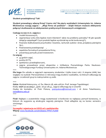 Student-przedsiębiorcą? Tak! Student prowadzący własną firmę? Czemu nie? Na pięciu wydziałach Uniwersytetu im. Adama Mickiewicza ruszają zajęcia – „Moja firma od podstaw” – dzięki którym możecie efektywnie połączyć studiowanie ze zdobywaniem praktycznych biznesowych umiejętności. Czekają na was m.in. zajęcia z: • modeli biznesowych, • segmentacji rynku (kto będzie moim klientem? Jakie ma problemy potrzeby? W jaki sposób dotąd je zaspokajał? Czym produkt będzie wyróżniał się na tle konkurencji?), • finansów (kalkulowanie przychodów i kosztów, rachunek zysków i strat, przepływy pieniężne itp.), • finansowania przedsięwzięć , • aspektów formalnych prowadzenia firmy, • prezentacji pomysłu przed inwestorem. Co więcej: • 45 godzin zajęć, • punkty ECTS, • spotkania z przedsiębiorcami, • zajęcia prowadzone przez ekspertów z InQbatora Poznańskiego Parku NaukowoTechnologicznego Fundacji Uniwersytetu im. Adama Mickiewicza *** Dla kogo: Do udziału w zajęciach zapraszamy studentów I (tylko trzeci rok) i II stopnia UAM, bez względu na wydział. Pierwszeństwo w rekrutacji mają studenci wydziałów, na których odbywają się zajęcia. Liczebność grup to maksymalnie 25 osób. *** Gdzie: Wydział Historyczny, ul. Św. Marcin 78, sala 118 (im. Prof. Jerzego Topolskiego) Kiedy: start 17.10.2013 r., godz. 16:30-18:45 , zajęcia odbywają się w czwartki Osoba do kontaktu: dr Piotr Pokora, [email protected] i dr Anna Tatarkiewicz, [email protected] *** Finał: Najlepsi z uczestników mogą wystartować w konkursie na najlepszy pomysł biznesowy, w którym do wygrania są atrakcyjne nagrody pieniężne. Finał odbędzie się na koniec semestru zimowego. *** Szczegóły i rejestracja na USOS od 7 października Więcej: www.facebook.com/InQbator.PPNT.FUAM ***