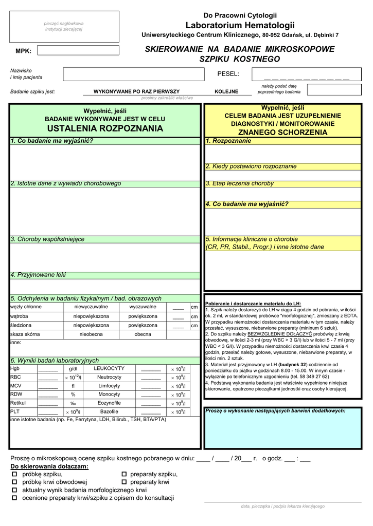 Do Pracowni Cytologii pieczęć nagłówkowa instytucji zlecającej Laboratorium Hematologii Uniwersyteckiego Centrum Klinicznego, 80-952 Gdańsk, ul. Dębinki 7 SKIEROWANIE NA BADANIE MIKROSKOPOWE SZPIKU KOSTNEGO MPK: Nazwisko i imię pacjenta PESEL: Badanie szpiku jest: WYKONYWANE PO RAZ PIERWSZY __ __ __ __ __ __ __ __ __ __ __ należy podać datę poprzedniego badania KOLEJNE prosimy zakreślić właściwe Wypełnić, jeśli CELEM BADANIA JEST UZUPEŁNIENIE DIAGNOSTYKI / MONITOROWANIE Wypełnić, jeśli BADANIE WYKONYWANE JEST W CELU USTALENIA ROZPOZNANIA ZNANEGO SCHORZENIA 1. Co badanie ma wyjaśnić? 1. Rozpoznanie 2. Kiedy postawiono rozpoznanie 2. Istotne dane z wywiadu chorobowego 3. Etap leczenia choroby 4. Co badanie ma wyjaśnić? 3. Choroby współistniejące 5. Informacje kliniczne o chorobie (CR, PR, Stabil., Progr.) i inne istotne dane 4. Przyjmowane leki 5. Odchylenia w badaniu fizykalnym / bad. obrazowych węzły chłonne niewyczuwalne wyczuwalne ____ cm wątroba niepowiększona powiększona ____ cm śledziona niepowiększona powiększona ____ cm nieobecna obecna skaza skórna inne: 6. Wyniki badań laboratoryjnych _______ g/dl LEUKOCYTY _______ 109/l RBC _______ 10 /l Neutrocyty _______ 109/l MCV _______ fl Limfocyty _______ 109/l RDW _______ % Monocyty _______ 109/l Retikul _______ ‰ Eozynofile _______ 109/l Hgb 12 Bazofile _______ _______ 10 /l inne istotne badania (np. Fe, Ferrytyna, LDH, Bilirub., TSH, BTA/PTA) PLT 9 109/l Pobieranie i dostarczanie materiału do LH: 1. Szpik należy dostarczyć do LH w ciągu 4 godzin od pobrania, w ilości ok. 2 ml, w standardowej probówce "morfologicznej", zmieszany z EDTA. W przypadku niemożności dostarczenia materiału w tym czasie, należy przesłać, wysuszone, niebarwione preparaty (mininum 6 sztuk). 2. Do szpiku należy BEZWZGLĘDNIE DOŁĄCZYĆ probówkę z krwią obwodową, w ilości 2-3 ml (przy WBC > 3 G/l) lub w ilości 5 - 7 ml (przy WBC < 3 G/l). W przypadku niemożności dostarczenia krwi czasie 4 godzin, przesłać należy gotowe, wysuszone, niebarwione preparaty, w ilości min. 2 sztuk. 3. Materiał jest przyjmowany w LH (budynek 32) codziennie od poniedziałku do piątku w godzinach 8.00 - 15.00. W innym czasie wyłącznie po telefonicznym uzgodnieniu (tel. 58 349 27 62) 4. Podstawą wykonania badania jest właściwie wypełnione niniejsze skierowanie, opatrzone pieczątkami jednostki oraz osoby kierującej. Proszę o wykonanie następujących barwień dodatkowych: Proszę o mikroskopową ocenę szpiku kostnego pobranego w dniu: ____ / ____ / 20___ r. o godz. ___ : ___ Do skierowania dołączam: o próbkę szpiku, o preparaty szpiku, o próbkę krwi obwodowej o preparaty krwi o aktualny wynik badania morfologicznego krwi o ocenione preparaty krwi/szpiku z opisem do konsultacji data, pieczątka i podpis lekarza kierującego