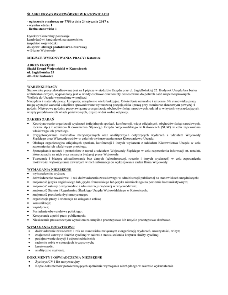 ŚLĄSKI URZĄD WOJEWÓDZKI W KATOWICACH - ogłoszenie o naborze nr 7756 z dnia 24 stycznia 2017 r. - wymiar etatu: 1 - liczba stanowisk: 1 Dyrektor Generalny poszukuje kandydatów\ kandydatek na stanowisko: inspektor wojewódzki do spraw: obsługi protokolarno-biurowej w Biurze Wojewody MIEJSCE WYKONYWANIA PRACY: Katowice ADRES URZĘDU: Śląski Urząd Wojewódzki w Katowicach ul. Jagiellońska 25 40 - 032 Katowice WARUNKI PRACY Stanowisko pracy zlokalizowane jest na I piętrze w siedzibie Urzędu przy ul. Jagiellońskiej 25. Budynek Urzędu bez barier architektonicznych, wyposażony jest w windy osobowe oraz toalety dostosowane do potrzeb osób niepełnosprawnych. Wejście do Urzędu wyposażone w podjazd. Narzędzia i materiały pracy: komputer, urządzenie wielofunkcyjne. Oświetlenie naturalne i sztuczne. Na stanowisku pracy mogą wystąpić warunki uciążliwe spowodowane wymuszoną pozycją ciała i pracą przy monitorze ekranowym powyżej 4 godzin. Nietypowe godziny pracy związane z organizacją obchodów świąt narodowych, udział w wizytach wyprzedzających wizyty przedstawicieli władz państwowych, często w dni wolne od pracy. ZAKRES ZADAŃ Koordynowanie organizacji wydarzeń (oficjalnych spotkań, konferencji, wizyt oficjalnych, obchodów świąt narodowych, rocznic itp.) z udziałem Kierownictwa Śląskiego Urzędu Wojewódzkiego w Katowicach (ŚUW) w celu zapewnienia właściwego ich przebiegu. Przygotowywanie materiałów merytorycznych oraz analitycznych dotyczących wydarzeń z udziałem Wojewody Śląskiego oraz Wicewojewodów w celu ich wykorzystania przez Kierownictwo Urzędu. Obsługa organizacyjna oficjalnych spotkań, konferencji i innych wydarzeń z udziałem Kierownictwa Urzędu w celu zapewnienia ich właściwego przebiegu. Sporządzanie notatek i protokołów z narad z udziałem Wojewody Śląskiego w celu zapewnienia informacji nt. ustaleń, które zapadły na nich oraz wsparcia bieżącej pracy Wojewody. Tworzenie i bieżące aktualizowanie baz danych (teleadresowej, rocznic i innych wydarzeń) w celu zapewnienia możliwości wykorzystania zawartych w nich informacji do wykonywania zadań Biura Wojewody. WYMAGANIA NIEZBĘDNE wykształcenie: wyższe; doświadczenie zawodowe: 1 rok doświadczenia zawodowego w administracji publicznej na stanowiskach urzędniczych; znajomość języka angielskiego lub języka francuskiego lub języka niemieckiego na poziomie komunikatywnym; znajomość ustawy o wojewodzie i administracji rządowej w województwie; znajomość Statutu i Regulaminu Śląskiego Urzędu Wojewódzkiego w Katowicach; znajomość protokołu dyplomatycznego; organizacja pracy i orientacja na osiąganie celów; komunikacja; współpraca; Posiadanie obywatelstwa polskiego; Korzystanie z pełni praw publicznych; Nieskazanie prawomocnym wyrokiem za umyślne przestępstwo lub umyśle przestępstwo skarbowe. WYMAGANIA DODATKOWE doświadczenie zawodowe: 1 rok na stanowisku związanym z organizacją wydarzeń, uroczystości, wizyt; znajomość ustawy o służbie cywilnej w zakresie statusu członka korpusu służby cywilnej; podejmowanie decyzji i odpowiedzialność; radzenie sobie w sytuacjach kryzysowych; kreatywność; analityczne myślenie. DOKUMENTY I OŚWIADCZENIA NIEZBĘDNE Życiorys/CV i list motywacyjny Kopie dokumentów potwierdzających spełnienie wymagania niezbędnego w zakresie wykształcenia Kopie dokumentów potwierdzających spełnienie wymagania niezbędnego w zakresie doświadczenia zawodowego / stażu pracy Oświadczenie o posiadanym obywatelstwie albo kopia dokumentu potwierdzającego posiadane obywatelstwo Oświadczenie o wyrażeniu zgody na przetwarzanie danych osobowych do celów naboru Oświadczenie o korzystaniu z pełni praw publicznych Oświadczenie o nieskazaniu prawomocnym wyrokiem za umyślne przestępstwo lub umyślne przestępstwo skarbowe DOKUMENTY I OŚWIADCZENIA DODATKOWE kopia dokumentu potwierdzającego niepełnosprawność - w przypadku kandydatek/kandydatów, zamierzających skorzystać z pierwszeństwa w zatrudnieniu w przypadku, gdy znajdą się w gronie najlepszych kandydatek/kandydatów Kopie dokumentów potwierdzających spełnienie wymagania dodatkowego w zakresie doświadczenia zawodowego / stażu pracy TERMINY I MIEJSCE SKŁADANIA DOKUMENTÓW Dokumenty należy złożyć do: 7 lutego 2017 r. Decyduje data: stempla pocztowego / osobistego dostarczenia oferty do urzędu Miejsce składania dokumentów: Śląski Urząd Wojewódzki Biuro Obsługi Klienta ul. Jagiellońska 25, pokój 161, parter 40 - 032 Katowice z dopiskiem "Oferta pracy – inspektor wojewódzki ds. obsługi protokolarno-biurowej w Biurze Wojewody” INNE INFORMACJE: W miesiącu poprzedzającym datę upublicznienia ogłoszenia wskaźnik zatrudnienia osób niepełnosprawnych w urzędzie, w rozumieniu przepisów o rehabilitacji zawodowej i społecznej oraz zatrudnianiu osób niepełnosprawnych, nie wynosi co najmniej 6%. Wzory oświadczeń wymaganych przy składaniu dokumentów znajdują się na stronie internetowej Urzędu: bip.katowice.uw.gov.pl, w zakładce ,,Praca ŚUW” (wzory oświadczeń). Oferty otrzymane po terminie nie będą rozpatrywane (liczy się data stempla pocztowego/ data dostarczenia do Urzędu). Informacja o zakwalifikowaniu kandydatek/kandydatów do kolejnego etapu naboru oraz o metodach i technikach stosowanych na danym etapie będzie przekazywana kandydatkom/kandydatom przez pracowników Biura OrganizacyjnoBudżetowego drogą telefoniczną lub – w razie niemożności skontaktowania się w ten sposób – drogą elektroniczną (e – mail). Informację o niezakwalifikowaniu się do kolejnego etapu naboru, każda kandydatka/każdy kandydat może pozyskać drogą telefoniczną. Oferty można odebrać w terminie 3 miesięcy od daty zakończenia naboru. Po tym terminie Komisja zastrzega sobie prawo do zniszczenia dokumentów. Zachęcamy osoby niepełnosprawne do składania ofert. Nasz Urząd jest pracodawcą równych szans i wsz