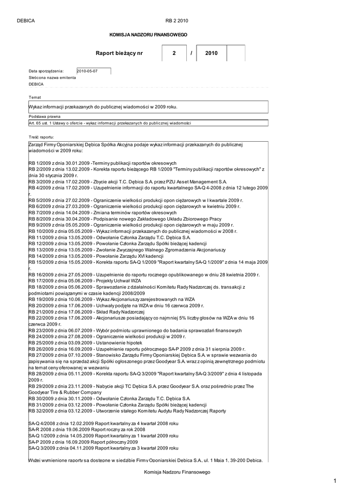 DEBICA RB 2 2010 KOMISJA NADZORU FINANSOWEGO Raport bieŜący nr Data sporządzenia: 2 / 2010 2010-05-07 Skrócona nazwa emitenta DEBICA Temat Wykaz informacji przekazanych do publicznej wiadomości w 2009 roku. Podstawa prawna Art. 65 ust. 1 Ustawy o oferc ie - wykaz informacji przekazanych do public znej wiadomości Treść raportu: Zarząd Firmy Oponiarskiej Dębica Spółka Akcyjna podaje wykaz informacji przekazanych do publicznej wiadomości w 2009 roku: RB 1/2009 z dnia 30.01.2009 -Terminy publikacji raportów okresowych RB 2/2009 z dnia 13.02.2009 - Korekta raportu bieŜącego RB 1/2009 "Terminy publikacji raportów okresowych" z dnia 30 stycznia 2009 r. RB 3/2009 z dnia 17.02.2009 - Zbycie akcji T.C. Dębica S.A. przez PZU Asset Management S.A. RB 4/2009 z dnia 17.02.2009 - Uzupełnienie informacji do raportu kwartalnego SA-Q 4-2008 z dnia 12 lutego 2009 r. RB 5/2009 z dnia 27.02.2009 - Ograniczenie wielkości produkcji opon cięŜarowych w I kwartale 2009 r. RB 6/2009 z dnia 27.03.2009 - Ograniczenie wielkości produkcji opon cięŜarowych w kwietniu 2009 r. RB 7/2009 z dnia 14.04.2009 - Zmiana terminów raportów okresowych RB 8/2009 z dnia 30.04.2009 - Podpisanie nowego Zakładowego Układu Zbiorowego Pracy RB 9/2009 z dnia 05.05.2009 - Ograniczenie wielkości produkcji opon cięŜarowych w maju 2009 r. RB 10/2009 z dnia 05.05.2009 - Wykaz informacji przekazanych do publicznej wiadomości w 2008 r. RB 11/2009 z dnia 13.05.2009 - Odwołanie Członka Zarządu T.C. Dębica S.A. RB 12/2009 z dnia 13.05.2009 - Powołanie Członka Zarządu Spółki bieŜącej kadencji RB 13/2009 z dnia 13.05.2009 - Zwołanie Zwyczajnego Walnego Zgromadzenia Akcjonariuszy RB 14/2009 z dnia 13.05.2009 - Powołanie Zarządu XVI kadencji RB 15/2009 z dnia 15.05.2009 - Korekta raportu SA-Q 1/2009 "Raport kwartalny SA-Q 1/2009" z dnia 14 maja 2009 r. RB 16/2009 z dnia 27.05.2009 - Uzupełnienie do raportu rocznego opublikowanego w dniu 28 kwietnia 2009 r. RB 17/2009 z dnia 05.06.2009 - Projekty Uchwał WZA RB 18/2009 z dnia 05.06.2009 - Sprawozdanie z działalności Komitetu Rady Nadzorczej ds. transakcji z podmiotami powiązanymi w czasie kadencji 2008/2009 RB 19/2009 z dnia 10.06.2009 - Wykaz Akcjonariuszy zarejestrowanych na WZA RB 20/2009 z dnia 17.06.2009 - Uchwały podjęte na WZA w dniu 16 czerwca 2009 r. RB 21/2009 z dnia 17.06.2009 - Skład Rady Nadzorczej RB 22/2009 z dnia 17.06.2009 - Akcjonariusze posiadający co najmniej 5% liczby głosów na WZA w dniu 16 czerwca 2009 r. RB 23/2009 z dnia 06.07.2009 - Wybór podmiotu uprawnionego do badania sprawozdań finansowych RB 24/2009 z dnia 27.08.2009 - Ograniczenie wielkości produkcji w 2009 r. RB 25/2009 z dnia 03.09.2009 - Ustanowienie hipotek RB 26/2009 z dnia 16.09.2009 - Uzupełnienie raportu półrocznego SA-P 2009 z dnia 31 sierpnia 2009 r. RB 27/2009 z dnia 07.10.2009 - Stanowisko Zarządu Firmy Oponiarskiej Dębica S.A. w sprawie wezwania do zapisywania się na sprzedaŜ akcji Spółki ogłoszonego przez Goodyear S.A. wraz z opinią zewnętrznego podmiotu na temat ceny oferowanej w wezwaniu RB 28/2009 z dnia 05.11.2009 - Korekta raportu SA-Q 3/2009 "Raport kwartalny SA-Q 3/2009" z dnia 4 listopada 2009 r. RB 29/2009 z dnia 23.11.2009 - Nabycie akcji TC Dębica S.A. przez Goodyear S.A. oraz pośrednio przez The Goodyear Tire & Rubber Company RB 30/2009 z dnia 30.11.2009 - Odwołanie Członka Zarządu T.C. Dębica S.A. RB 31/2009 z dnia 03.12.2009 - Powołanie Członka Zarządu Spółki bieŜącej kadencji RB 32/2009 z dnia 03.12.2009 - Utworzenie stałego Komitetu Audytu Rady Nadzorczej Raporty SA-Q 4/2008 z dnia 12.02.2009 Raport kwartalny za 4 kwartał 2008 roku SA-R 2008 z dnia 19.06.2009 Raport roczny za rok 2008 SA-Q 1/2009 z dnia 14.05.2009 Raport kwartalny za 1 kwartał 2009 roku SA-P 2009 z dnia 16.09.2009 Raport półroczny 2009 SA-Q 3/2009 z dnia 04.11.2009 Raport kwartalny za 3 kwartał 2009 roku WyŜej wymienione raporty są dostępne w siedzibie Firmy Oponiarskiej Dębica S.A., ul. 1 Maja 1, 39-200 Dębica. Komisja Nadzoru Finansowego 1 DEBICA RB 2 2010 WyŜej wymienione raporty są dostępne w siedzibie Firmy Oponiarskiej Dębica S.A., ul. 1 Maja 1, 39-200 Dębica. Ponadto raporty dostępne są równieŜ na stronie internetowej Spółki www.debica.com.pl z tym, Ŝe raport roczny zamieszczony jest na stronie internetowej w wersji skróconej. FIRMA OPONIARSKA DĘBICA SA (pełna nazwa emitenta) DEBICA Motoryzacyjny (mot) (skróc ona nazwa emitenta) 39-200 (sektor wg. klasyfikacji GPW w W-wie) Dębica (kod pocztowy) (miejscowość) ul. 1 Maja 1 (ulica) (numer) (014) 670-28-31 014 670-09-57 (telefon) (fax) www.debic a.com.pl (e-mail) (www) 872-000-34-04 850004505 (NIP) (REGON) PODPISY OSÓB REPREZENTUJĄCYCH SPÓŁKĘ Data Imię i Nazwisko Stanowisko/Funkc ja 2010-05-07 Jacek Pryczek Prezes Zarządu/Dyrektor Generalny 2010-05-07 Leszek Cic hocki Członek Zarządu/Dyrektor ds. Finansowyc h Podpis Komisja Nadzoru Finansowego 2