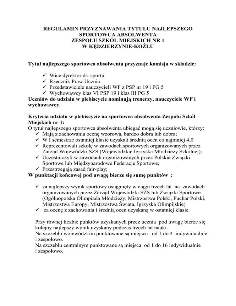 REGULAMIN PRZYZNAWANIA TYTUŁU NAJLEPSZEGO SPORTOWCA ABSOLWENTA ZESPOŁU SZKÓL MIEJSKICH NR 1 W KĘDZIERZYNIE-KOŹLU Tytuł najlepszego sportowca absolwenta przyznaje komisja w składzie: Wice dyrektor ds. sportu Rzecznik Praw Ucznia Przedstawiciele nauczycieli WF z PSP nr 19 i PG 5 Wychowawcy klas VI PSP 19 i klas III PG 5 Uczniów do udziału w plebiscycie nominują trenerzy, nauczyciele WF i wychowawcy. Kryteria udziału w plebiscycie na sportowca absolwenta Zespołu Szkól Miejskich nr 1: O tytuł najlepszego sportowca absolwenta ubiegać mogą się uczniowie, którzy: Mają z zachowania ocenę wzorowa, bardzo dobra lub dobra; W I semestrze ostatniej klasie uzyskali średnią ocen co najmniej 4,0 Reprezentowali szkołę w zawodach sportowych organizowanych przez Zarząd Wojewódzki SZS (Wojewódzkie Igrzyska Młodzieży Szkolnej); Uczestniczyli w zawodach organizowanych przez Polskie Związki Sportowe lub Międzynarodowe Federacje Sportowe; Przestrzegają zasad fair-play; W punktacji końcowej pod uwagę bierze się sumę punktów : za najlepszy wynik sportowy osiągnięty w ciągu trzech lat na zawodach organizowanych przez Zarząd Wojewódzki SZS lub Związki Sportowe (Ogólnopolska Olimpiada Młodzieży, Mistrzostwa Polski, Puchar Polski, Mistrzostwa Europy, Mistrzostwa Świata, Igrzyska Olimpijskie) za ocenę z zachowania i średnią ocen uzyskaną w ostatniej klasie Przy równej liczbie punktów uzyskanych przez ucznia pod uwagę bierze się kolejny najlepszy wynik uzyskany podczas trzech lat nauki. Na szczeblu wojewódzkim punktowane są miejsca od 1 do 4 indywidualnie i zespołowo. Na szczeblu centralnym punktowane są miejsca od 1 do 16 indywidualnie i zespołowo. Przelicznik punktowy: Zachowanie: Wzorowe – 2 pkt Bardzo dobre – 1 pkt Dobre – 0 pkt Średnia ocen za I semestr w klasie VI PSP 19 i III PG 5: 4,00-4,25 – 1 pkt 4,26-4,50 – 2 pkt 4,51-4,75 – 3 pkt 4,76-5,00 – 4 pkt 5,01-5,25 – 5 pkt 5,26-5,50 – 6 pkt 5,51-5,75 – 7 pkt 5,76-6,00 – 8 pkt Udział w zawodach sportowych na szczeblu wojewódzkim (indywidualnie i zespołowo): miejsce I – 10 pkt miejsce II – 9 pkt miejsce III – 8 pkt miejsce IV – 7 pkt Udział w zawodach sportowych na szczeblu centralnym (indywidualnie i zespołowo): miejsce I – 32 pkt miejsce II – 28 pkt miejsce III – 25 pkt miejsce IV – 22 pkt miejsce V – 21 pkt miejsce VI – 20 pkt miejsce VII – 19 pkt miejsce VIII – 18 pkt miejsce IX – 17 pkt miejsce X – 16 pkt miejsce XI – 15 pkt miejsce XII – 14 pkt miejsce XIII – 13 pkt miejsce XIV – 12 pkt miejsce XV – 11 pkt miejsce XVI – 10 pkt