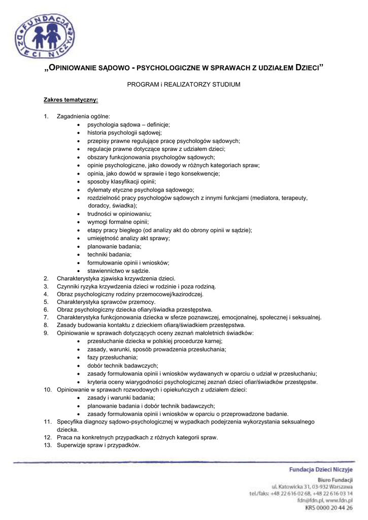 „OPINIOWANIE SĄDOWO - PSYCHOLOGICZNE W SPRAWACH Z UDZIAŁEM DZIECI” PROGRAM i REALIZATORZY STUDIUM Zakres tematyczny: 1. 2. 3. 4. 5. 6. 7. 8. 9. 10. 11. 12. 13. Zagadnienia ogólne: psychologia sądowa – definicje; historia psychologii sądowej; przepisy prawne regulujące pracę psychologów sądowych; regulacje prawne dotyczące spraw z udziałem dzieci; obszary funkcjonowania psychologów sądowych; opinie psychologiczne, jako dowody w różnych kategoriach spraw; opinia, jako dowód w sprawie i tego konsekwencje; sposoby klasyfikacji opinii; dylematy etyczne psychologa sądowego; rozdzielność pracy psychologów sądowych z innymi funkcjami (mediatora, terapeuty, doradcy, świadka); trudności w opiniowaniu; wymogi formalne opinii; etapy pracy biegłego (od analizy akt do obrony opinii w sądzie); umiejętność analizy akt sprawy; planowanie badania; techniki badania; formułowanie opinii i wniosków; stawiennictwo w sądzie. Charakterystyka zjawiska krzywdzenia dzieci. Czynniki ryzyka krzywdzenia dzieci w rodzinie i poza rodziną. Obraz psychologiczny rodziny przemocowej/kazirodczej. Charakterystyka sprawców przemocy. Obraz psychologiczny dziecka ofiary/świadka przestępstwa. Charakterystyka funkcjonowania dziecka w sferze poznawczej, emocjonalnej, społecznej i seksualnej. Zasady budowania kontaktu z dzieckiem ofiarą/świadkiem przestępstwa. Opiniowanie w sprawach dotyczących oceny zeznań małoletnich świadków: przesłuchanie dziecka w polskiej procedurze karnej; zasady, warunki, sposób prowadzenia przesłuchania; fazy przesłuchania; dobór technik badawczych; zasady formułowania opinii i wniosków wydawanych w oparciu o udział w przesłuchaniu; kryteria oceny wiarygodności psychologicznej zeznań dzieci ofiar/świadków przestępstw. Opiniowanie w sprawach rozwodowych i opiekuńczych z udziałem dzieci: zasady i warunki badania; planowanie badania i dobór technik badawczych; zasady formułowania opinii i wniosków w oparciu o przeprowadzone badanie. Specyfika diagnozy sądowo-psychologicznej w wypadkach podejrzenia wykorzystania seksualnego dziecka. Praca na konkretnych przypadkach z różnych kategorii spraw. Superwizje spraw i przypadków. PROWADZĄCY: Alicja Budzyńska - absolwentka Wydziału Psychologii Uniwersytetu Warszawskiego i podyplomowych studiów z zakresu Problemów Rodziny w Instytucie Profilaktyki Społecznej i Resocjalizacji UW. Posiada I stopień specjalizacji zawodowej w zakresie psychologii sądowej, rekomendacje Polskiego Towarzystwa Psychologicznego w zakresie diagnozy dla potrzeb orzecznictwa sądowego spraw rodzinnych i nieletnich, oceny zeznań świadków oraz certyfikat PARPA specjalisty d/s przeciwdziałania przemocy w rodzinie. Przez okres kilku kadencji biegły sądowy z zakresu psychologii Sądu Okręgowego w Warszawie. Zajmuje się diagnozą i terapią dzieci krzywdzonych i ich opiekunów oraz szkoleniem profesjonalistów w zakresie powyższej problematyki. Jest koordynatorem Centrum Pomocy Dzieciom „Mazowiecka”. Wcześniej wieloletni pracownik ROD-K w Warszawie. Jest autorką wielu publikacji związanych z diagnozą i interwencją na rzecz dziecka krzywdzonego (m.in. „Poradnik jak przesłuchiwać dziecko”, „Diagnoza dziecka wykorzystywanego seksualnie”). Koordynuje Studium. Magdalena Zawadzka - absolwentka Wydziału Psychologii Uniwersytetu Warszawskiego. Posiada certyfikat Towarzystwa Psychoprofilaktycznego w zakresie profilaktyki uzależnień oraz certyfikat specjalisty Instytutu Psychologii Zdrowia PTP w zakresie pomocy ofiarom przemocy w rodzinie. Pracuje w Centrum Pomocy Dzieciom „Mazowiecka” Fundacji Dzieci Niczyje z dziećmi krzywdzonymi (diagnoza, terapia, interwencja). Opiniuje w sprawach karnych i rodzinnych, prowadzi szkolenia różnych grup profesjonalistów w zakresie problematyki dziecka krzywdzonego. Koordynuje działającym przy Fundacji Dzieci Niczyje ogólnopolskim Klubem Biegłego Psychologa. Koordynuje Studium. Maria Gordon - doktor nauk humanistycznych w zakresie psychologii; w przeszłości była psychologiem penitencjarnym, obecnie pracuje w oddziale psychiatrii sądowej Szpitala Aresztu Śledczego w Warszawie; biegły sądowy rekomendowany przez PTP; ponadto prowadzi seminarium magisterskie „Psychologia w procesie karnym” w Szkole Wyższej Psychologii Społecznej, jest także wykładowcą psychologii sądowej i penitencjarnej na kursach zawodowych i studiach podyplomowych oraz opublikowała kilkadziesiąt artykułów w czasopismach naukowych i pracach monograficznych poświęconych problematyce penitencjarnej i sądowej. Teresa Jaśkiewicz-Obydzińska - psycholog, biegły sądowy z Zakładu Psychologii Sądowej Instytutu Ekspertyz Sądowych w Krakowie. Wykładowca Centrum Edukacyjnego Nauk Sądowych, organizującego szkolenia m.in. z zakresu psychologii sądowej. Autorka i współautorka kilkudziesięciu publikacji z zakresu psychologii sądowej oraz artykułów dotyczących problematyki zeznań ofiar wykorzystywania seksualnego. Maria Keller-Hamela - psycholog, dyrektor ds. współpracy zagranicznej Fundacji Dzieci Niczyje, pracuje w Fundacji od 1996 roku. Zastępca redaktora naczelnego kwartalnika „Dziecko Krzywdzone. Teoria, badania, praktyka”. Koordynator programu "Dzieciństwo bez krzywdzenia - ku lepszemu systemowi ochrony dzieci w Europie Środkowo-Wschodniej". Ekspert Międzynarodowego Stowarzyszenia na rzecz Przeciwdziałania Krzywdzeniu i Zaniedbywaniu Dzieci (ISPCAN). Małgorzata Toeplitz-Winiewska – doktor psychologii, wieloletni pracownik Wydziału Psychologii Uniwersytetu Warszawskiego, przewodnicząca Polskiego Towarzystwa Psychologicznego. Prowadzi zajęcia dydaktyczne z psychologii sądowej, z problematyki agresji, a także etycznych problemów wykonywania zawodu psychologa. Kieruje studiami podyplomowymi z psychologii sądowej organizowanymi przez Wydział Psychologii UW. Na innych kierunkach studiów podyplomowych prowadzi zajęcia dotyczące przede wszystkim 