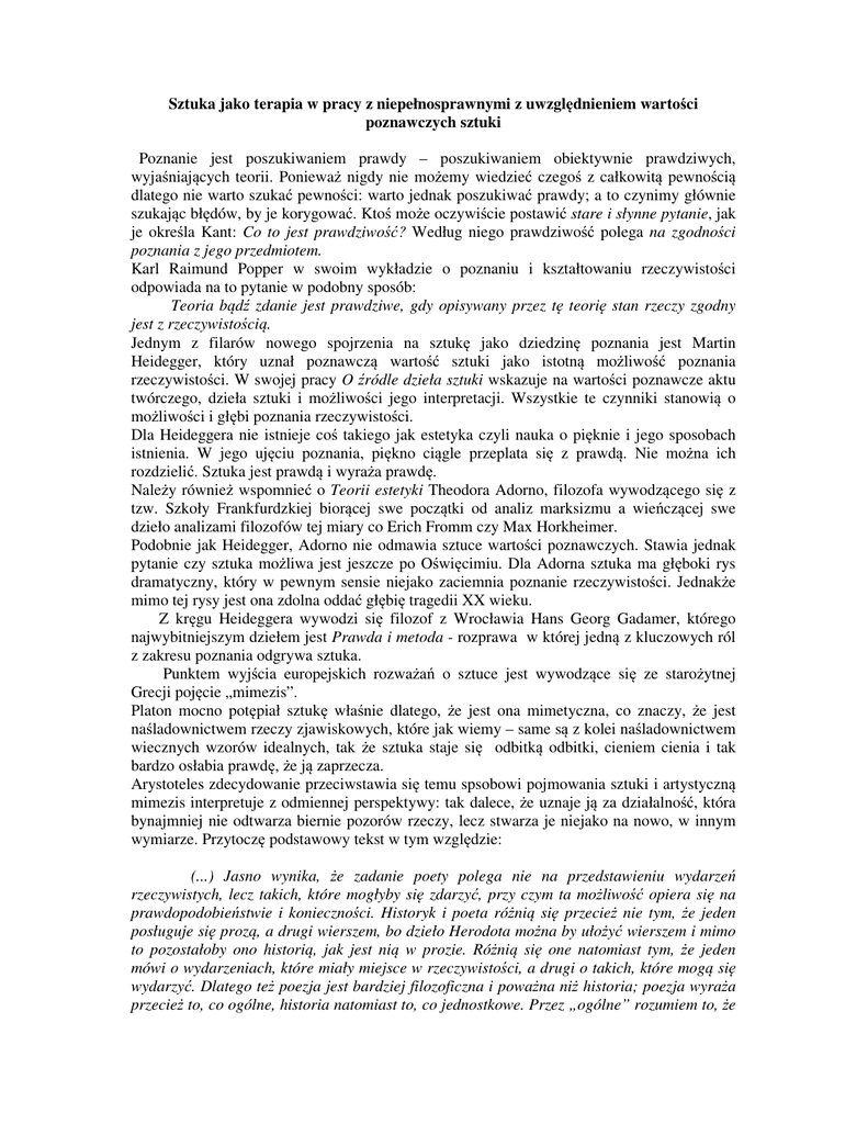 Sztuka jako terapia w pracy z niepełnosprawnymi z uwzględnieniem wartości poznawczych sztuki Poznanie jest poszukiwaniem prawdy – poszukiwaniem obiektywnie prawdziwych, wyjaśniających teorii. Ponieważ nigdy nie możemy wiedzieć czegoś z całkowitą pewnością dlatego nie warto szukać pewności: warto jednak poszukiwać prawdy; a to czynimy głównie szukając błędów, by je korygować. Ktoś może oczywiście postawić stare i słynne pytanie, jak je określa Kant: Co to jest prawdziwość? Według niego prawdziwość polega na zgodności poznania z jego przedmiotem. Karl Raimund Popper w swoim wykładzie o poznaniu i kształtowaniu rzeczywistości odpowiada na to pytanie w podobny sposób: Teoria bądź zdanie jest prawdziwe, gdy opisywany przez tę teorię stan rzeczy zgodny jest z rzeczywistością. Jednym z filarów nowego spojrzenia na sztukę jako dziedzinę poznania jest Martin Heidegger, który uznał poznawczą wartość sztuki jako istotną możliwość poznania rzeczywistości. W swojej pracy O źródle dzieła sztuki wskazuje na wartości poznawcze aktu twórczego, dzieła sztuki i możliwości jego interpretacji. Wszystkie te czynniki stanowią o możliwości i głębi poznania rzeczywistości. Dla Heideggera nie istnieje coś takiego jak estetyka czyli nauka o pięknie i jego sposobach istnienia. W jego ujęciu poznania, piękno ciągle przeplata się z prawdą. Nie można ich rozdzielić. Sztuka jest prawdą i wyraża prawdę. Należy również wspomnieć o Teorii estetyki Theodora Adorno, filozofa wywodzącego się z tzw. Szkoły Frankfurdzkiej biorącej swe początki od analiz marksizmu a wieńczącej swe dzieło analizami filozofów tej miary co Erich Fromm czy Max Horkheimer. Podobnie jak Heidegger, Adorno nie odmawia sztuce wartości poznawczych. Stawia jednak pytanie czy sztuka możliwa jest jeszcze po Oświęcimiu. Dla Adorna sztuka ma głęboki rys dramatyczny, który w pewnym sensie niejako zaciemnia poznanie rzeczywistości. Jednakże mimo tej rysy jest ona zdolna oddać głębię tragedii XX wieku. Z kręgu Heideggera wywodzi się filozof z Wrocławia Hans Georg Gadamer, którego najwybitniejszym dziełem jest Prawda i metoda - rozprawa w której jedną z kluczowych ról z zakresu poznania odgrywa sztuka. Punktem wyjścia europejskich rozważań o sztuce jest wywodzące się ze starożytnej Grecji pojęcie „mimezis”. Platon mocno potępiał sztukę właśnie dlatego, że jest ona mimetyczna, co znaczy, że jest naśladownictwem rzeczy zjawiskowych, które jak wiemy – same są z kolei naśladownictwem wiecznych wzorów idealnych, tak że sztuka staje się odbitką odbitki, cieniem cienia i tak bardzo osłabia prawdę, że ją zaprzecza. Arystoteles zdecydowanie przeciwstawia się temu spsobowi pojmowania sztuki i artystyczną mimezis interpretuje z odmiennej perspektywy: tak dalece, że uznaje ją za działalność, która bynajmniej nie odtwarza biernie pozorów rzeczy, lecz stwarza je niejako na nowo, w innym wymiarze. Przytoczę podstawowy tekst w tym względzie: (...) Jasno wynika, że zadanie poety polega nie na przedstawieniu wydarzeń rzeczywistych, lecz takich, które mogłyby się zdarzyć, przy czym ta możliwość opiera się na prawdopodobieństwie i konieczności. Historyk i poeta różnią się przecież nie tym, że jeden posługuje się prozą, a drugi wierszem, bo dzieło Herodota można by ułożyć wierszem i mimo to pozostałoby ono historią, jak jest nią w prozie. Różnią się one natomiast tym, że jeden mówi o wydarzeniach, które miały miejsce w rzeczywistości, a drugi o takich, które mogą się wydarzyć. Dlatego też poezja jest bardziej filozoficzna i poważna niż historia; poezja wyraża przecież to, co ogólne, historia natomiast to, co jednostkowe. Przez „ogólne” rozumiem to, że jakaś postać będzie coś takiego mówić i czynić, co jest zgodne z prawdopodobieństwem lub z koniecznością, do czego właśnie dąży poezja, która dopiero później nadaje imiona bohaterom. Jednostkowym jest natomiast to, czego na przykład dokonał Alcybiades. Starożytne pojęcie mimezis można współcześnie wyrazić refleksją Andre Malraux, który powiedział, że artysta nie jest opisywaczem świata, jest jego rywalem. Zatem każda kreatywna jednostka będąca wtopiona w rzeczywistość, w którą wkracza wraz ze swoimi narodzinami stwarza ją na swój obraz i podobieństwo wzbogacając tym samym nieskończoną różnorodność obrazów świata. Jan Kuraciński, wybitny rzeźbiarz polski, tworzący w Nowym Jorku ogłosił swego rodzaju manifest na temat Era-Art, z którą czuje się związany. Dobitnie ukazuje ona wartość indywidualnych, twórczych działań chroniących jednostkę od popadania w tryby narzuconych norm społecznych, które na przykład jeszcze do niedawna spychały na margines osoby niepełnosprawne: Czas naszej epoki jest najbardziej inspirujący i najbardziej destrukcyjny. Inspirujący, bo żadna inna miniona epoka nie miała tylu artystów na całym świecie, co ma teraz jedno państwo. Destruktywny, poprzez niespotykaną w dziejach historii sztuki konkurencję. Z wielotysięcznej masy artystów tylko paru czuje się i znajduje w czołówce naszej Ery – tych nazywa się geniuszami. Przykładem niezwykłego geniuszu był Pablo Picasso. Przez cały długoletni żywot nigdy nie zgubił czoła czasu. W Ameryce sztuka jest relaksem, co wyzwala kreatywne impulsy i służy wyzwoleniu świadomości, ponieważ to jest to, czego współczesne amerykańskie życie wymaga. Ja chcę sławić tę epokę poprzez kreowanie wolnych, biologicznych struktur – moja praca jest przykładem siły męskości i kobiecości jako zasadniczych elementów Życia - Konfrontacji Akcji i Historii. Zatem żaden szanujący się filozof nie przejdzie obojętnie nad współczesnym zjawiskiem wielości proponowanych pomysłów, projektów i prób uporania się z licznymi problemami. Musi zająć stanowisko wobec dziej
