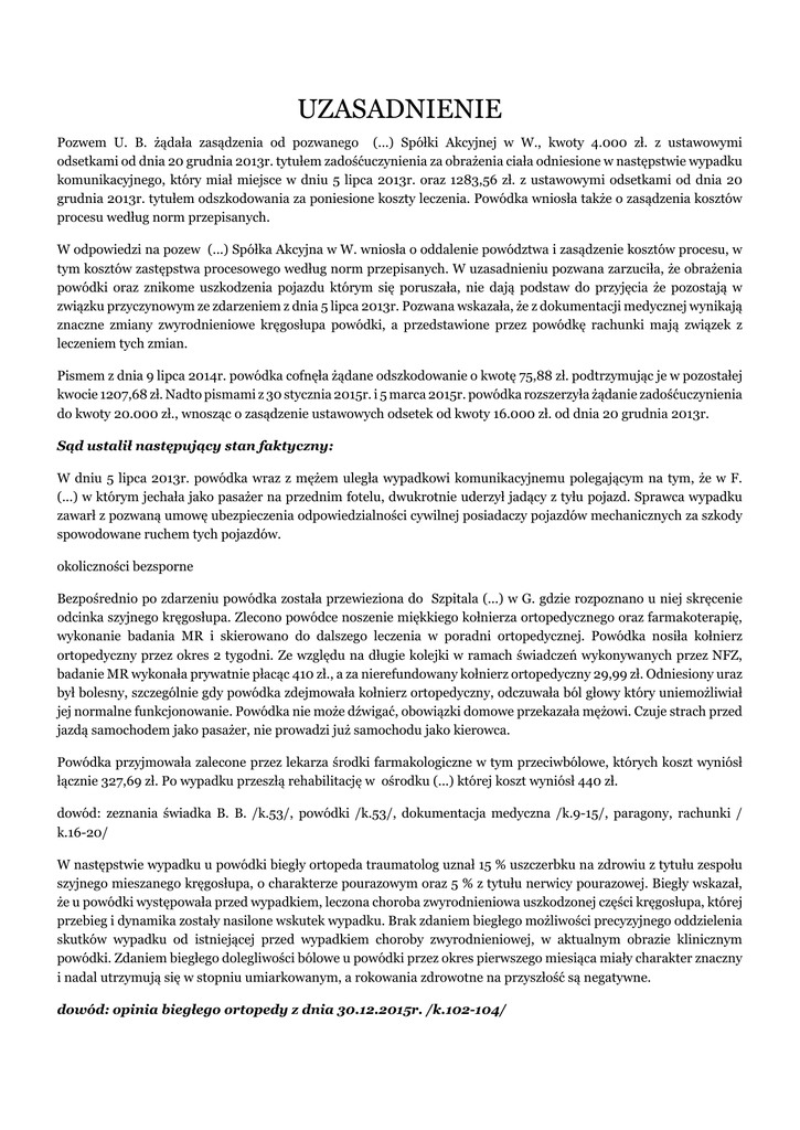 UZASADNIENIE Pozwem U. B. żądała zasądzenia od pozwanego (...) Spółki Akcyjnej w W., kwoty 4.000 zł. z ustawowymi odsetkami od dnia 20 grudnia 2013r. tytułem zadośćuczynienia za obrażenia ciała odniesione w następstwie wypadku komunikacyjnego, który miał miejsce w dniu 5 lipca 2013r. oraz 1283,56 zł. z ustawowymi odsetkami od dnia 20 grudnia 2013r. tytułem odszkodowania za poniesione koszty leczenia. Powódka wniosła także o zasądzenia kosztów procesu według norm przepisanych. W odpowiedzi na pozew (...) Spółka Akcyjna w W. wniosła o oddalenie powództwa i zasądzenie kosztów procesu, w tym kosztów zastępstwa procesowego według norm przepisanych. W uzasadnieniu pozwana zarzuciła, że obrażenia powódki oraz znikome uszkodzenia pojazdu którym się poruszała, nie dają podstaw do przyjęcia że pozostają w związku przyczynowym ze zdarzeniem z dnia 5 lipca 2013r. Pozwana wskazała, że z dokumentacji medycznej wynikają znaczne zmiany zwyrodnieniowe kręgosłupa powódki, a przedstawione przez powódkę rachunki mają związek z leczeniem tych zmian. Pismem z dnia 9 lipca 2014r. powódka cofnęła żądane odszkodowanie o kwotę 75,88 zł. podtrzymując je w pozostałej kwocie 1207,68 zł. Nadto pismami z 30 stycznia 2015r. i 5 marca 2015r. powódka rozszerzyła żądanie zadośćuczynienia do kwoty 20.000 zł., wnosząc o zasądzenie ustawowych odsetek od kwoty 16.000 zł. od dnia 20 grudnia 2013r. Sąd ustalił następujący stan faktyczny: W dniu 5 lipca 2013r. powódka wraz z mężem uległa wypadkowi komunikacyjnemu polegającym na tym, że w F. (...) w którym jechała jako pasażer na przednim fotelu, dwukrotnie uderzył jadący z tyłu pojazd. Sprawca wypadku zawarł z pozwaną umowę ubezpieczenia odpowiedzialności cywilnej posiadaczy pojazdów mechanicznych za szkody spowodowane ruchem tych pojazdów. okoliczności bezsporne Bezpośrednio po zdarzeniu powódka została przewieziona do Szpitala (...) w G. gdzie rozpoznano u niej skręcenie odcinka szyjnego kręgosłupa. Zlecono powódce noszenie miękkiego kołnierza ortopedycznego oraz farmakoterapię, wykonanie badania MR i skierowano do dalszego leczenia w poradni ortopedycznej. Powódka nosiła kołnierz ortopedyczny przez okres 2 tygodni. Ze względu na długie kolejki w ramach świadczeń wykonywanych przez NFZ, badanie MR wykonała prywatnie płacąc 410 zł., a za nierefundowany kołnierz ortopedyczny 29,99 zł. Odniesiony uraz był bolesny, szczególnie gdy powódka zdejmowała kołnierz ortopedyczny, odczuwała ból głowy który uniemożliwiał jej normalne funkcjonowanie. Powódka nie może dźwigać, obowiązki domowe przekazała mężowi. Czuje strach przed jazdą samochodem jako pasażer, nie prowadzi już samochodu jako kierowca. Powódka przyjmowała zalecone przez lekarza środki farmakologiczne w tym przeciwbólowe, których koszt wyniósł łącznie 327,69 zł. Po wypadku przeszłą rehabilitację w ośrodku (...) której koszt wyniósł 440 zł. dowód: zeznania świadka B. B. /k.53/, powódki /k.53/, dokumentacja medyczna /k.9-15/, paragony, rachunki / k.16-20/ W następstwie wypadku u powódki biegły ortopeda traumatolog uznał 15 % uszczerbku na zdrowiu z tytułu zespołu szyjnego mieszanego kręgosłupa, o charakterze pourazowym oraz 5 % z tytułu nerwicy pourazowej. Biegły wskazał, że u powódki występowała przed wypadkiem, leczona choroba zwyrodnieniowa uszkodzonej części kręgosłupa, której przebieg i dynamika zostały nasilone wskutek wypadku. Brak zdaniem biegłego możliwości precyzyjnego oddzielenia skutków wypadku od istniejącej przed wypadkiem choroby zwyrodnieniowej, w aktualnym obrazie klinicznym powódki. Zdaniem biegłego dolegliwości bólowe u powódki przez okres pierwszego miesiąca miały charakter znaczny i nadal utrzymują się w stopniu umiarkowanym, a rokowania zdrowotne na przyszłość są negatywne. dowód: opinia biegłego ortopedy z dnia 30.12.2015r. /k.102-104/ Ustalając stan faktyczny sprawy, Sąd oddalił wniosek dowodowy z uzupełniającej opinii biegłego, złożony przez pozwanego, bowiem opinia podstawowa, w zakresie dotyczącym urazu kręgosłupa powódki - uzupełnienia nie wymagała. Biegły jednoznacznie wskazał, że w obecnym obrazie klinicznym powódki, nie ma możliwości oddzielenia skutków wypadku od istniejącej przed wypadkiem choroby zwyrodnieniowej. Jednocześnie wyczerpująco wytłumaczył, dlaczego wobec tego nie pomniejszył ustalonego uszczerbku na 15%. Sąd nie uznał także za trafnych argumentów pozwanej, jakoby rozpoznany przez biegłego 5% uszczerbek z tytułu nerwicy pourazowej został jedynie w oparciu o „niepotwierdzone skargi subiektywne”. Wszak proces diagnozowania opiera się m.in. na tzw. wywiadzie medycznym, który z istoty rzeczy takie skargi zawiera. Powódka zeznając przed Sądem również wskazała, że po wypadku nie prowadzi samochodu i czuje strach przed jazdą jako pasażer. Słusznie zatem biegły o specjalizacji także z traumatologii, zaliczył skargi powódki zebrane w wywiadzie w postaci : niemożności prowadzenia samochodu, nerwowości, nadmiernej potliwości, „bojaźni o wypadek” (k.104v.) jako następstwo przedmiotowego zdarzenia w sferze zdrowia psychicznego powódki. Wbrew stanowisku pozwanej, skargi takie nie muszą być potwierdzone dokumentacją medyczną, gdyż powódka mogła nie poszukiwać po wypadku pomocy odpowiedniego specjalisty. Jednakże w świetle okoliczności sprawy, zeznań powódki w tym zakresie, które Sąd uznał za wiarygodne, opinie biegłego sądowego należało uznać za trafną. Sąd zważył, co następuje: Powództwo w znacznej części należało uznać, za uzasadnione. Zdaniem Sądu pozwany ponosił odpowiedzialność za przedmiotową szkodę na zasadzie art. 822 §1 k.c. w związku z art. 34 ust 1 ustawy z dnia 22 maja 2003r. o ubezpieczeniach obowiązkowych (...) / Dz. U nr 124, poz. 1152 ze zm.). Z wskazanych przepisów wynika jedno