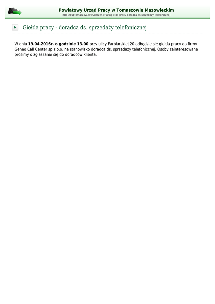 Powiatowy Urząd Pracy w Tomaszowie Mazowieckim http://puptomaszow.pl/wydarzenie/103/gielda-pracy-doradca-ds-sprzedaży-telefonicznej Giełda pracy - doradca ds. sprzedaży telefonicznej W dniu 19.04.2016r. o godzinie 13.00 przy ulicy Farbiarskiej 20 odbędzie się giełda pracy do firmy Geneo Call Center sp z o.o. na stanowisko doradca ds. sprzedaży telefonicznej. Osoby zainteresowane prosimy o zgłaszanie się do doradców klienta.